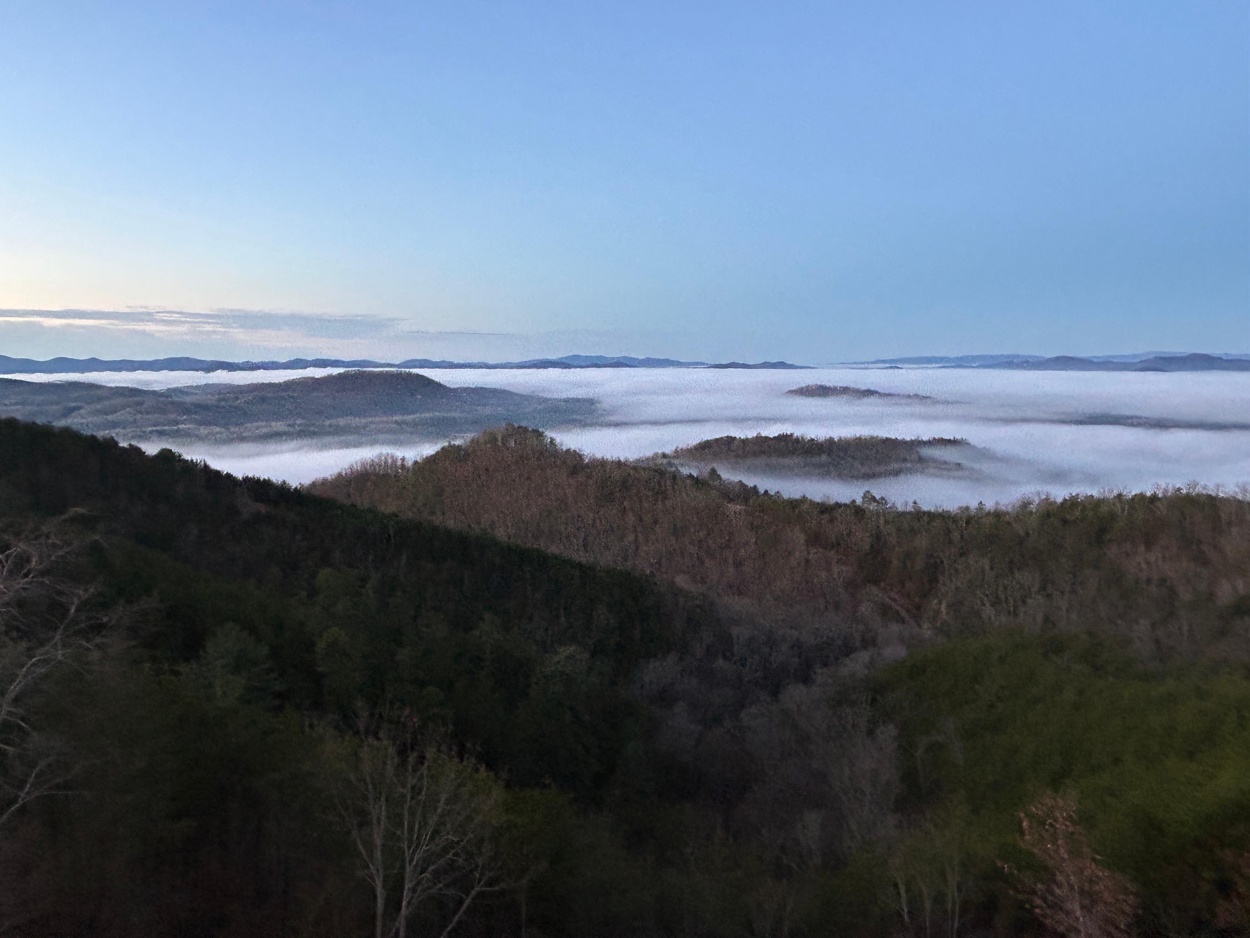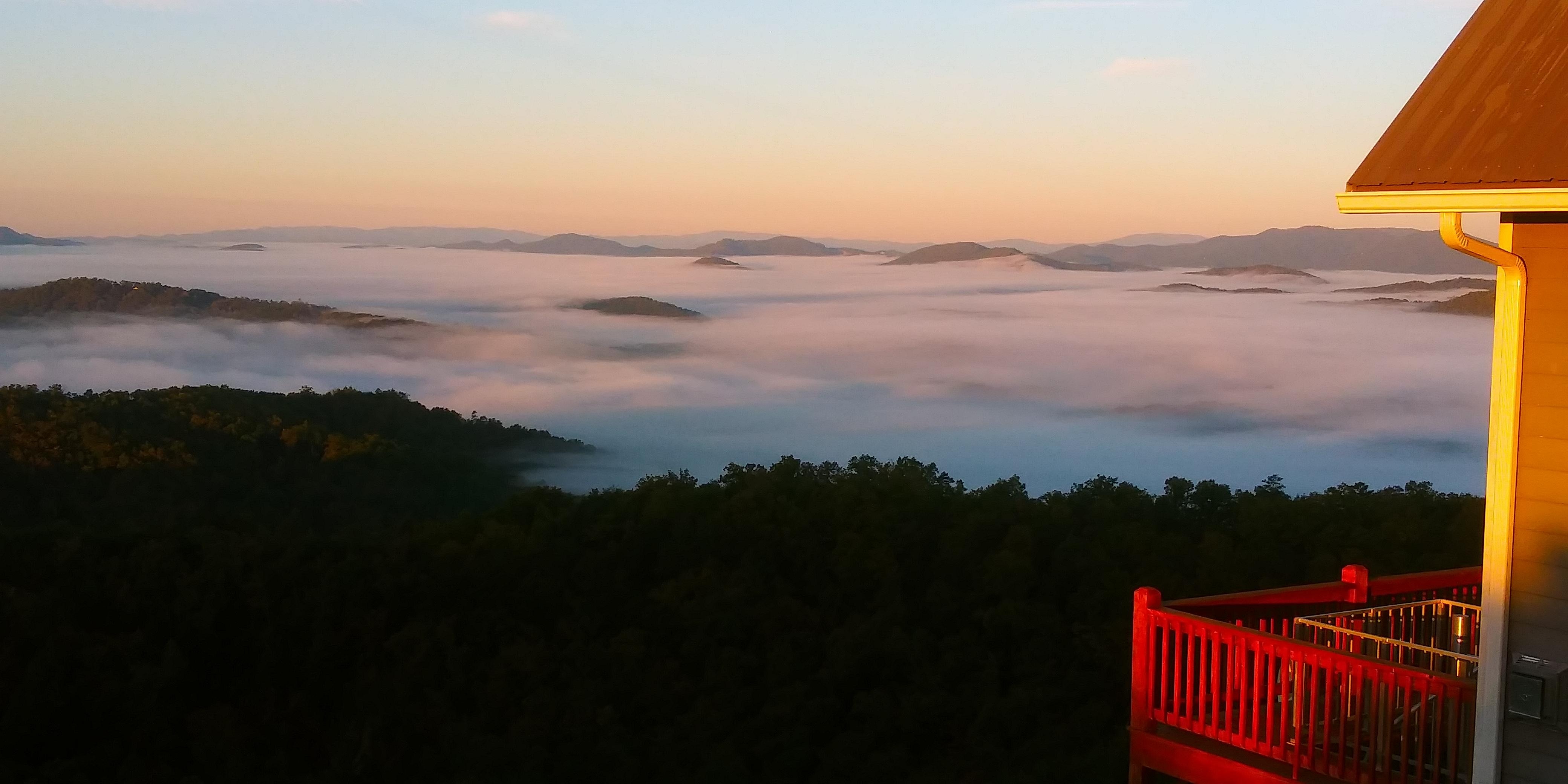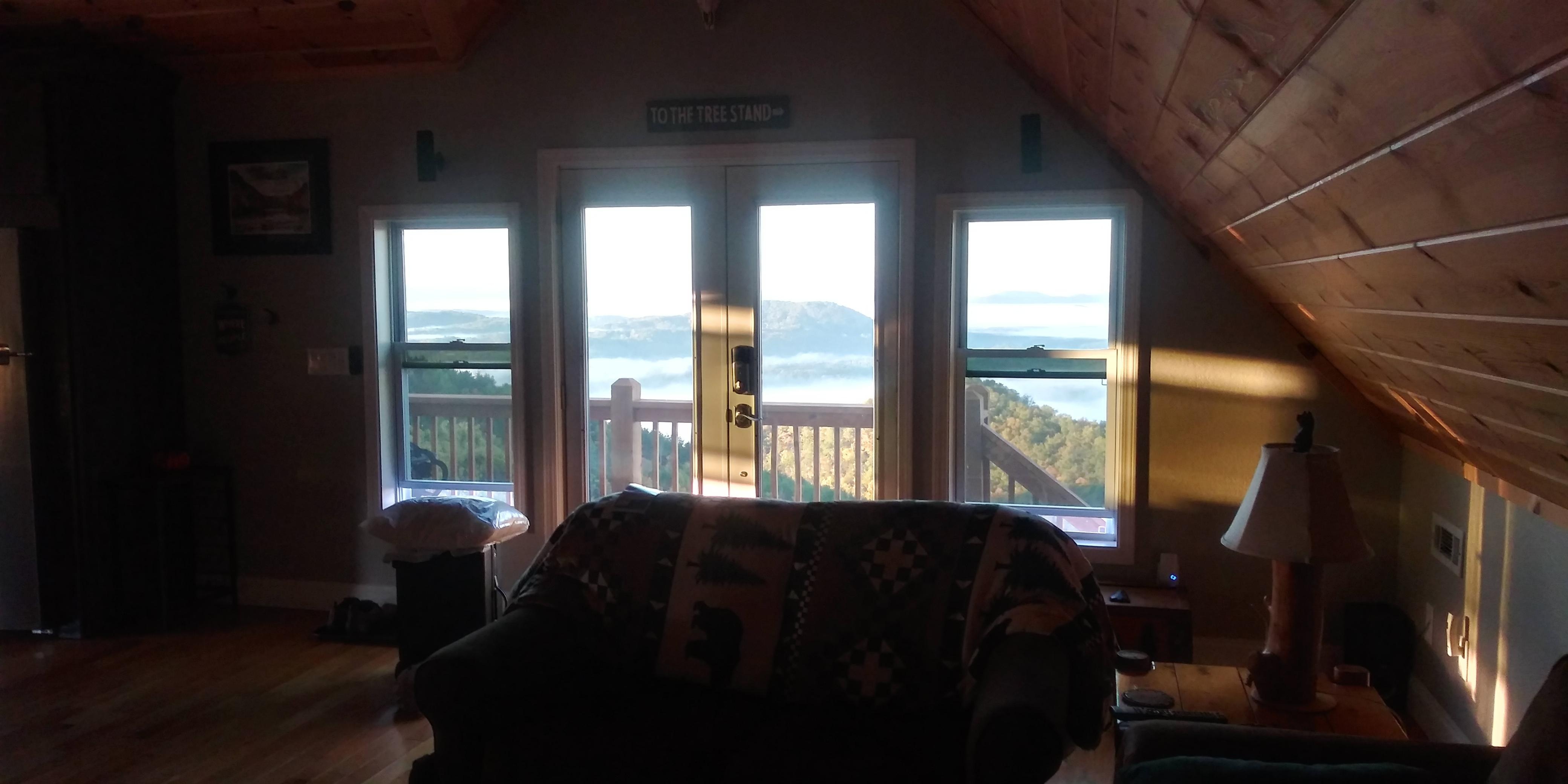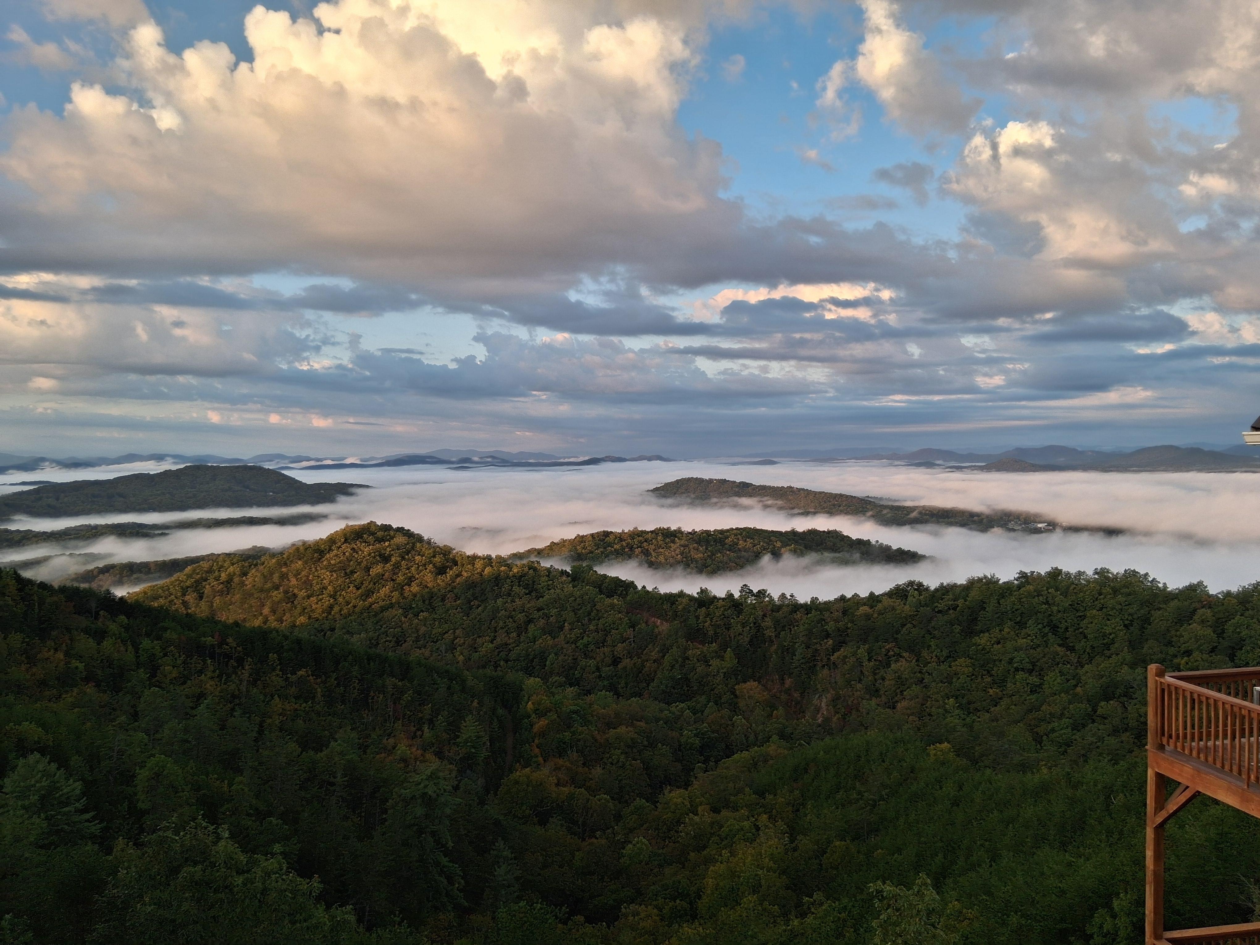 From the rear deck, it has a spectacular 165° view East to West. Seeing over 3 states (GA, NC, TN) is just the beginning. Sunrises and sunsets are totally amazing. Inside is a bit rustic yet has elegant touches. It's not heaven, but you can see it from here.
