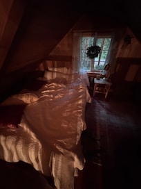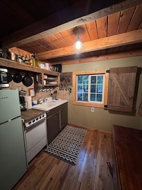 The main floor offers a cozy twin bunk bed setup and a full bathroom w/ bathtub & shower. The upper floor loft offers a very comfy queen bed and storage/closet. Electric wall heater and wood-burning stove for heat. Fully-equipped kitchen* w/ BRAND NEW Frigidaire refrigerator and plenty of seating for everyone!