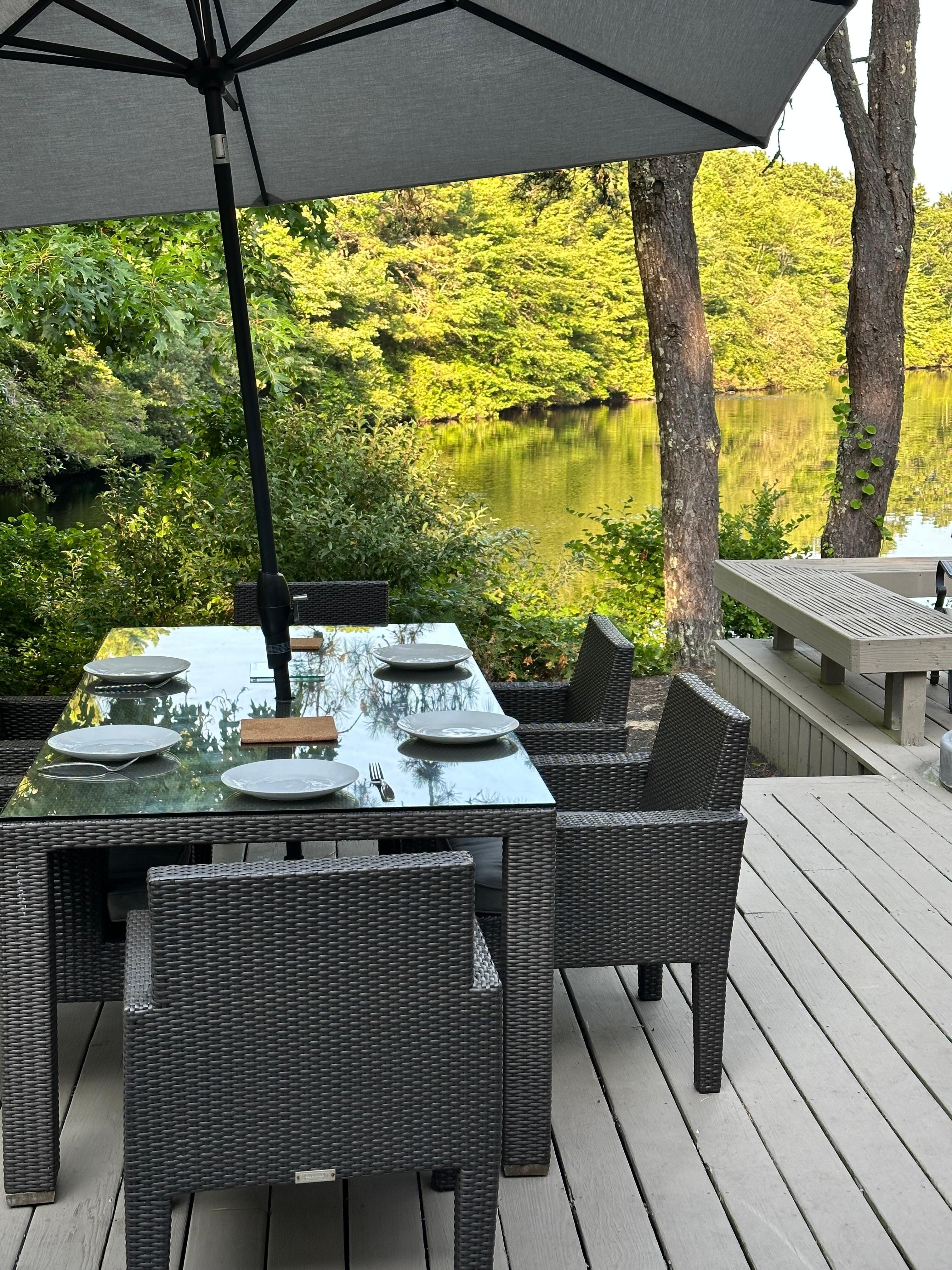 Unique & charming Pond front home within the seaside resort of New Seabury! Popponesset Market Place (Poppy Place) is a pleasant 0.5 mile walk away, with entertainment including dining, shopping, mini-golf, and free summer concerts. An easy drive to the closest public beach of South Cape Beach, 3 miles away. Enjoy your morning coffee overlooking the picturesque Frog's Pond from the living room with cathedral ceilings, or while sitting on the expansive outdoor deck. In the evening, relax by a fire pit that overlooks the front of the pond. Kitchen renovated in 2016 with granite countertops, gas stove, dishwasher, refrigerator and wine refrigerator. First level contains the primary bedroom with king bed, smart TV, walk in closet, and full bathroom, and in a separate wing, there are two guest bedrooms (one with queen; one with two twins) each with direct outdoor access to a separate patio, and another full bath. Second level presents additional living area with couches and a third flat screen TV. Grill and kayaks provided. NO SMOKING. NO PETS. NO PARTIES. AGE 28+ to rent.