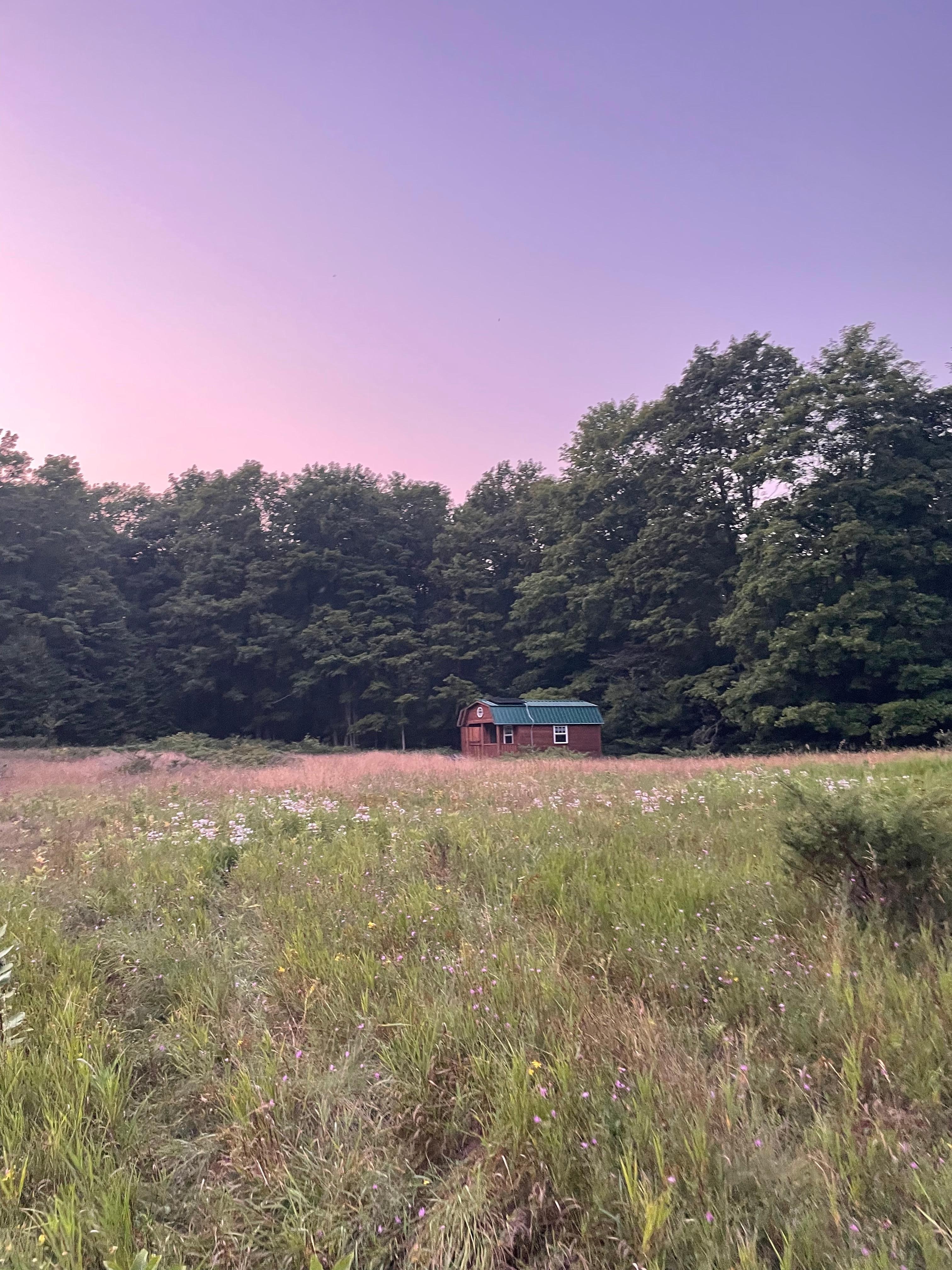 As a private alternative to our main Cedar Lodge, our Amish-Built Solar Cabin provides an enchanting "glamping" experience in the heart of Tara's Meadow's beautiful Dark Sky Butterfly Meadow. Located at the edge of our 30 acre Forest and Meadow preserve, the cabin has a luxury full size bed as well as a loft space that sleeps 1-2 people. The cabin features solar lighting and only the sounds of nature, and is supplied with delicious fresh well-water hauled out to the site. Guests use a porto-potty nearby, with full use our bathroom and shower facilities during the day up at the main house a 5 minute walk away.