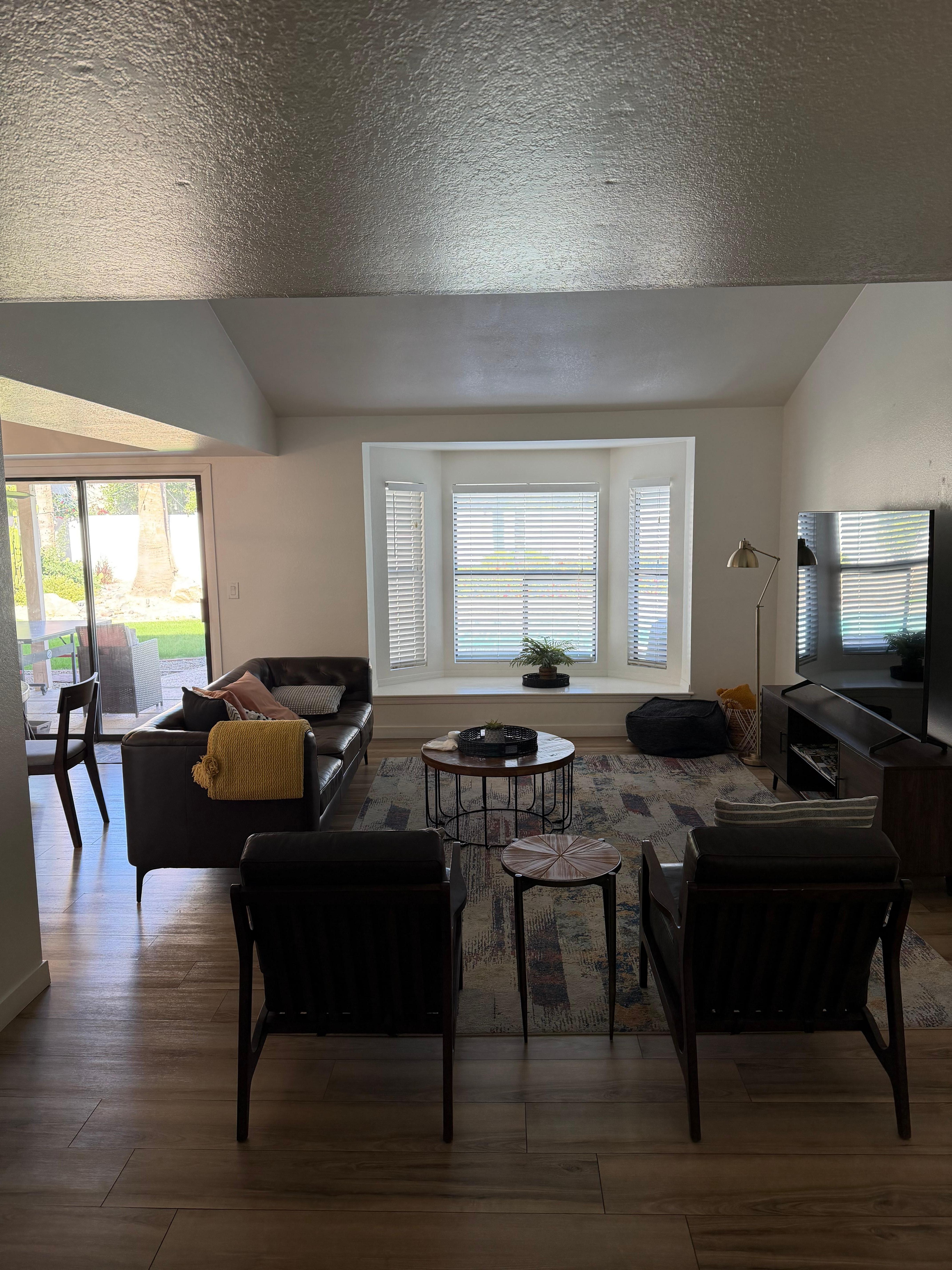 Step inside to a contemporary home with a comfy open concept living and dining room. The living room has seating for everyone including a window seat looking out to the backyard oasis. Catch a movie or sporting event on your big screen Smartv. The dining room seats 8 in the round and makes for a great conversation table. The remodeled kitchen has ample storage and everything you would ever need to prepare a meal or a BBQ. Just off the kitchen is the game room complete with a pool table and big screen Smartv. Gather for fun day or night.