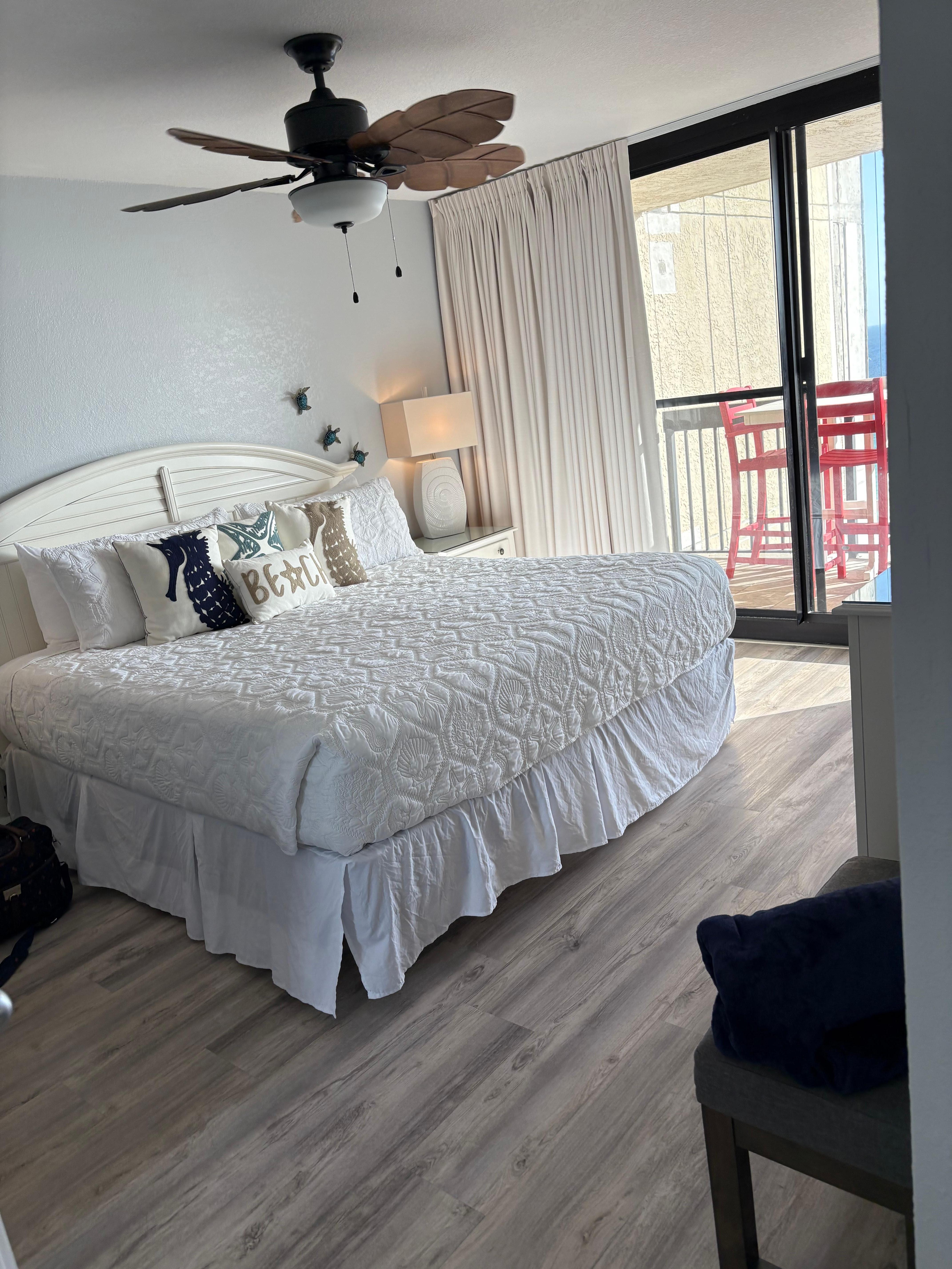 The condo pictured is our 16th floor incredible gulf and and city view from our living room and every room in the condo. Freshly updated with a new suite of stainless steel kitchen appliances, new luxury vinyl plank flooring in the master bedroom, renovated shower with glass doors, additional new furniture and a 65" Smart TV in the living room in November 2022. The balcony has a walkout from both the bedroom and the living room. This is the more spacious 1 bedroom unit in the complex that does not have the AC unit on the balcony so all you hear is the waves breaking on the shore. It features a king size bed along with floor to ceiling sliding glass doors connecting to the balcony, overlooking the west gulf view of miles of beautiful beach, the City of Destin, Destin Harbor, Crab Island, and the Destin bridge.