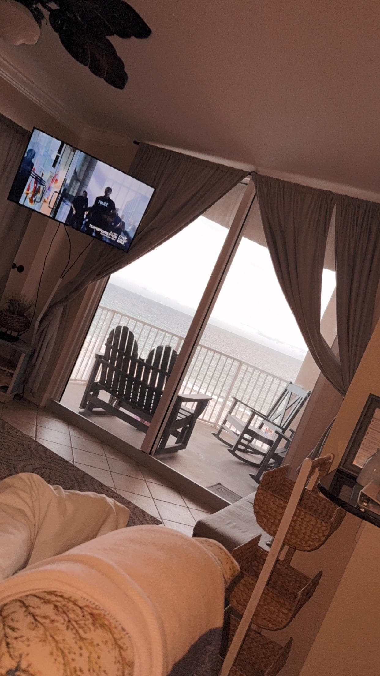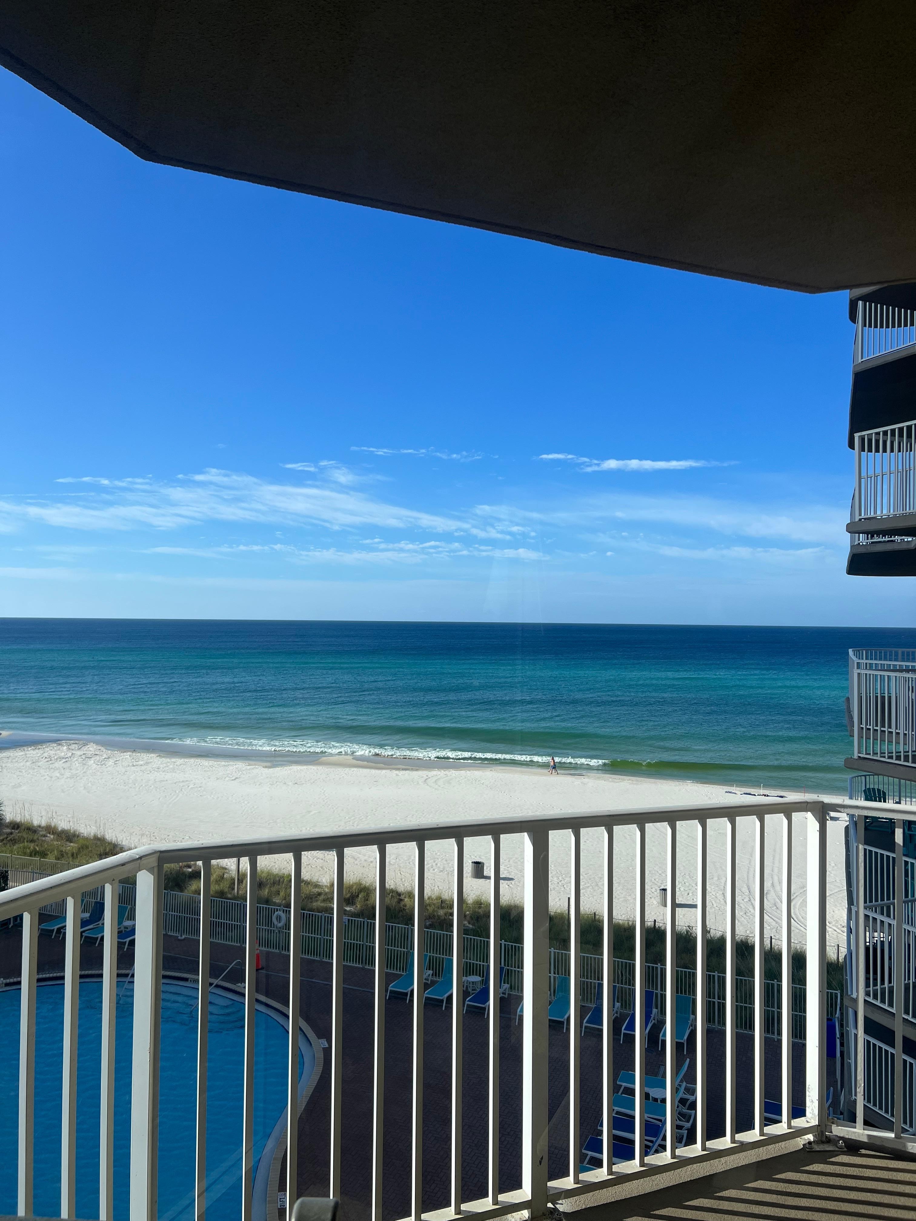 This beautifully decorated unit is located on the third floor with its own private hallway – meaning no noise from other guests walking by your room. This unit accommodates up to 4 adults & 2 children featuring a King-sized bed in the Master bedroom, a sleeper sofa in the living room, and a separate bunk bed area. There is also a pack-n-play stored away for those traveling with an infant. This unique layout provides an abundance of natural light that you won’t find in standard units! As you walk into the living space you will be amazed by the floor to ceiling windows that engulf you in incredible oceanfront views all around. The balcony overlooks the pool & provides a relaxing place to enjoy your morning coffee watching the sunrise over the gulf or watching the fireworks that often light up the sky from the pier at night. The kitchen is fully stocked with everything you will need to enjoy your stay – Keurig & regular style coffee pot, blender, cookware & utensils, etc. There is a large dining area just off the kitchen & plenty of storage space throughout the unit. There are games & books in the unit for guests to enjoy. Beach chairs, a beach wagon, an umbrella, cooler, & beach toys are provided in the unit for guests to use. The unit also includes a washer & dryer & free wifi.