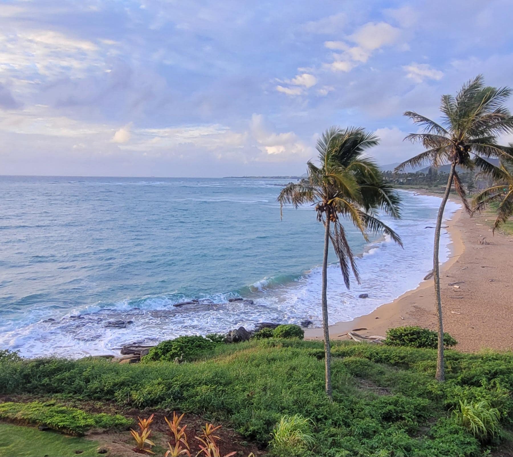 Located on a small bluff overlooking the expansive white sand beaches of Wailua Bay, this 1-bedroom, 1-bathroom Wailua Bay view condo rental is truly a haven tucked along the sea. Strolls on the beach, colorful sunrises and romantic moon rises over the ocean are right on your front doorstep from Wailua Bay 305. With a large grove of towering palm trees hemmed up against the building on one side, the ocean in front, and the mountains behind, this unit is surrounded by natural beauty.