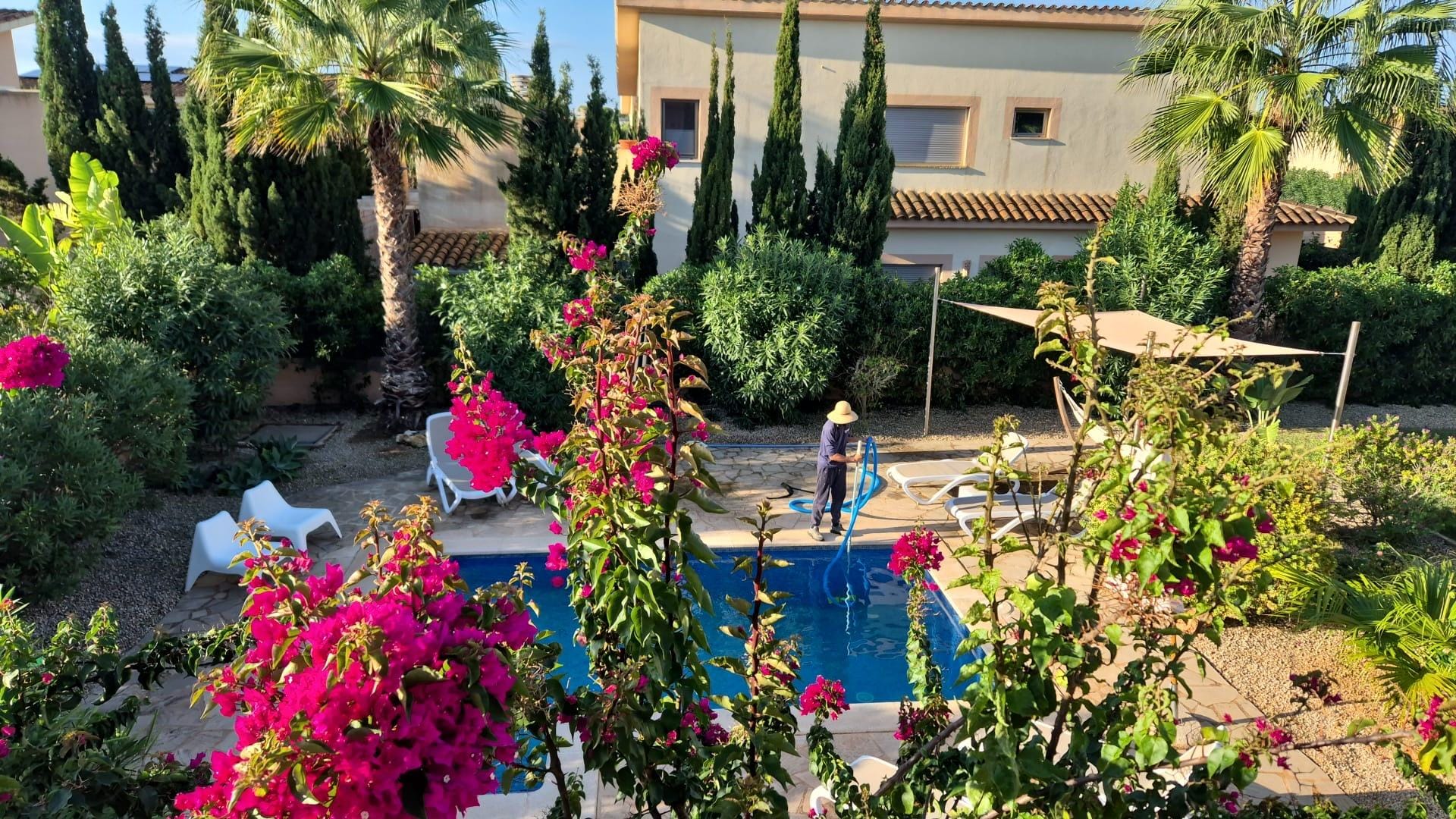 The fully fenced plot is 820m2 in size and has a wonderful garden with private pool 6x4 m, with Roman steps. The covered terrace offers you a 2.40m dining table with 8 wicker chairs and an outdoor kitchen with gas grill and sink. In the beautiful garden you can relax by the pool.