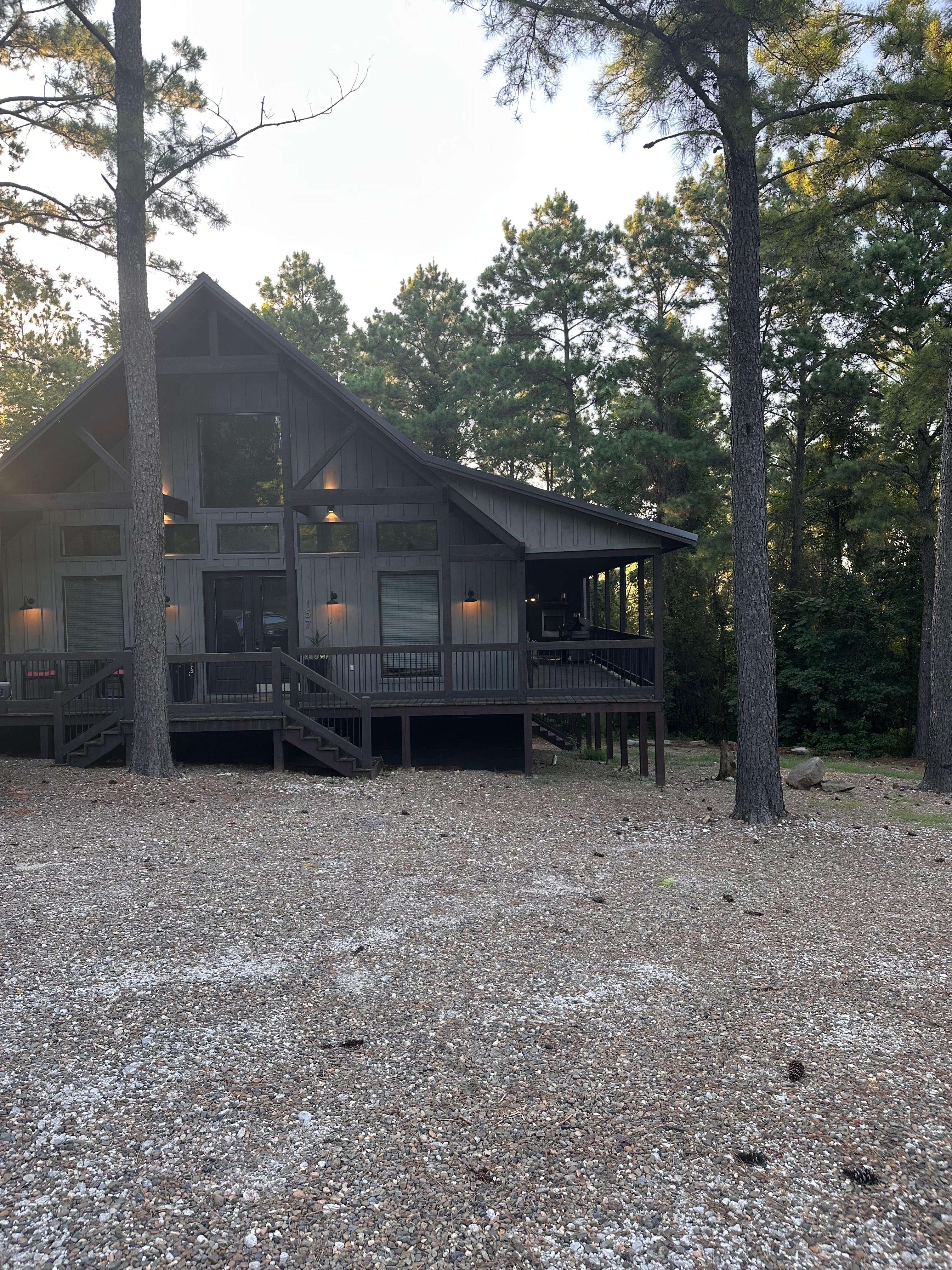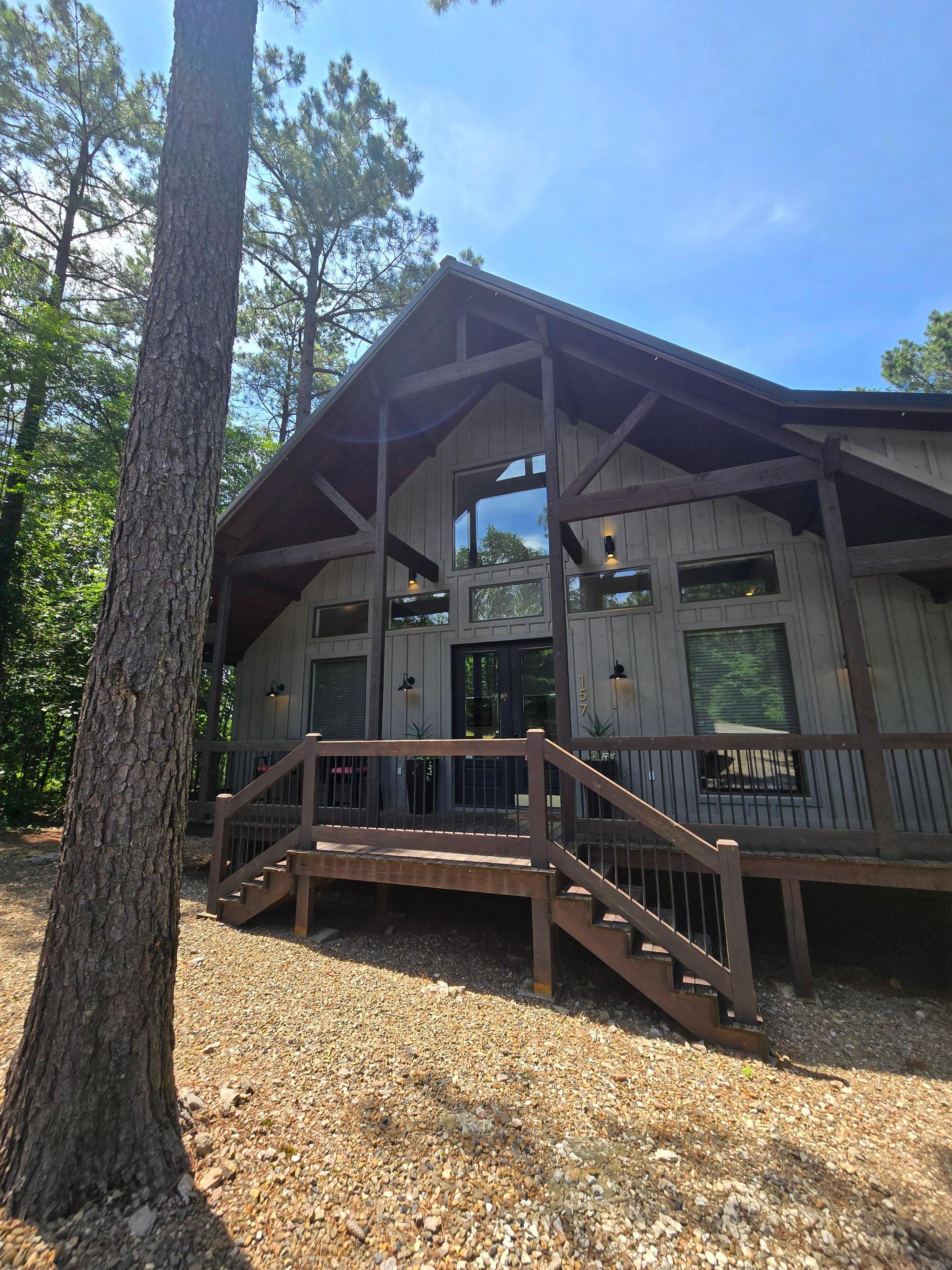 Brand new modern luxury cabin with stylish open floor plan is nestled on a large 1.5-acre wooded lot in the picturesque Ouachita Mountains, on top of one of the highest points in Timber Creek Trails South.