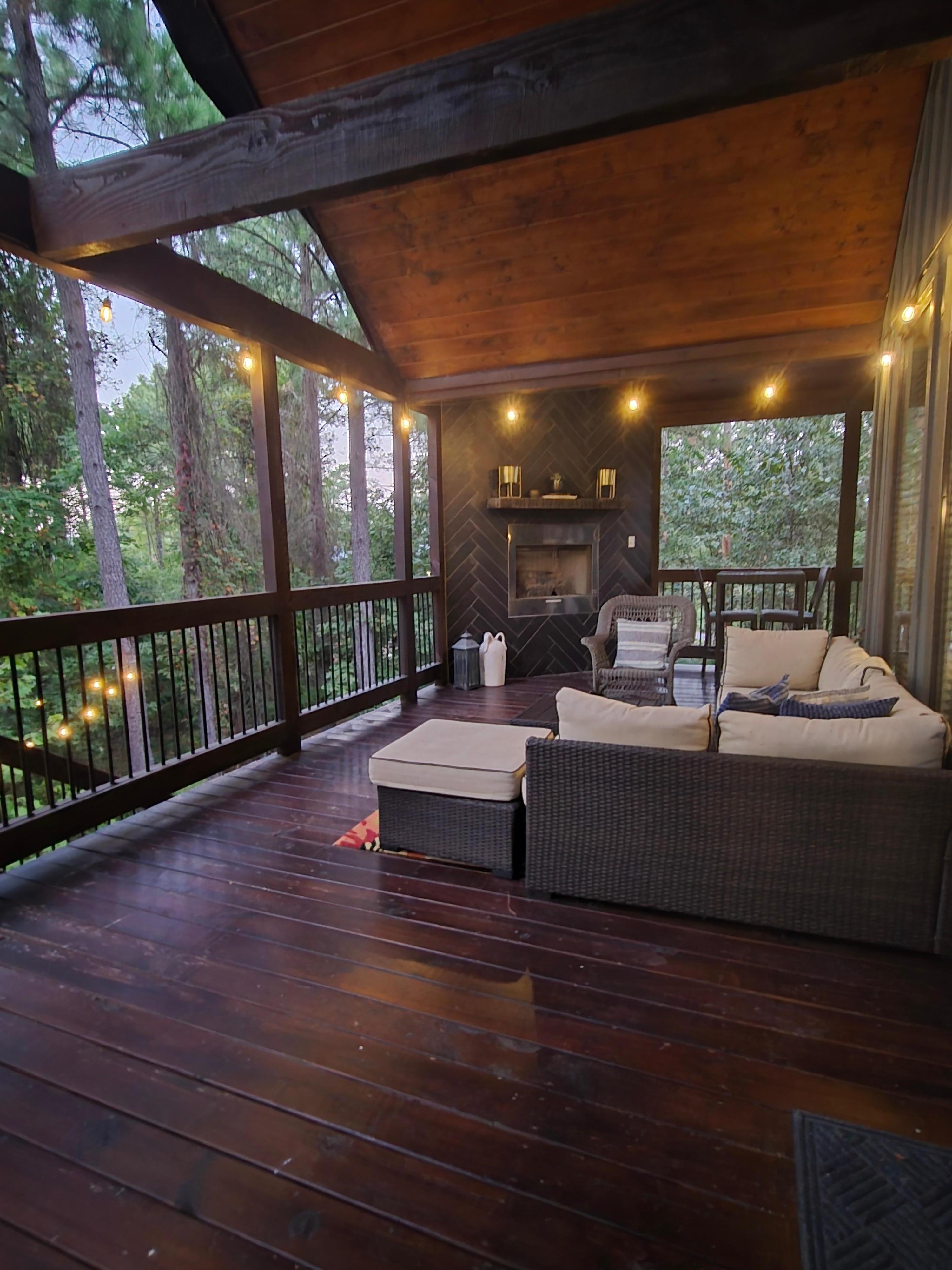 Luxury linens, very well-appointed kitchen, 2 fireplaces, soaker tub, grill, hot tub, games, fire pit, indoor and outdoor dining on the #dogfriendly wrap around porch!
