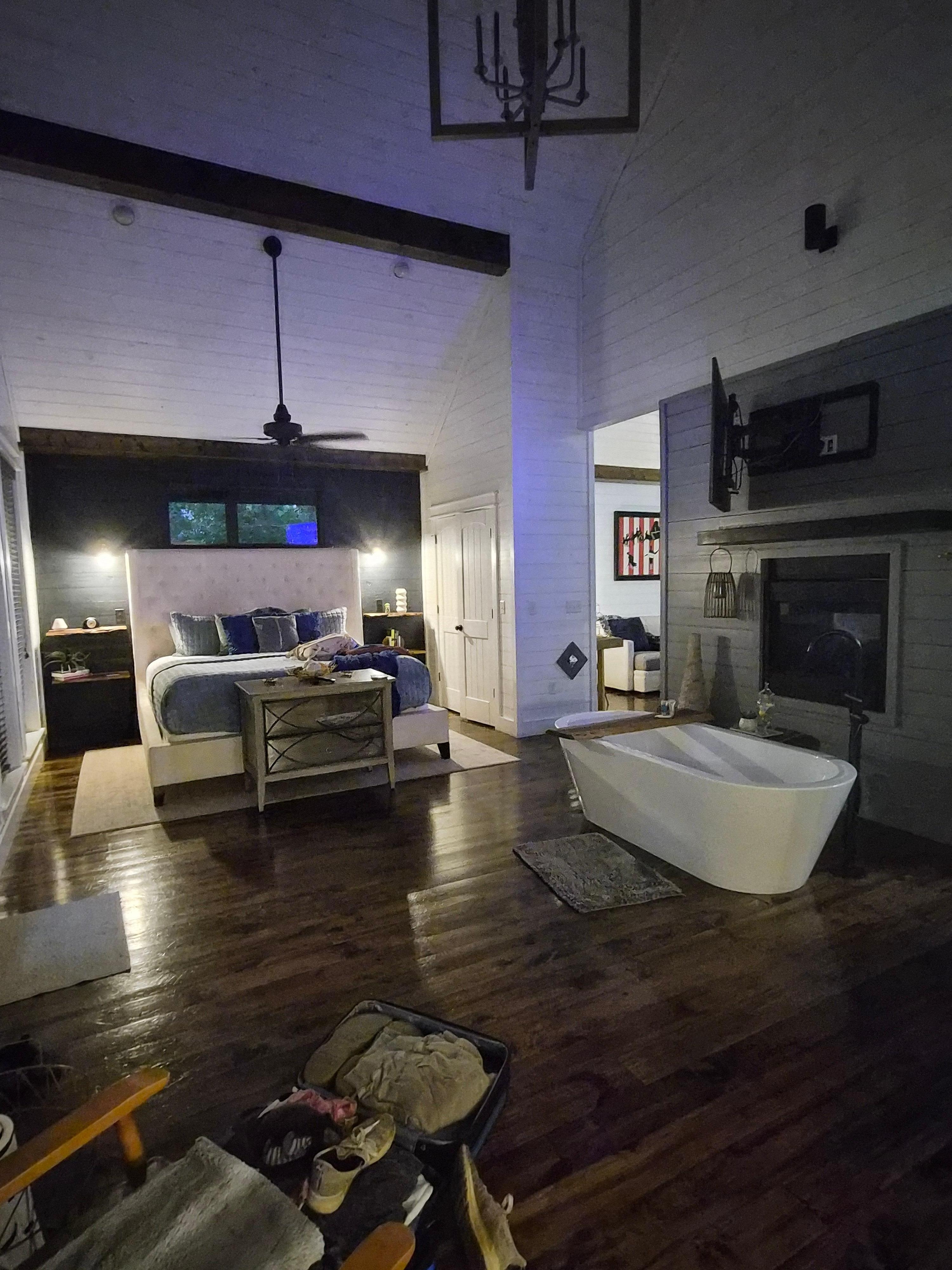 FIRST KISS: A Modern Luxury Couples Cabin, See-through Fireplace, Soaker Tub.