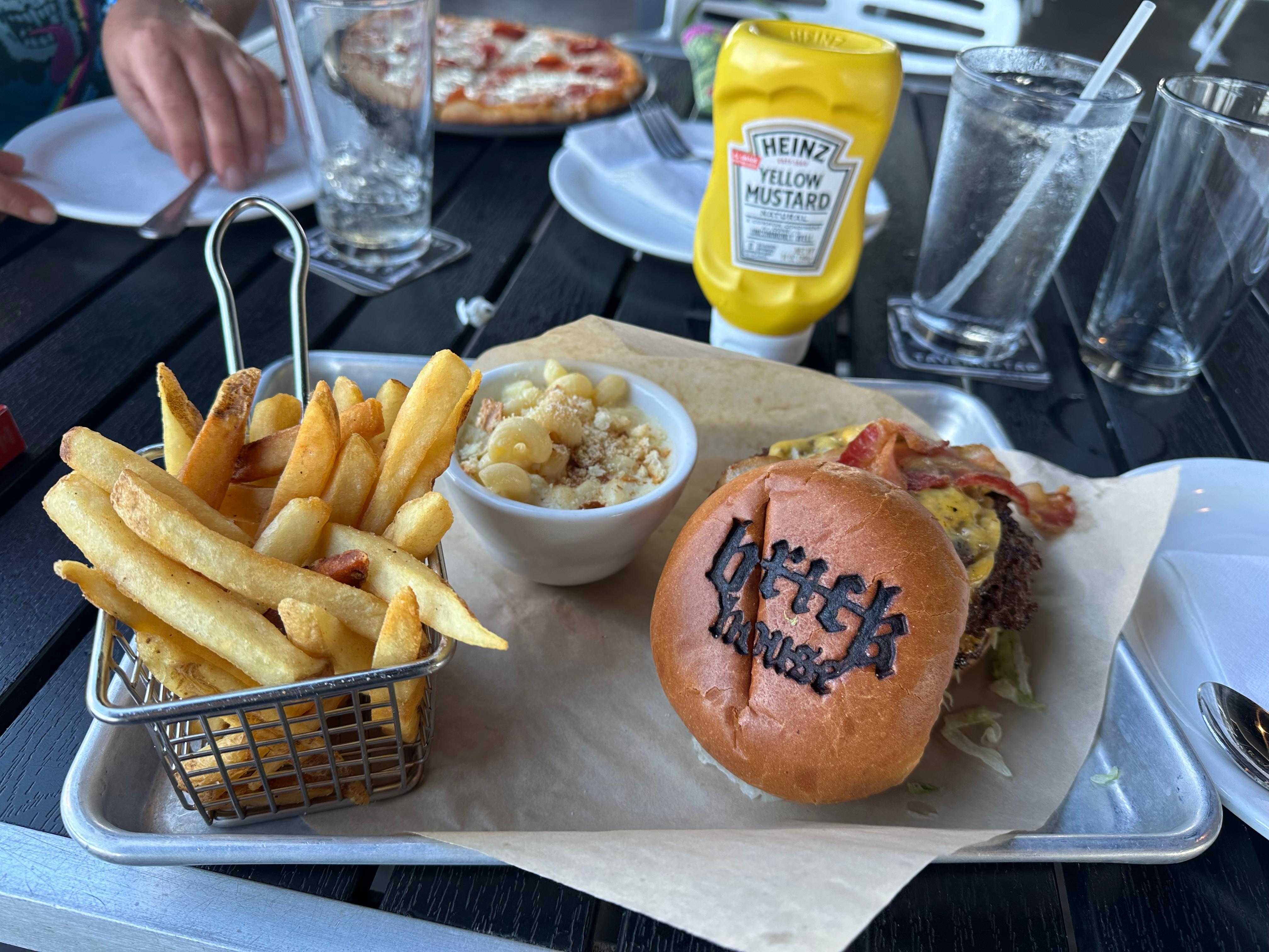The outdoor patio includes seating for four, a charcoal grill, and a firepit.