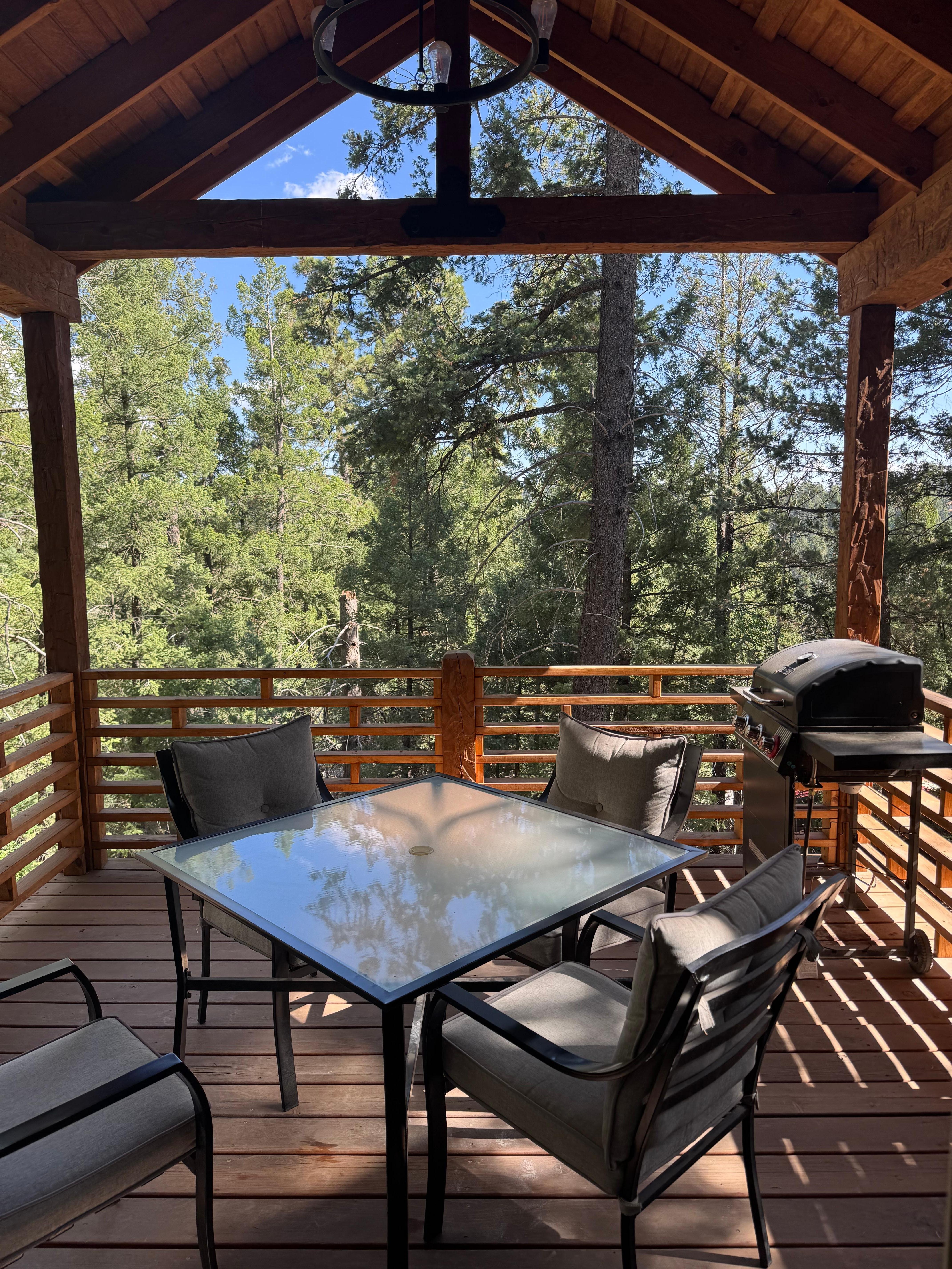 Shep's Studio Hideaway is available as a 4 person cabin. This cute cabin is brand new & tucked away down the hill from the street, nestled in the trees. It's located in the Lincoln National Forest & is across the street from a hiking trail that connects with the OSHA trail.