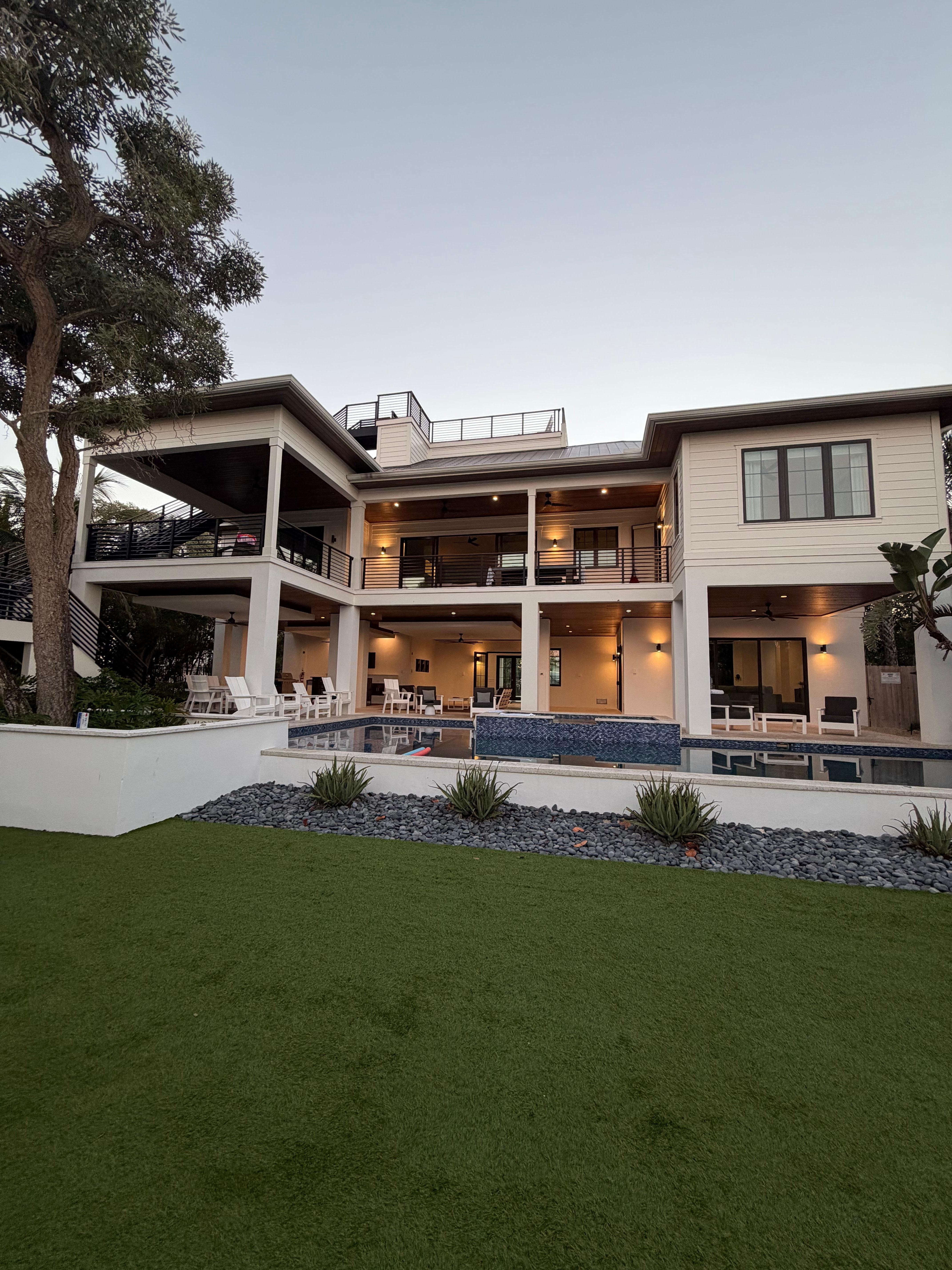 There are so many outdoor living spaces to enjoy here! The resort style, saltwater heated pool and spa, has a sun shelf for lounging, bubblers and lights, and a waterslide for more fun! The covered patio has a large smart TV, bar area, seating and dining, and an outdoor grill. All of this sits within the fenced in back yard, filled with lush native landscaping for privacy and security, and directly on Pansy Bayou. The home is family friendly, and the back yard is perfect for the home’s pet friendly policy (fees and restrictions apply). Adjacent to this space, just off the covered pool area is the home’s club room or game room with multi-sports simulator (golf, bowling, hockey, soccer and more), ping pong, gaming consoles, smart TV and seating. This home has multiple balconies and a roof top deck that have seating and amazing views of the Gulf of Mexico, Lido Key Beach, St. Armand’s Circle, and the downtown Sarasota skyline.