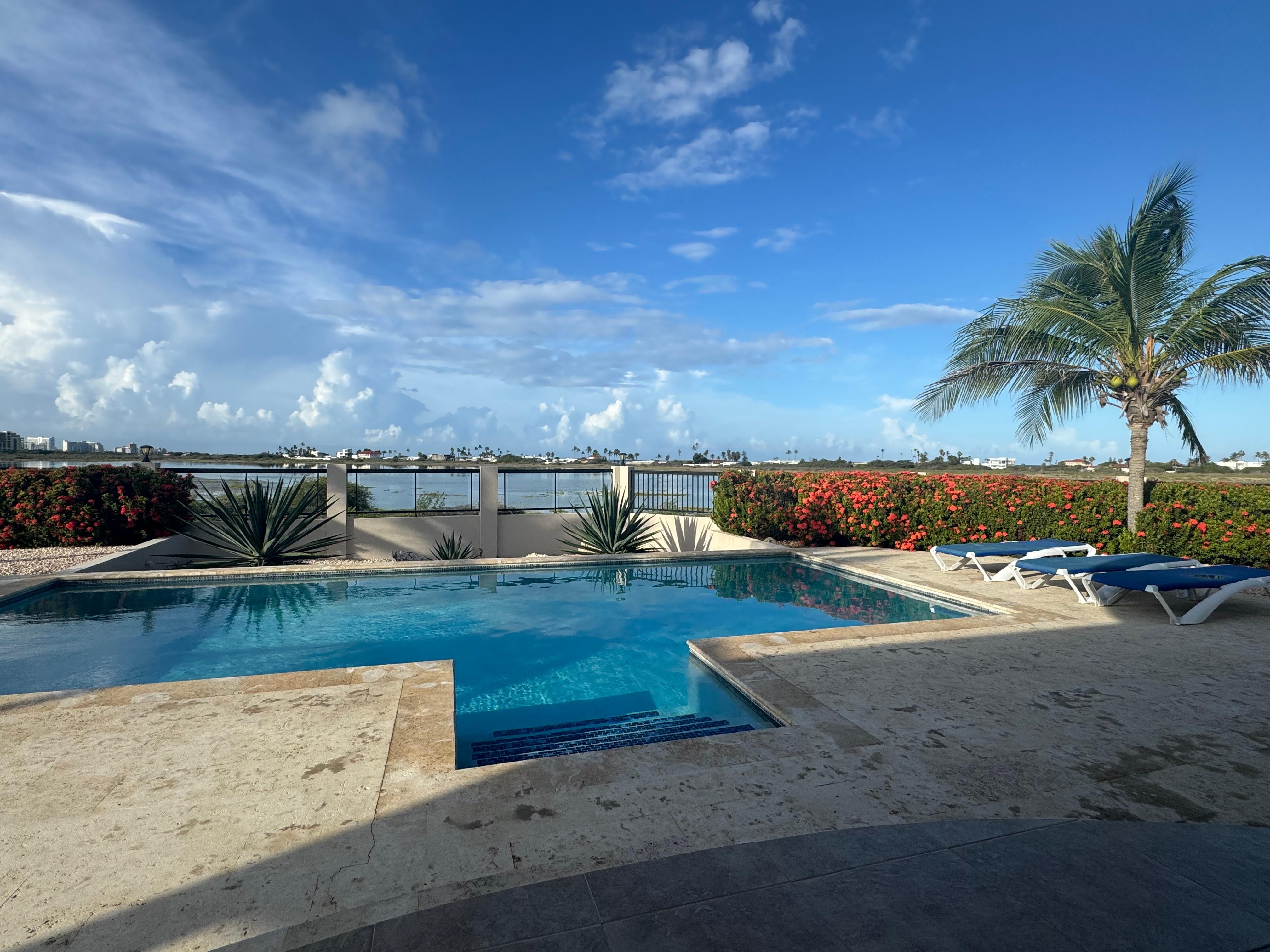 This breathtaking private villa with a one-million-dollar view is located in the upscale residential area of Esmeralda. The villa is designed to give you the best, wide-open views from the pool deck, porch, living room, and master bedrooms over the saliña and in the distance the Ritz Carlton and Marriott Hotel. A large pool deck surrounded by tropical plants guarantees you complete privacy in combination with a stunning view. That’s why we hear over and over again from our guests: “this is better than the Ritz..”