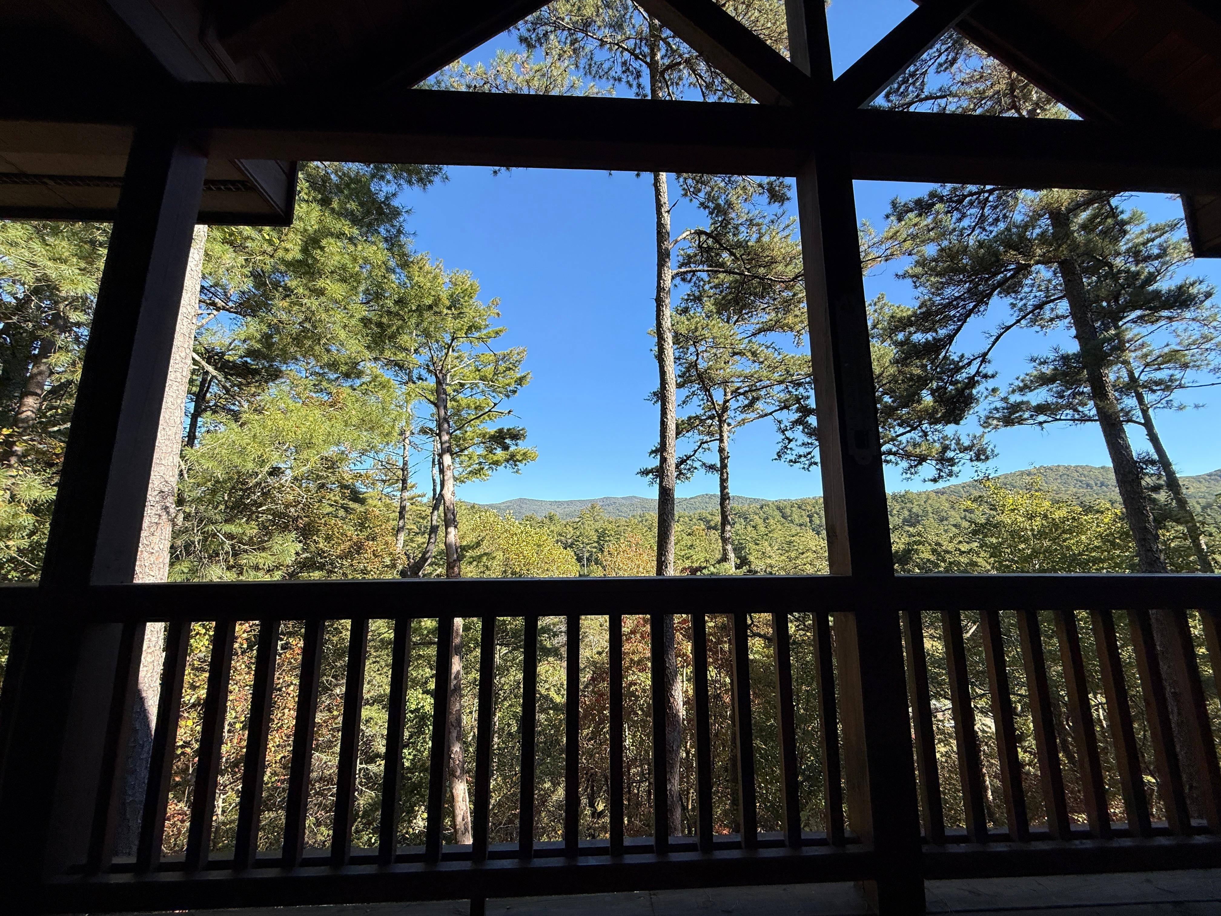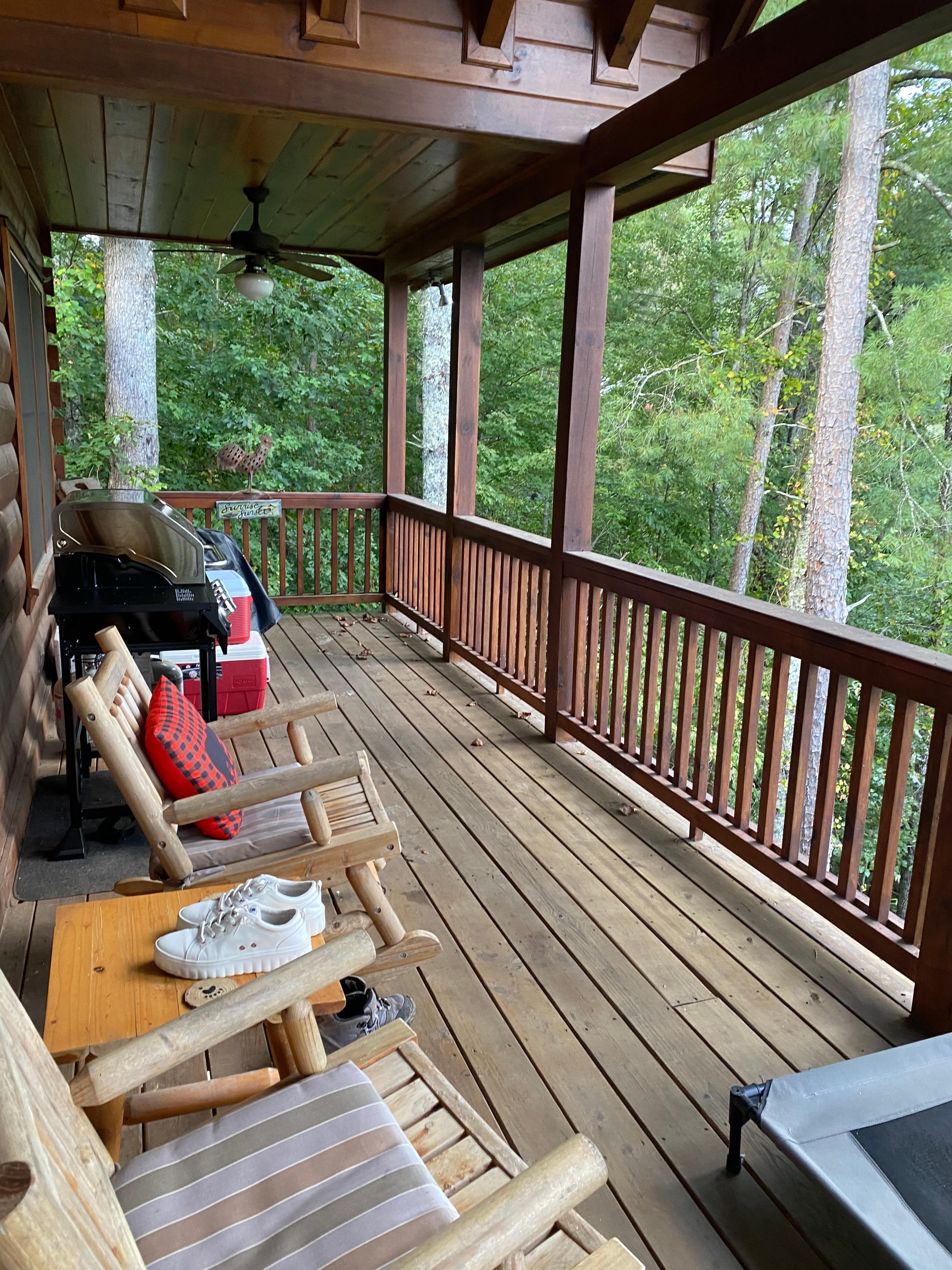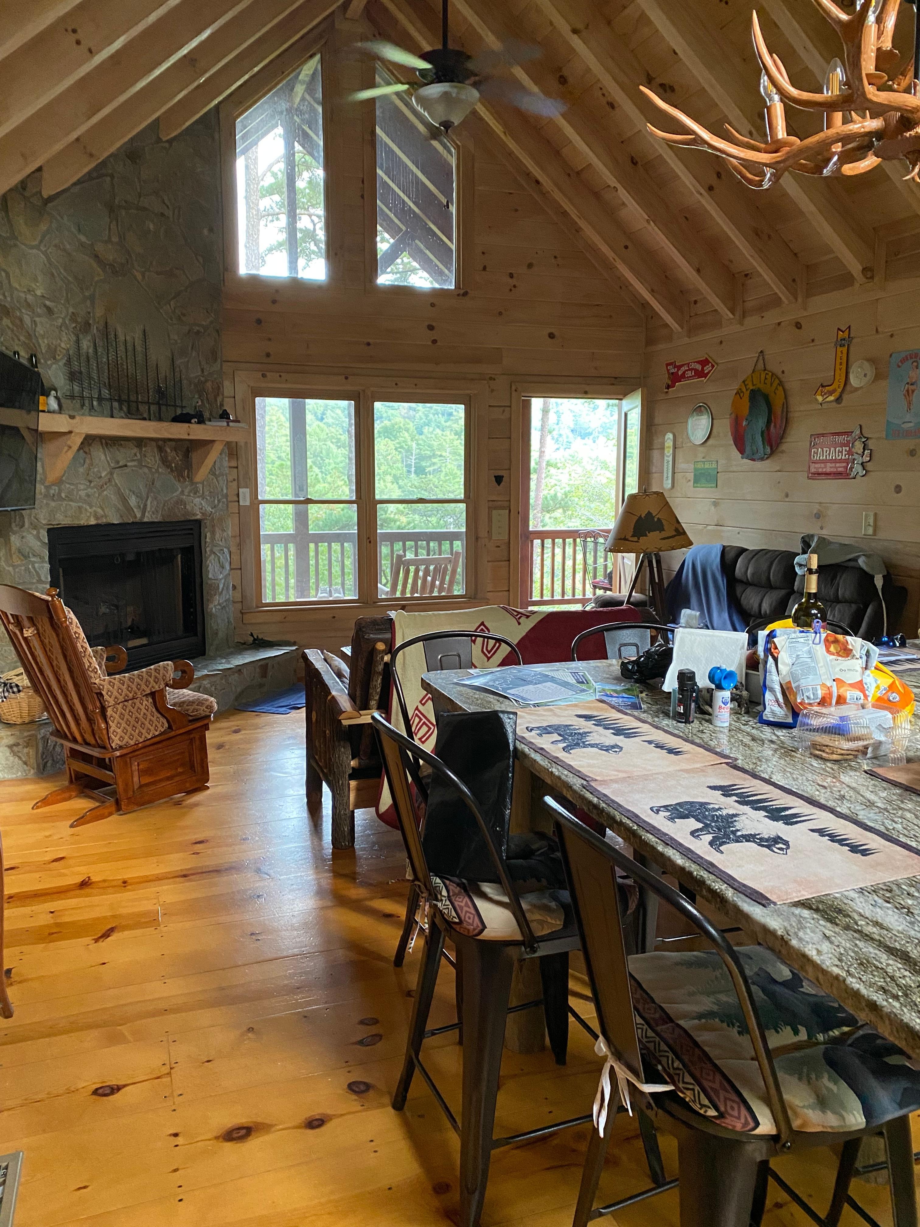 Our 3 bedroom, 3 bathroom cabin sits on 2.2 acres of land on the side of Cherry Log Mountain. It has one of the best views on the mountain and is a traditional log cabin with wood from floor to ceiling in each room. We frequently see wildlife from the porch or front door in the morning or evening. While you will hear the tranquil sounds of nature all day and night, you may also hear some passing traffic from time to time.