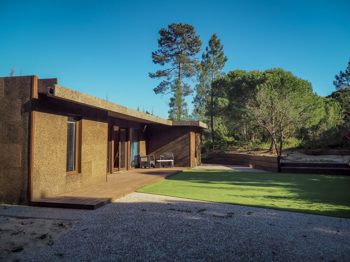 The house is made of ecological materials, but it's very well isolated on the outside with Portuguese cork. The lines are straight simple and modern, but the wooden ceiling gives it a little bit of a rustic feel.