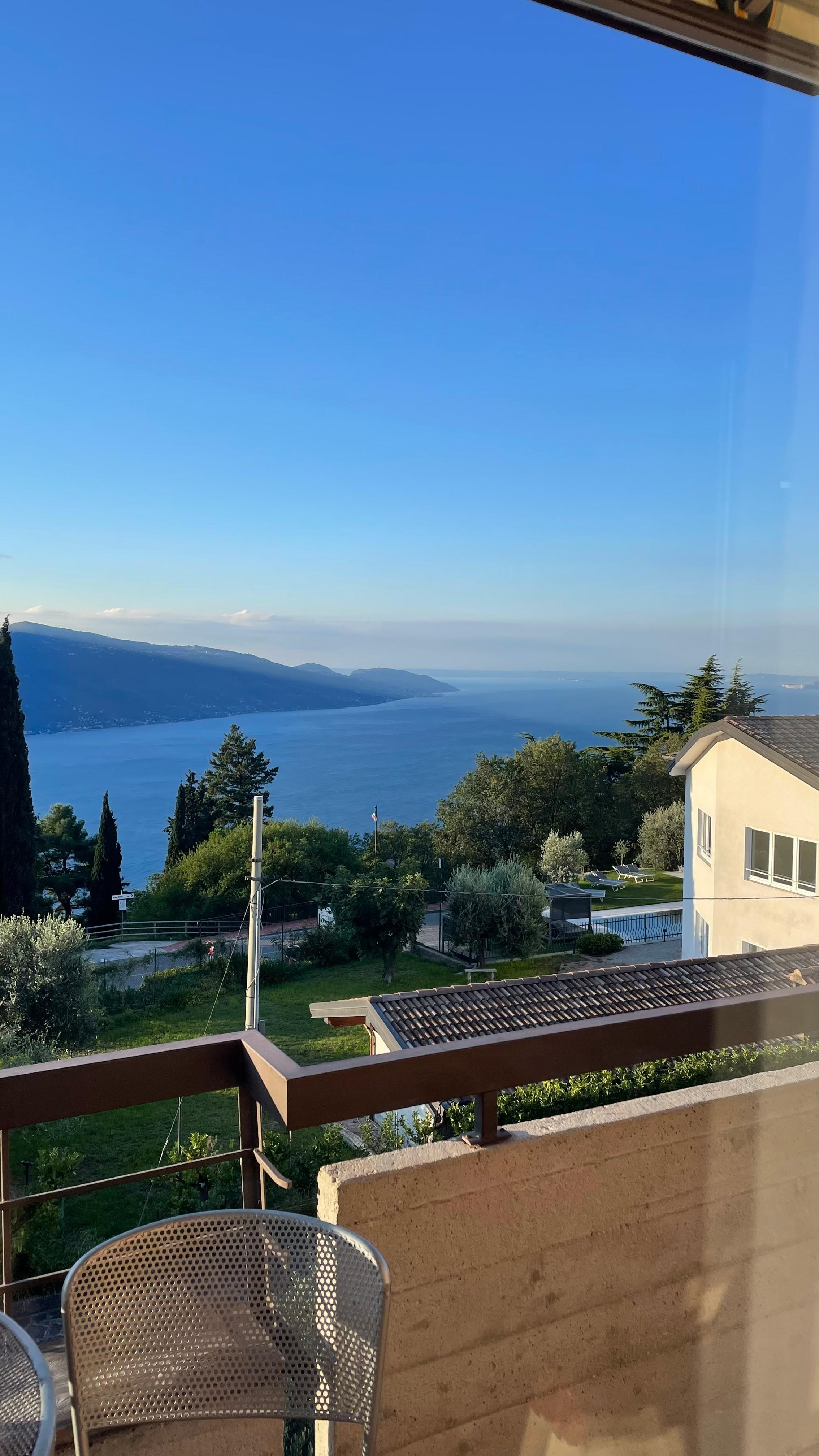 The apartment has a large balcony with a wonderful lake view of Lake Garda. Equipped with chairs, table, deck chair and sun protection.