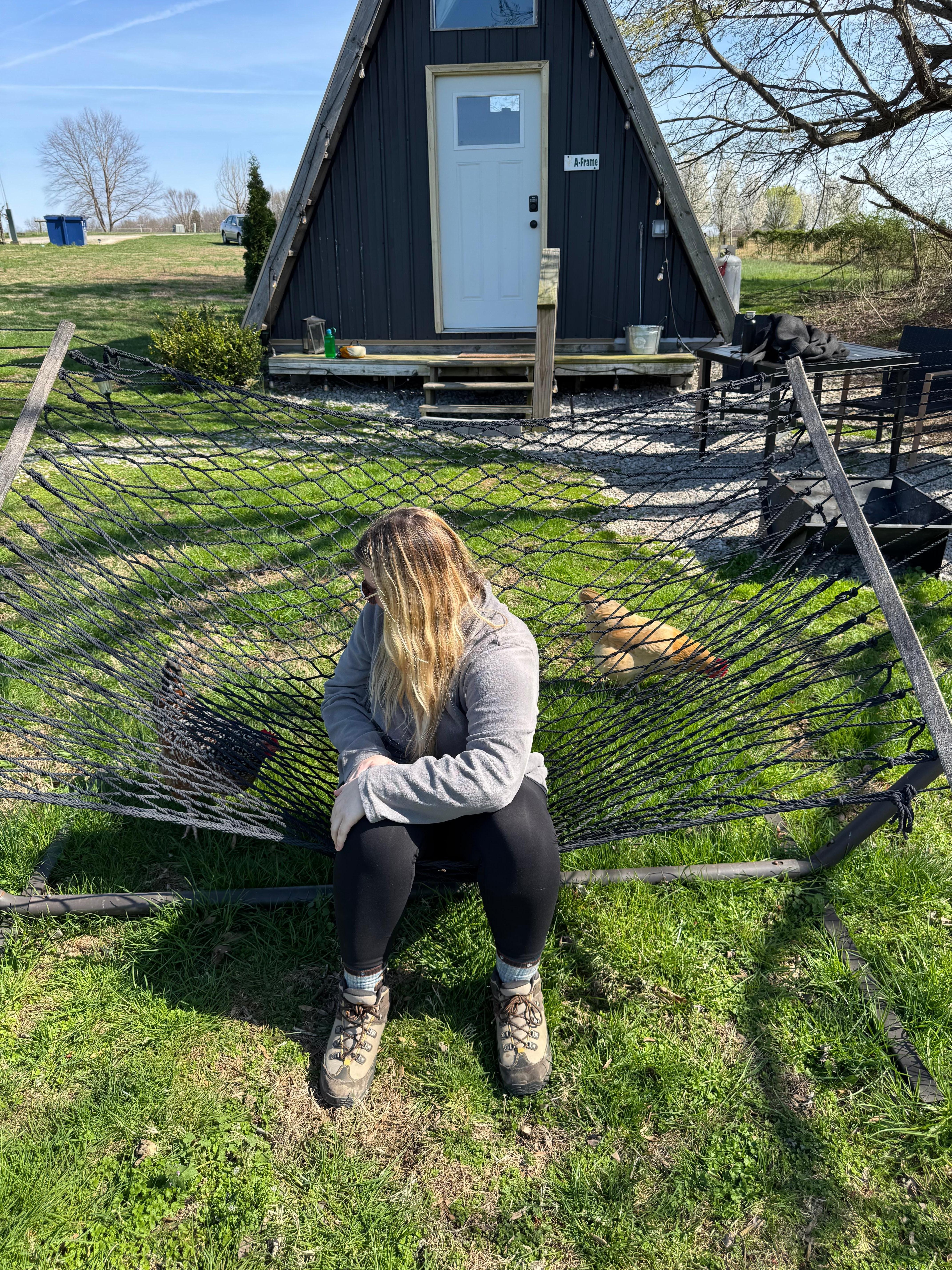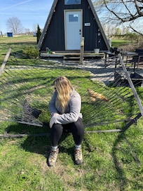 Glamorous camping at its best in this cute and cozy Aframe. Climate control with AC and heat. Mini fridge, microwave, coffee keurig, towels, paper products. Outside a table, fire pit, charcoal grill complete your camping experience. Campground bathrooms are close by. Birds to wake you in the morning and friendly farm animals are always looking for treats.