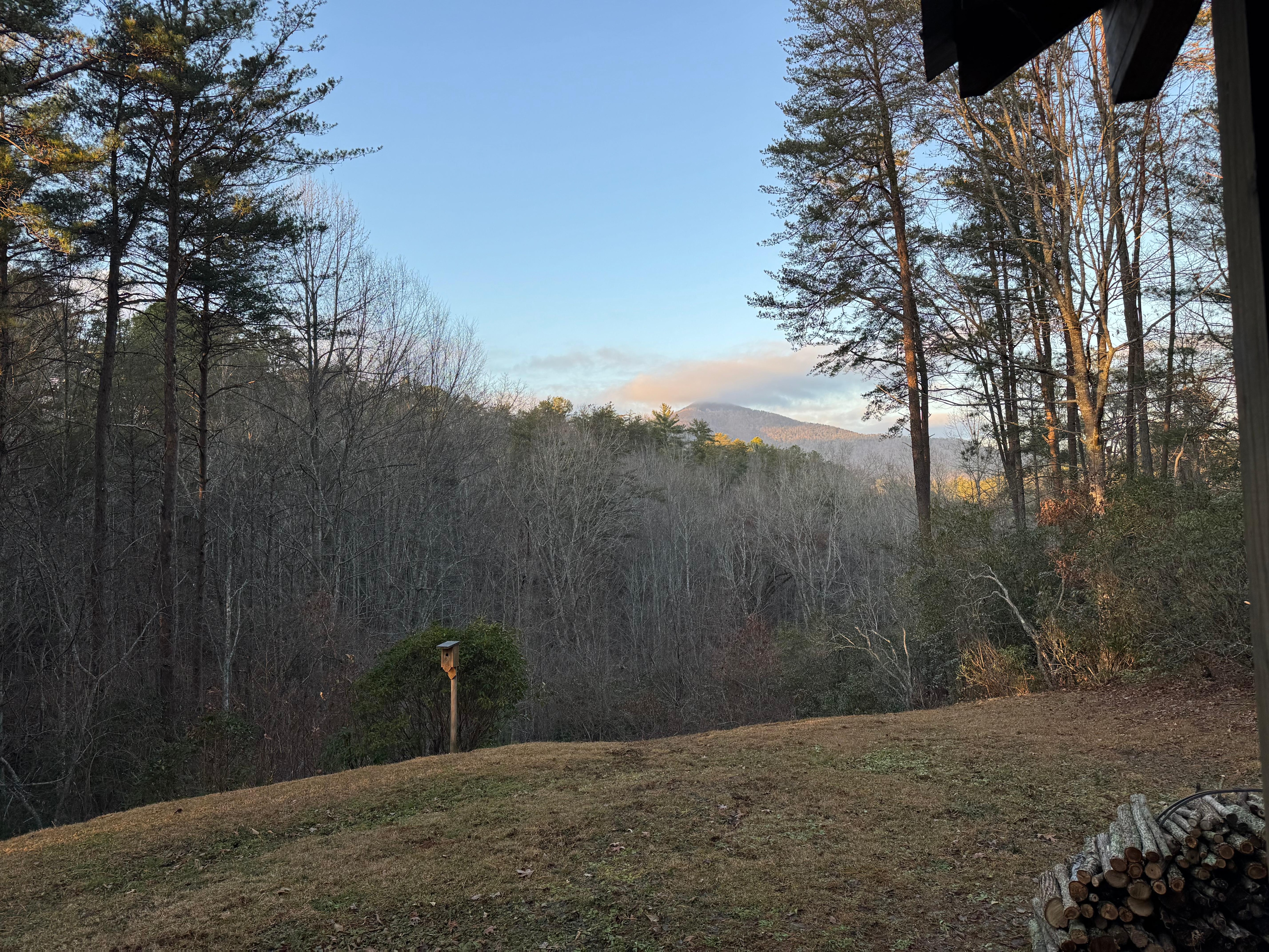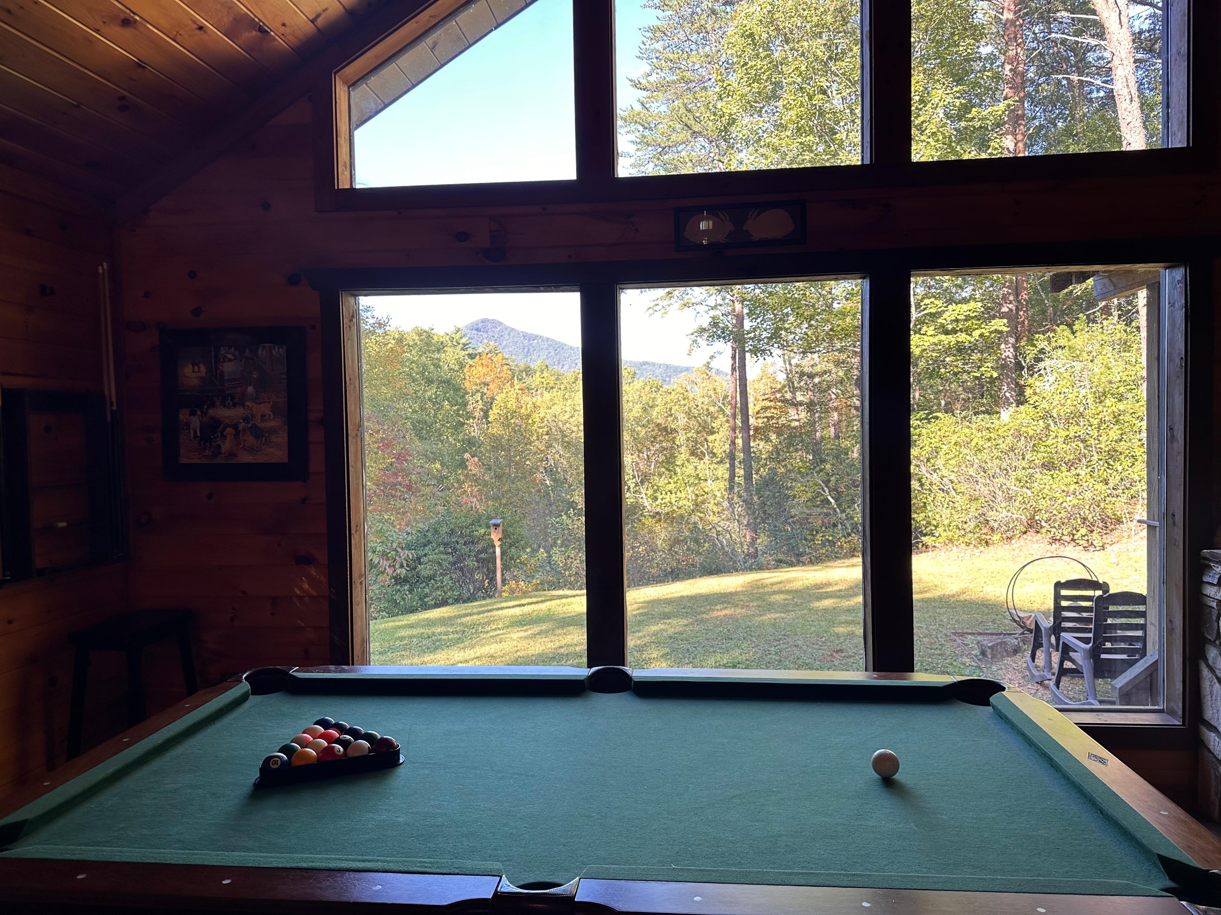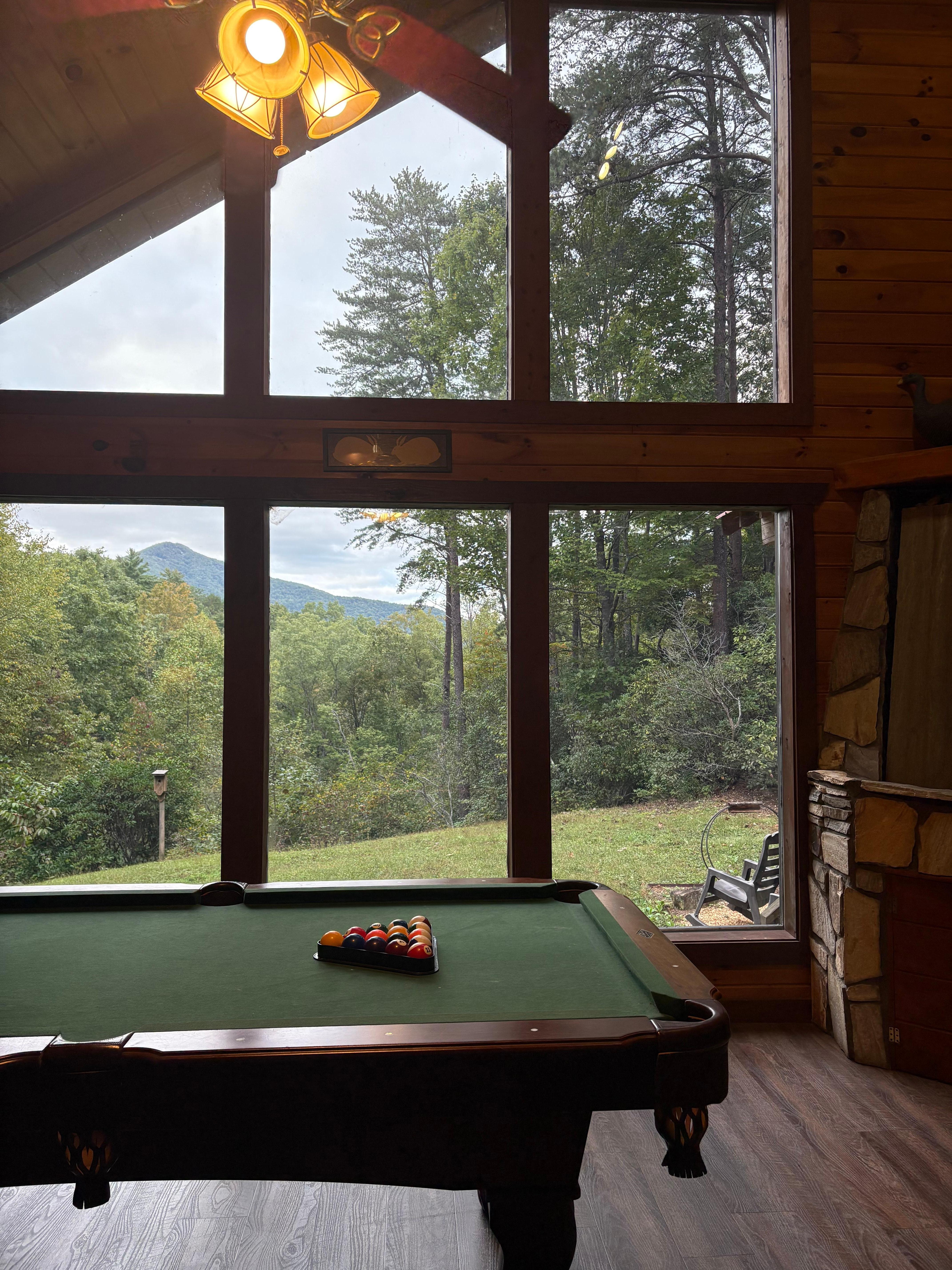 What a true treasure you’ll find in Vista Ridge! Beautiful long range mountain views. Drive through the gate and you’ll enter the end of the road privacy. Private walking trails along adjoining property. Trail will provide great sights with some peace and quiet as well. Enjoy the gorgeous mountain view throughout the entire cabin through the large ceiling to floor windows. Inside is a fully stocked kitchen with all appliances you could need. Prepare your favorite meals with all utensils provided. Some basic spices are provided as well. Fireplace is the focal point in the center of the room with a floor to ceiling stacked stone fireplace. This is a see-through fireplace to be enjoyed from the living room and bedroom. Large flat screen television offers DIRECTV as well as Roku so you can stream your favorite apps during your stay. Pool table provided for those quiet times that you decide to stay in and just enjoy your space. Bedroom has comfy king size bed, private bathroom with oversized shower, and soaking tub in bedroom. French doors open up from the bedroom to the screened in porch where you’ll find the hot but overlooking the mountain view. Outside hot tub area you’ll enjoy the open deck. Below is the patio area with Gas grill, fire pit and smoker. Generous open yard area for soaking up some sun and enjoying that gorgeous view.