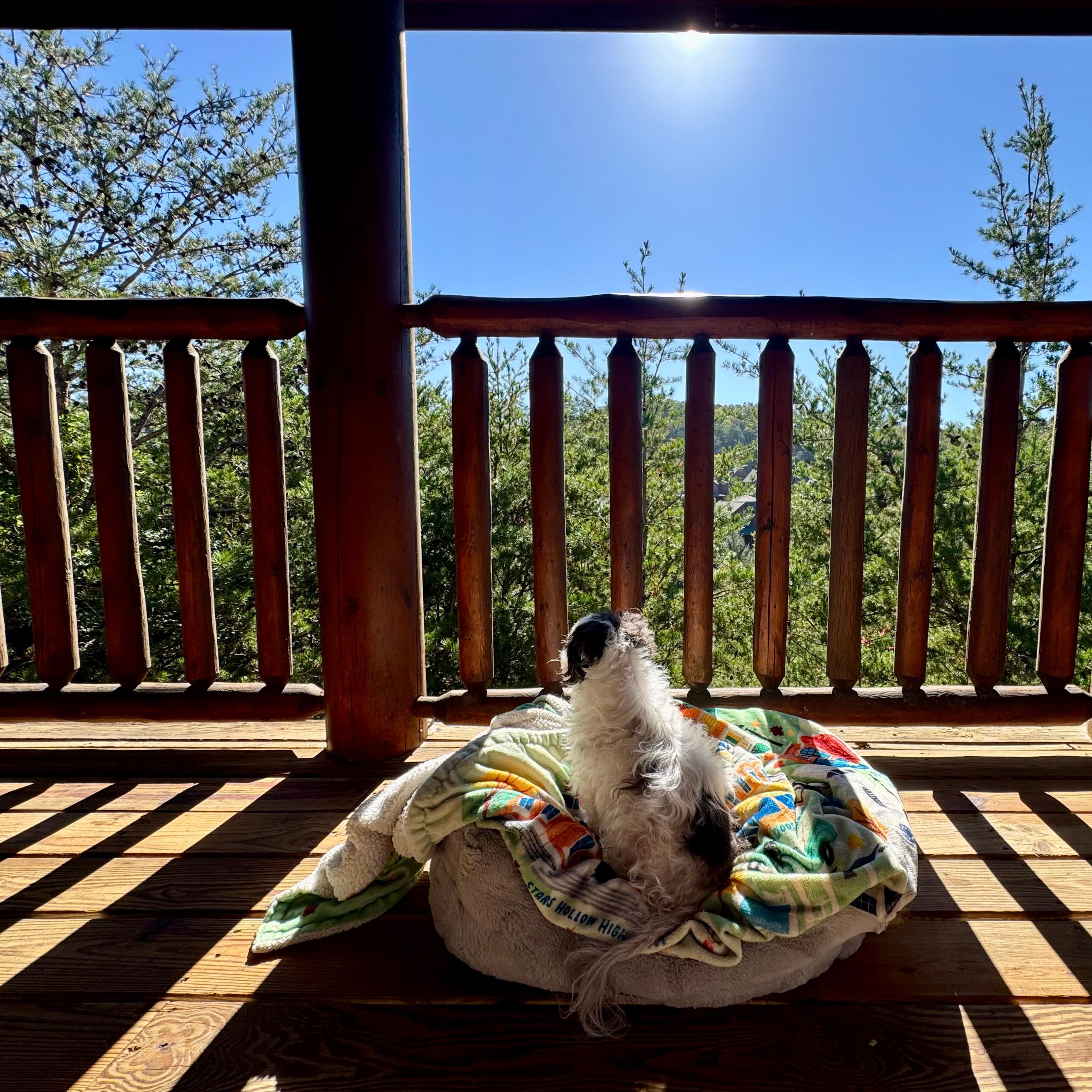 Step onto the wrap around porch and take in Mother Nature at her finest with the beautiful views. We enjoy relaxing in the rocking chairs while taking in the breeze through the trees and listening to the birds. This view of the wilderness also includes a hot tub to help melt your worries away, propane grill for delicious BBQ dinners and string lights that create a magical atmosphere in the evenings.