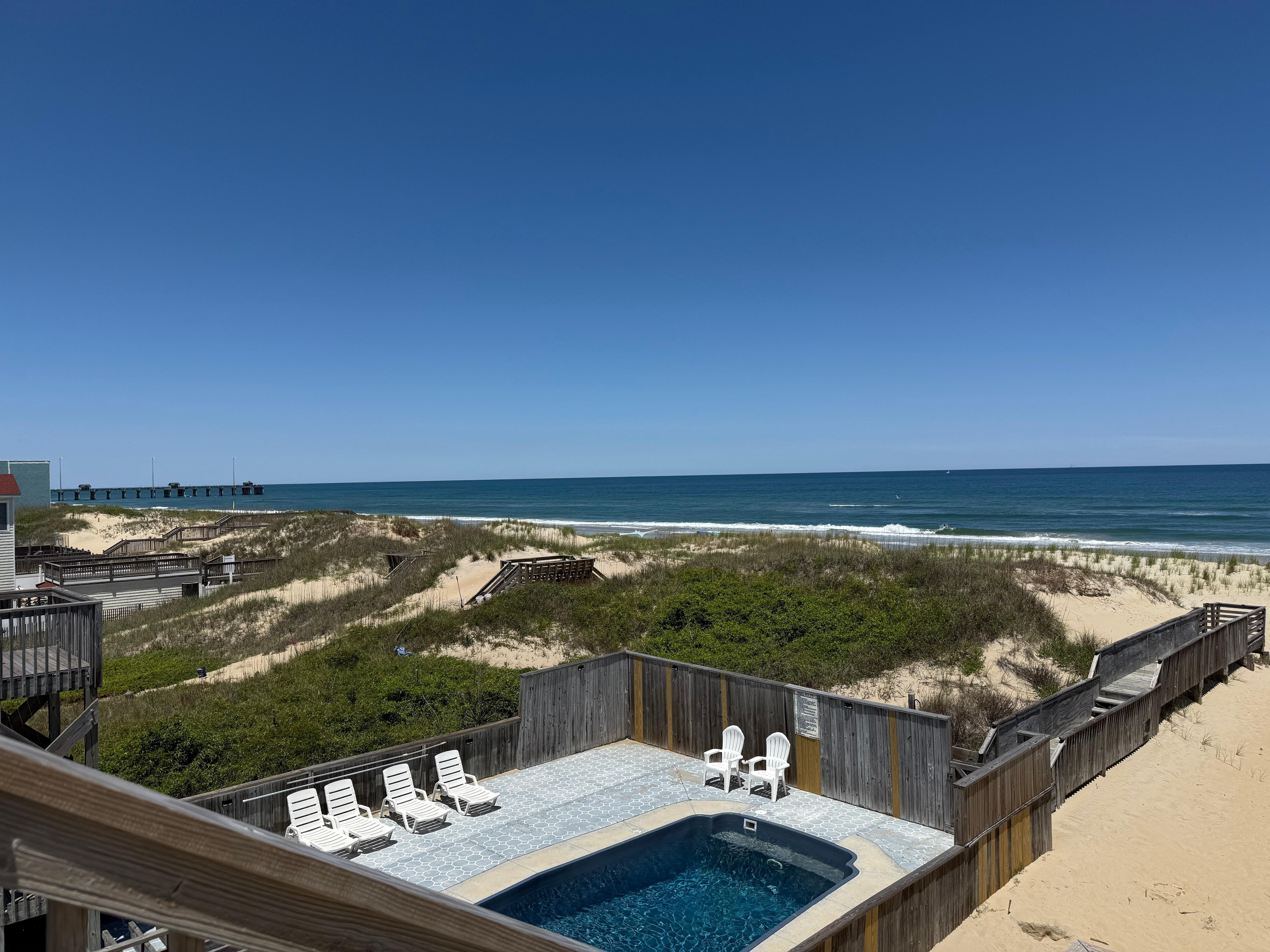 Step outside into your own private resort-style paradise. A 10' x 20' private pool with an adjacent baby pool offers the perfect place to cool off under the sun, while the elevated hot tub in a shaded gazebo invites you to soak in the serenity with calming sounds of ocean waves. A private dune-top deck delivers breathtaking ocean views, and the direct-access beach walkway ensures you're only steps away from the sand and surf at any time of day.
