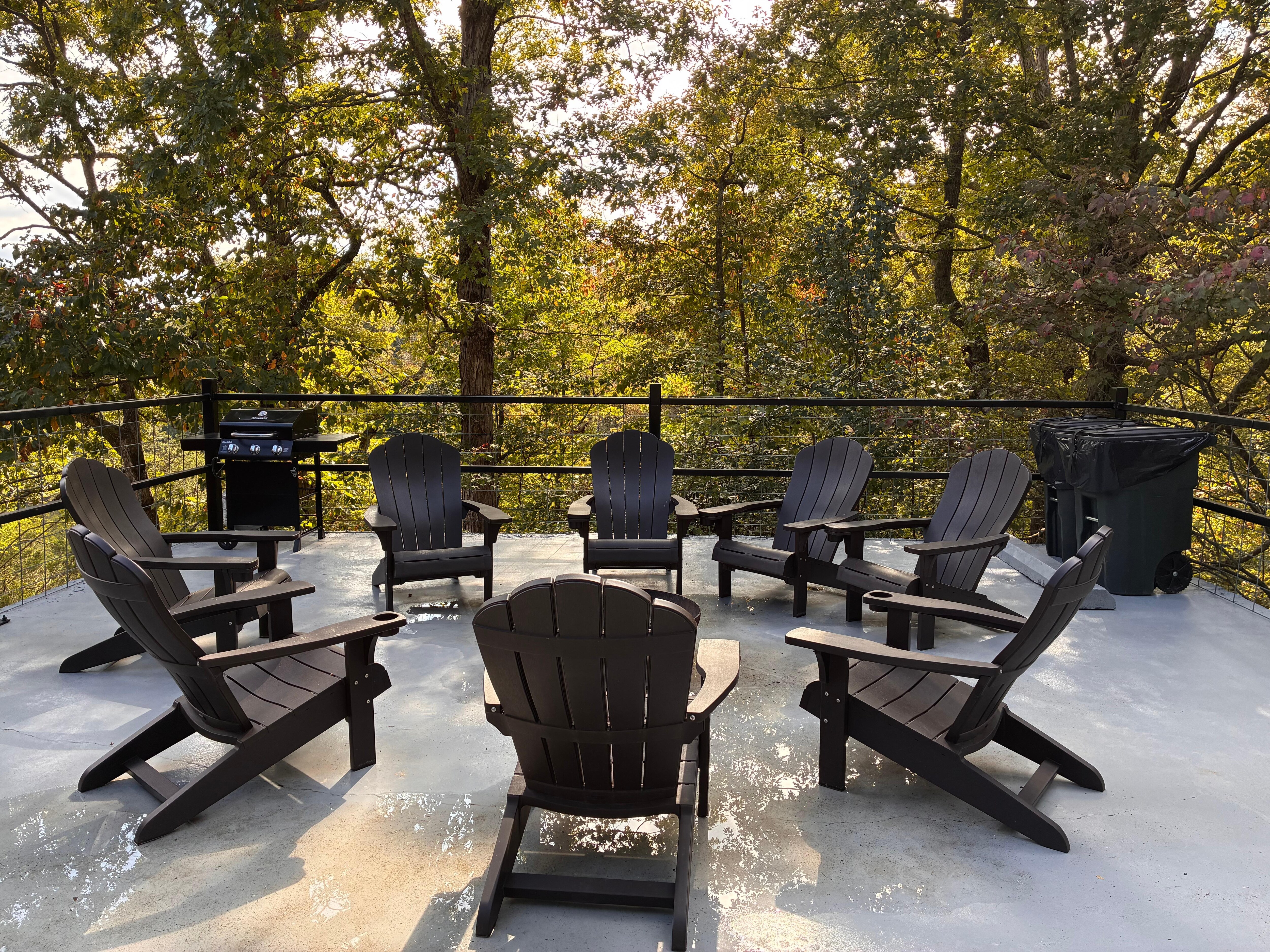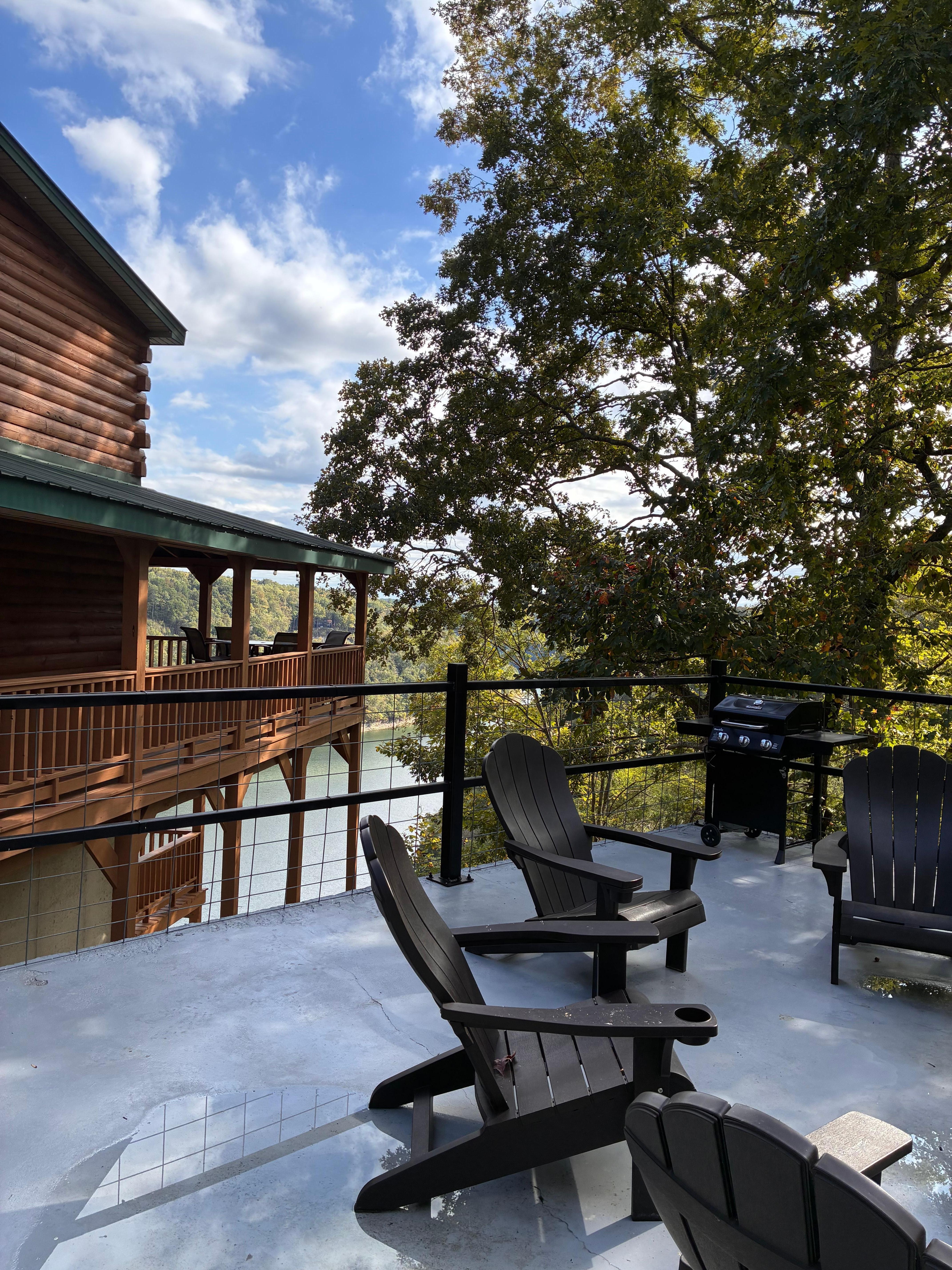 A wrap-around deck on the main level and a second deck on the lower level ensures plenty of space to spread out. The wrap-around main level deck has two sofas, a table with six chairs, and a hightop table with four chairs -- all with a lake view! The lower level deck has a table with 4 chairs. We encourage you to wake up with the sunrise and enjoy a cup of coffee outside on the patio table, or watch others fish, jet skis or kayak below. Meanwhile, inside the cabin, nearly every room has a picturesque lake view.