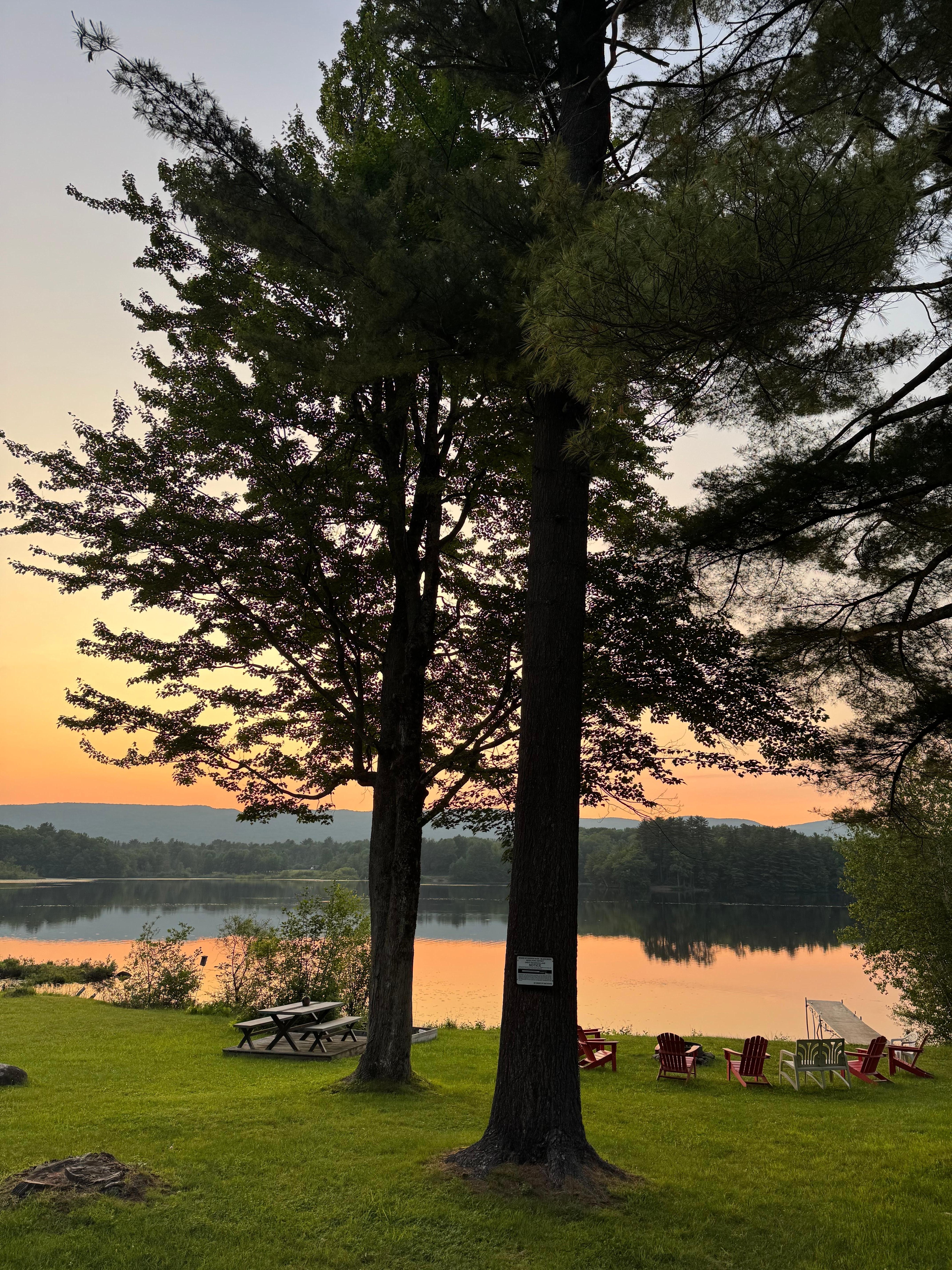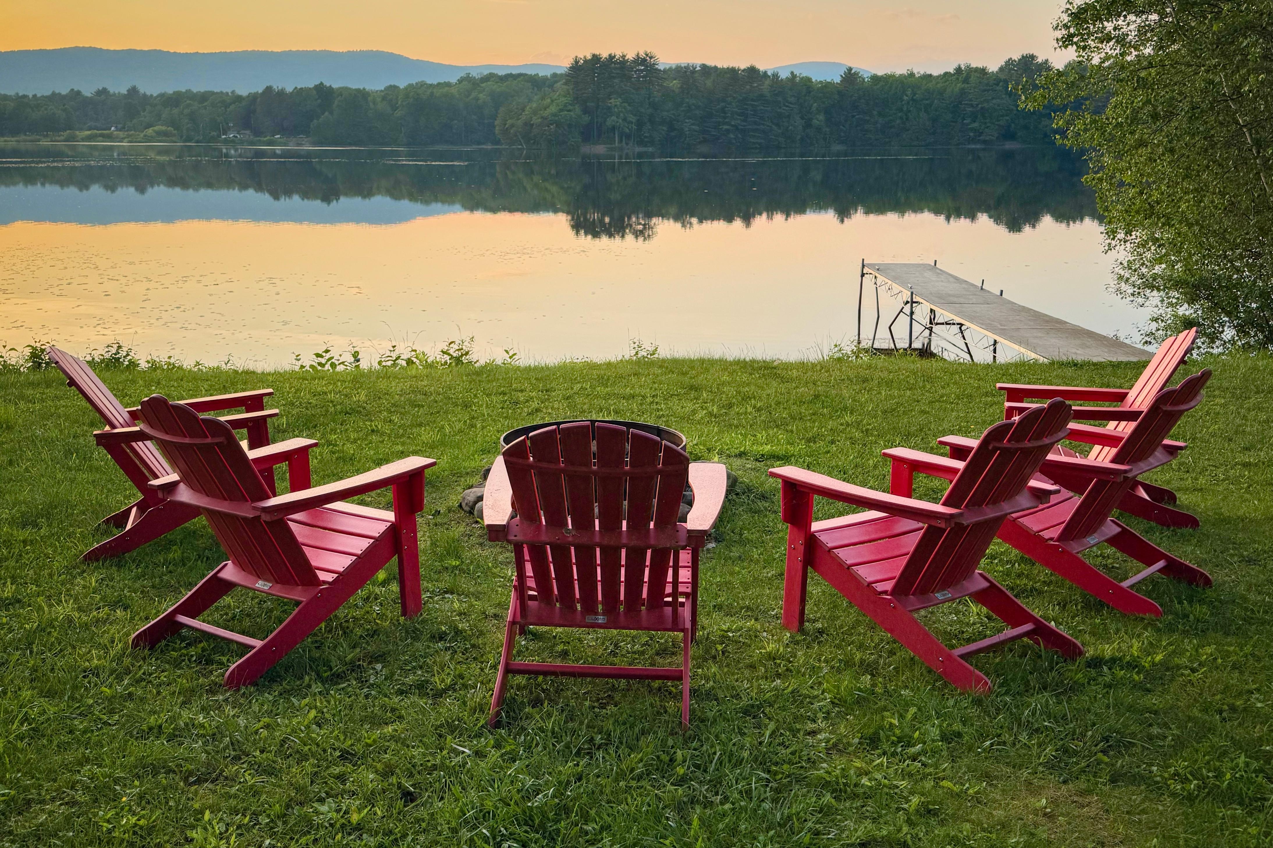 The Backyard – the home has over 100 feet of lake frontage! No road to cross, just walk outside and enjoy your morning coffee or evening glass of wine. There is an attached deck to the house, where you’ll find a picnic table and gravity chairs to relax. There is both a gas bbq and a charcoal bbq for your cooking pleasure. On the lawn you’ll find another picnic table, as well as 6 Adirondack chairs around a firepit for your enjoyment. There is a small dock in the lake. Two kayaks (double and single), two rowboats (plastic and metal) and a paddleboat, as well as fishing poles are provided. We’ve had a lot of luck both fishing off the dock, as well as drag fishing off the paddleboat!