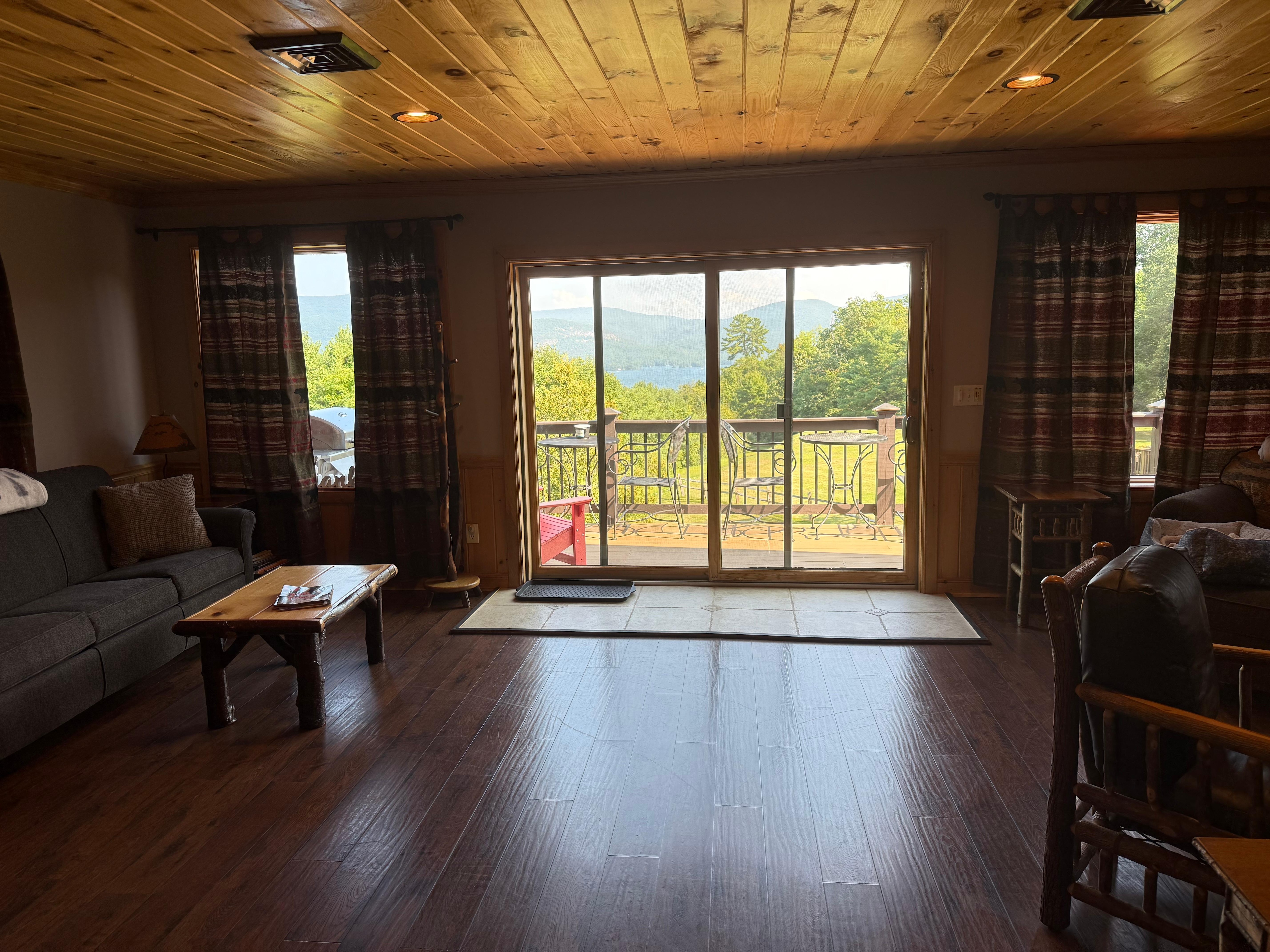 Gorgeous views of Lake George from your deck! Upper level, spacious, lodge style open floor plan with fireplace. Spacious two bedrooms with King beds and TVs in both! Queen sofa bed for extra guests. Full kitchen with center island and seating. Separate dining area with table. Full, spacious bath - shower and jetted tub. Laundry room with washer and dryer. Beautiful setting. Outdoor firepit and gas grill for summer fun! Currently available for 2022 Summer season.