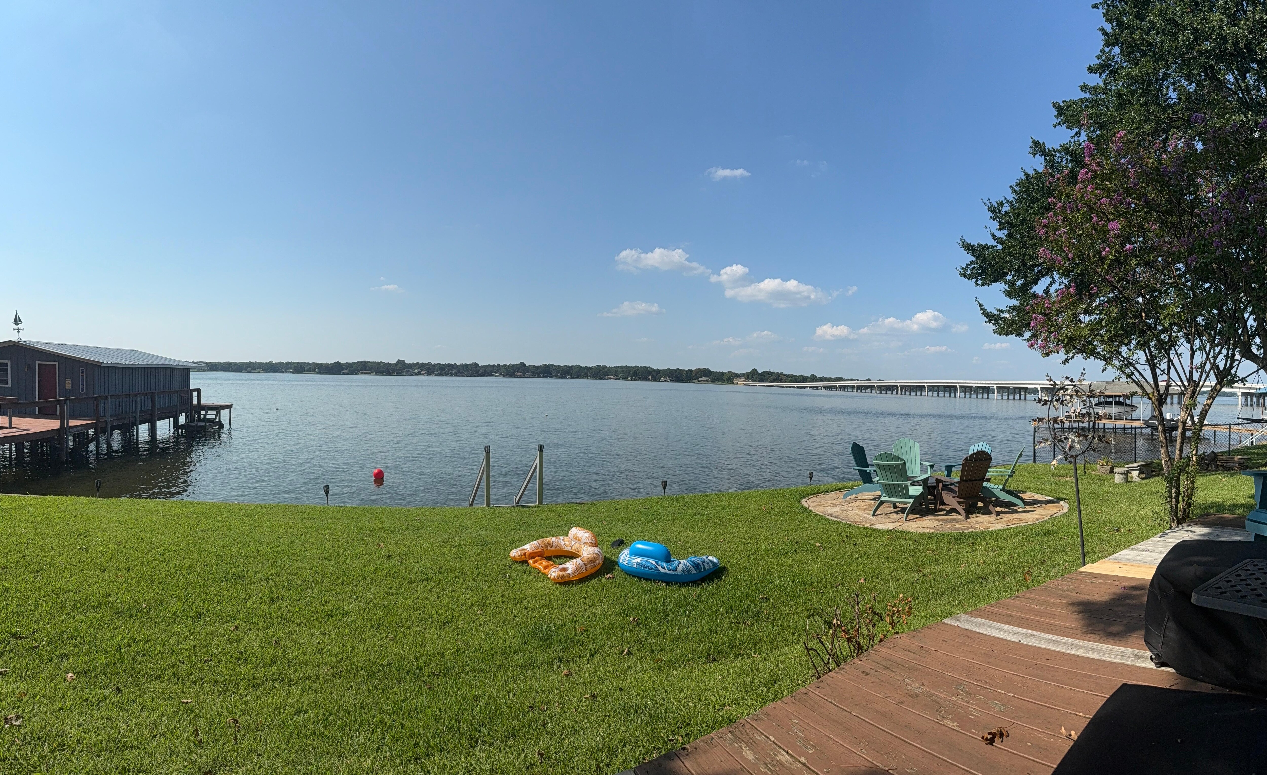 We are located on the south end of Cedar Creek Lake where we enjoy deep, deep water. The water is typically 9 feet deep. The lake was down 5 feet during the 2022 summer drought, and we still had 4 to 5 feet of water under the dock!