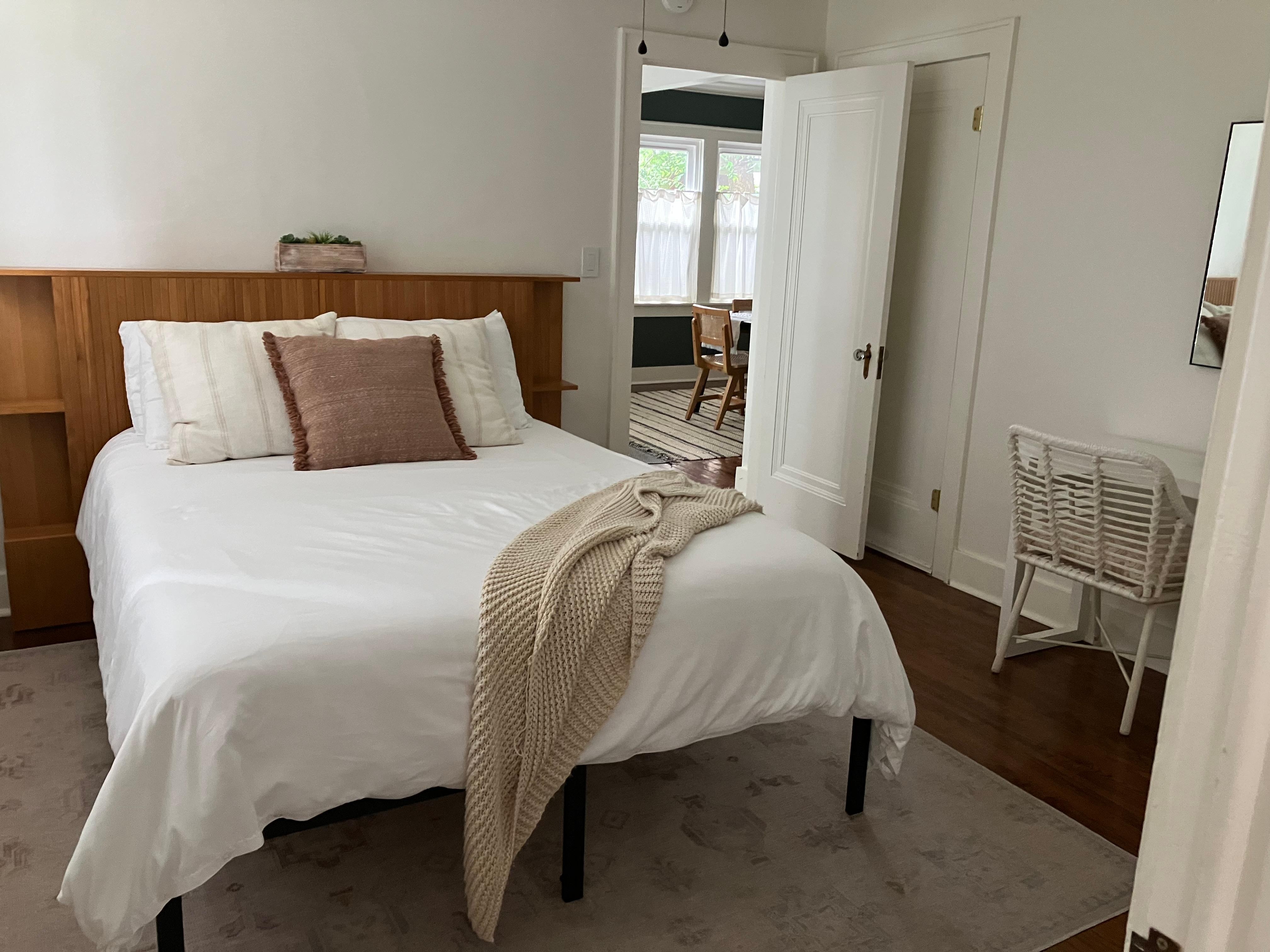 Each bedroom has a queen size bed with memory foam mattresses, two firm pillows, two soft pillows, sheets, a duvet cover and a blanket. There is a pull out queen mattress on the couch and we provide all bedding for the pull out. The primary bedroom offers a brand new luxury en-suite bathroom and the other two rooms share an updated bathroom. The living room is absolutely gorgeous with green walls and eight seats. In the kitchen, you'll find cooking utensils, a pour over coffee maker, and a Keurig (we supply Keurig pods for you as well!). On the back patio, there is a teak table that seats six and plenty of space to enjoy.