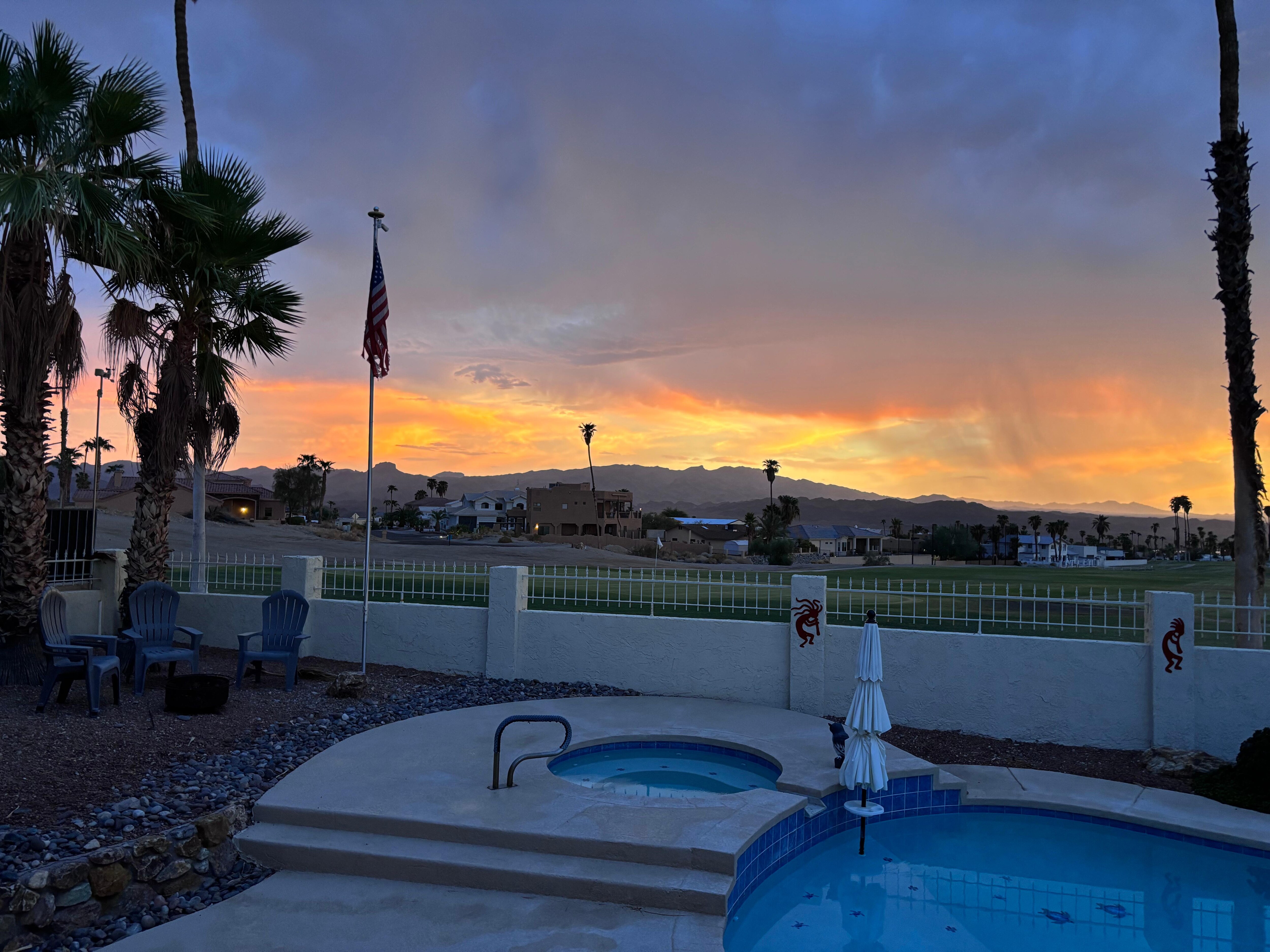 Situated in Residential Estates our large 2,500 sqft house offers great views of the Lake Havasu golf course, palm trees, mountains and even a peek-a-boo view of the lake. Our home is centrally located and just minutes away from the lake, London Bridge, grocery stores, restaurants, bars and downtown shopping on McCoulloch. We have a private gunite pool with Pentair automation controlled pool equipment including a 400K BTU natural gas heater (pool can be heated with an additional fee of $50 per day). The pool is surrounded by palm trees, has an in-pool margarita table with water seating and multiple umbrellas, Jacuzzi, a large new Cool Deck area with padded wicker patio furniture, huge covered patio with outdoor carpet, a high pressure misting system over the patio, ceiling fans, tables, chairs, natural gas BBQ with a side burner, and less than 50 feet from the green of the golf course where you can watch and listen to golfers doing their thing. We call the home our Havasu Hideout and I'm sure you will love it as much as we do.