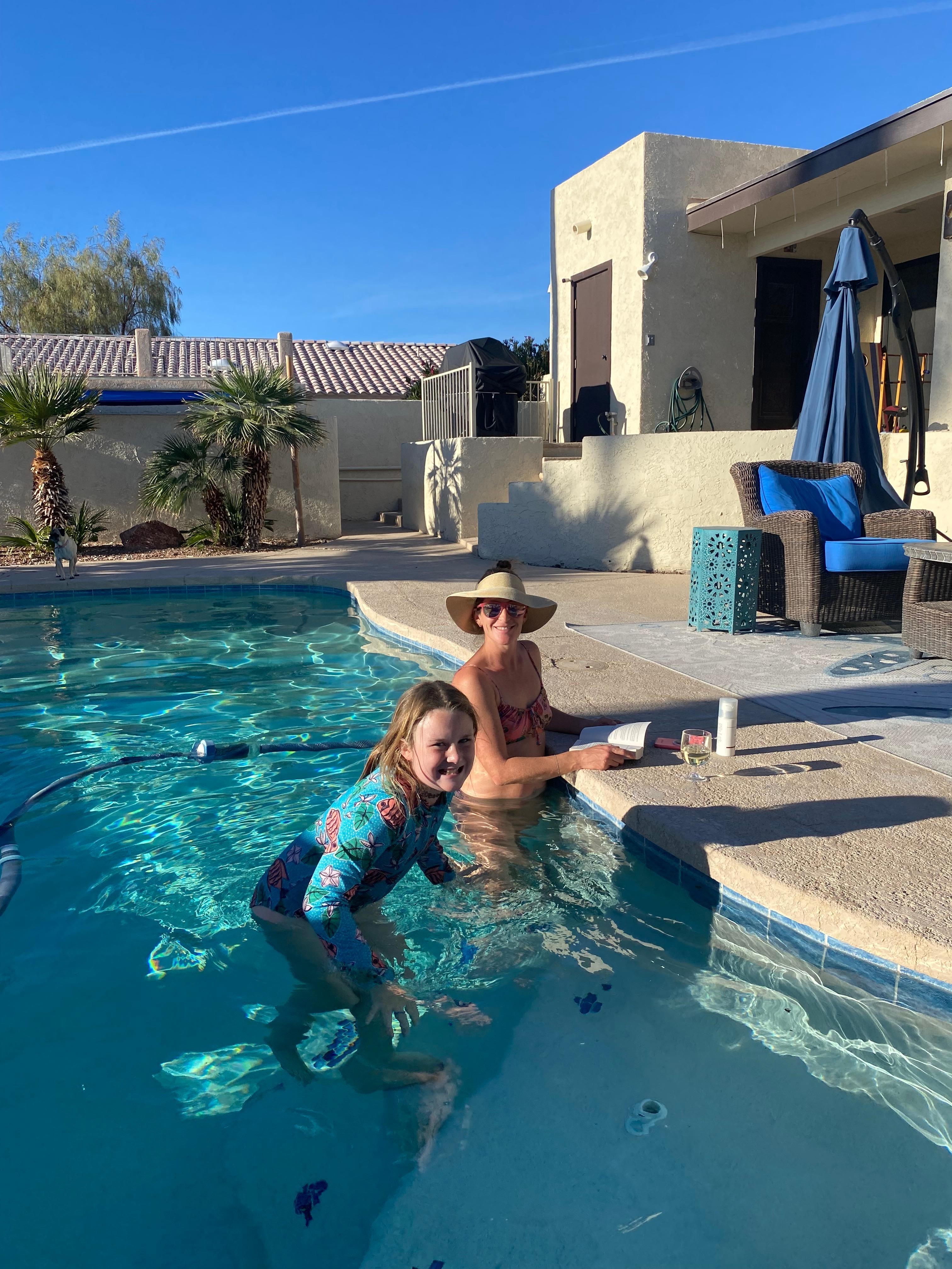 It's great to eat meals on the carpeted and covered patio, cool off in the pool, spend time at the margarita table (in the pool) under the umbrella sipping adult beverages, relaxing on the deck around the pool and in the Jacuzzi at night. The patio has overhead lights, ceiling fans, and speakers for the SONOS music system. We have a backyard kitchen overlooking the pool and golf course that has a natural gas BBQ and a side burner. There is an air conditioned bathroom attached to the house but only accessible from the outside door.