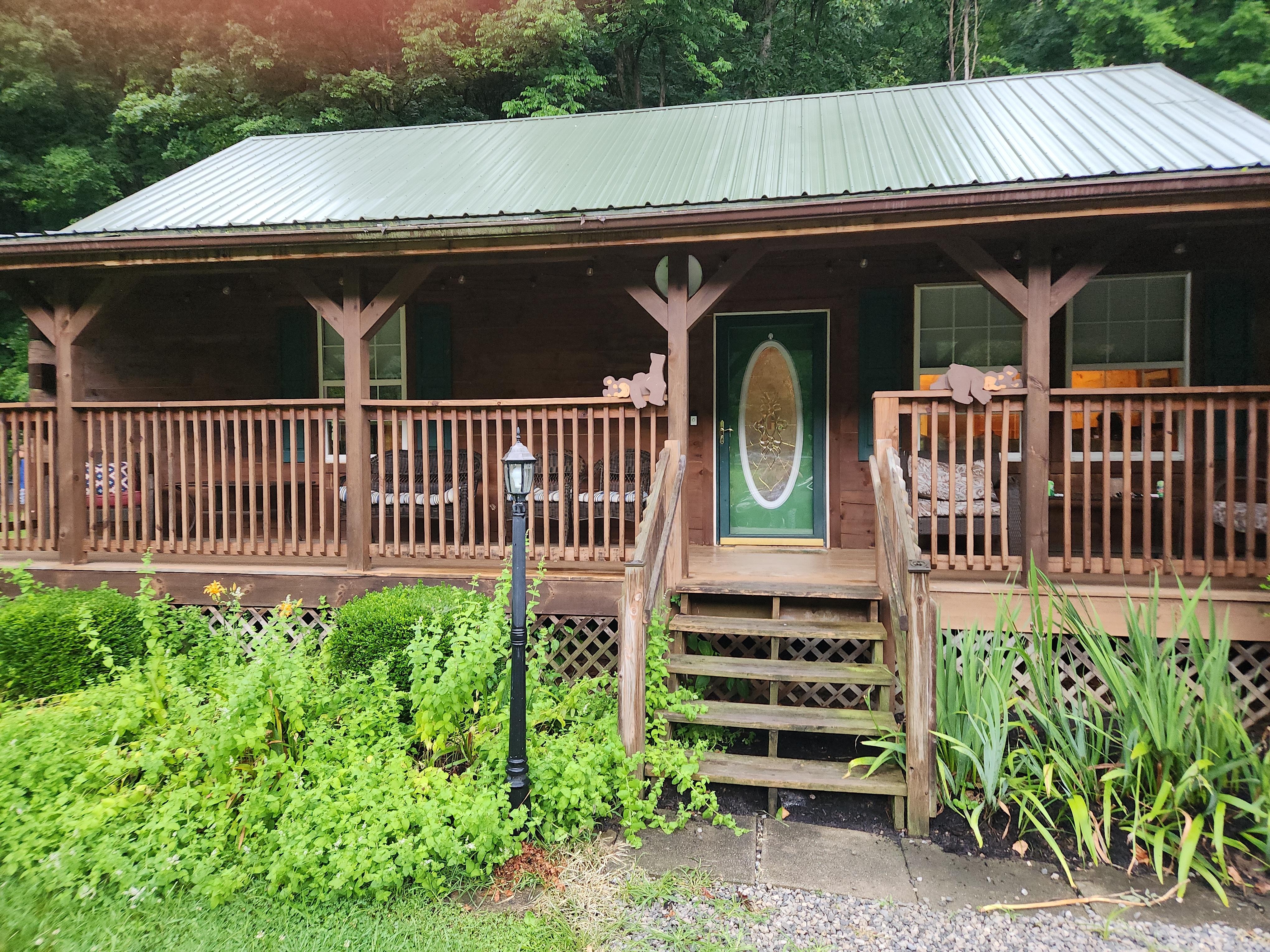 Enjoy the best of both worlds! Our lovingly restored cabin is 15 miles from all of Hocking Hills' beautiful attractions on 2 creekside acres, with spacious porches, yard, fire pit, & hot tub and deck! Just at the outskirts of Laurelville-- half a mile from gas, groceries, diners, parks, & Laurelville Fruit Co. Enjoy the cozy living space with gas fireplace, 55 inch smart TV, puzzles, games, & books. Full kitchen and 4 person dining table for making meals & memories together.