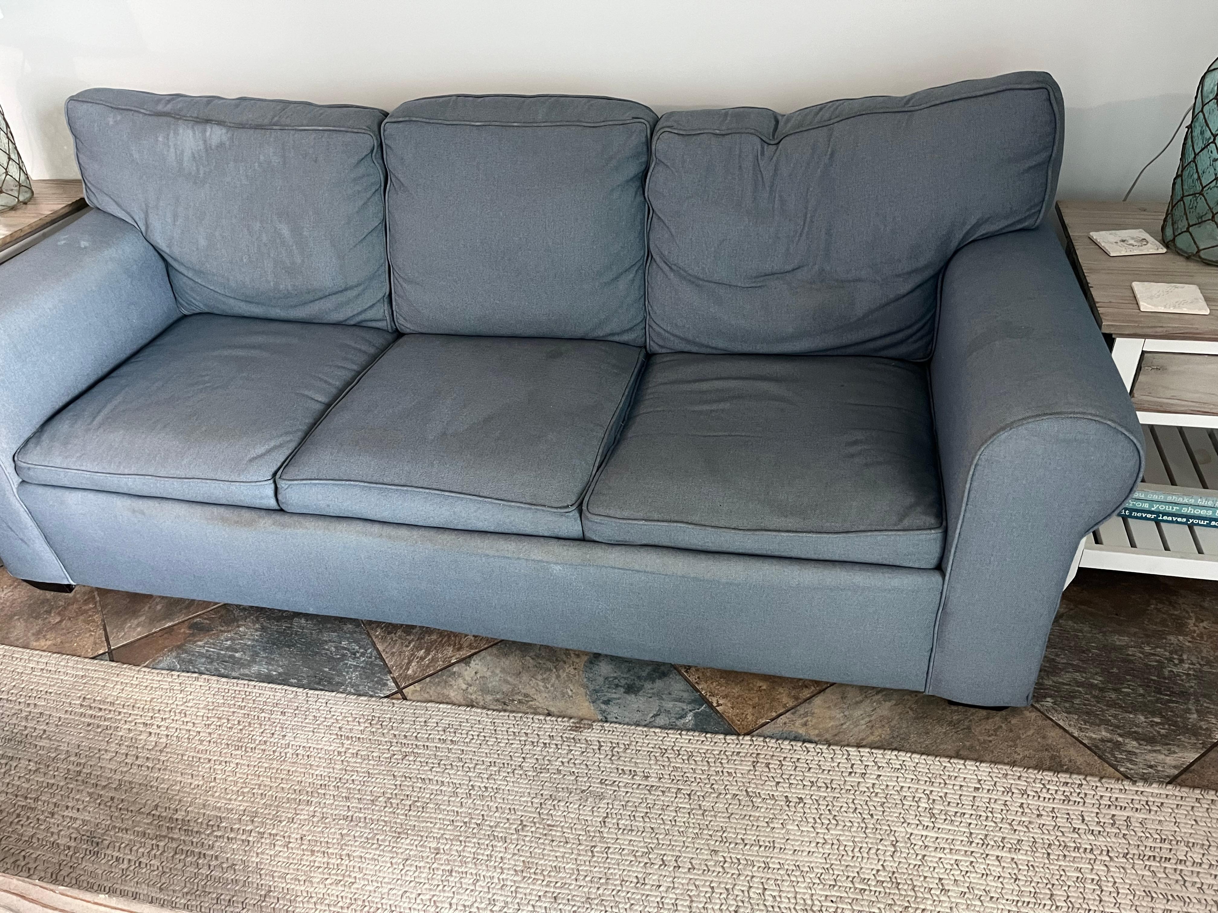 The living room features a pull-out sleeper sofa with room for an additional two adults