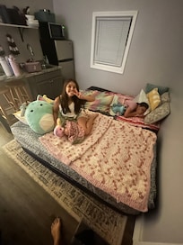 One-bedroom little house with a half bath and living area. Living area has a TV, couch, sink, small fridge, air fryer, microwave and toaster. Basic utensils and linens provided. Outdoor fire pit and grill to enjoy. We have large/very clean individual shower rooms at the park for use.