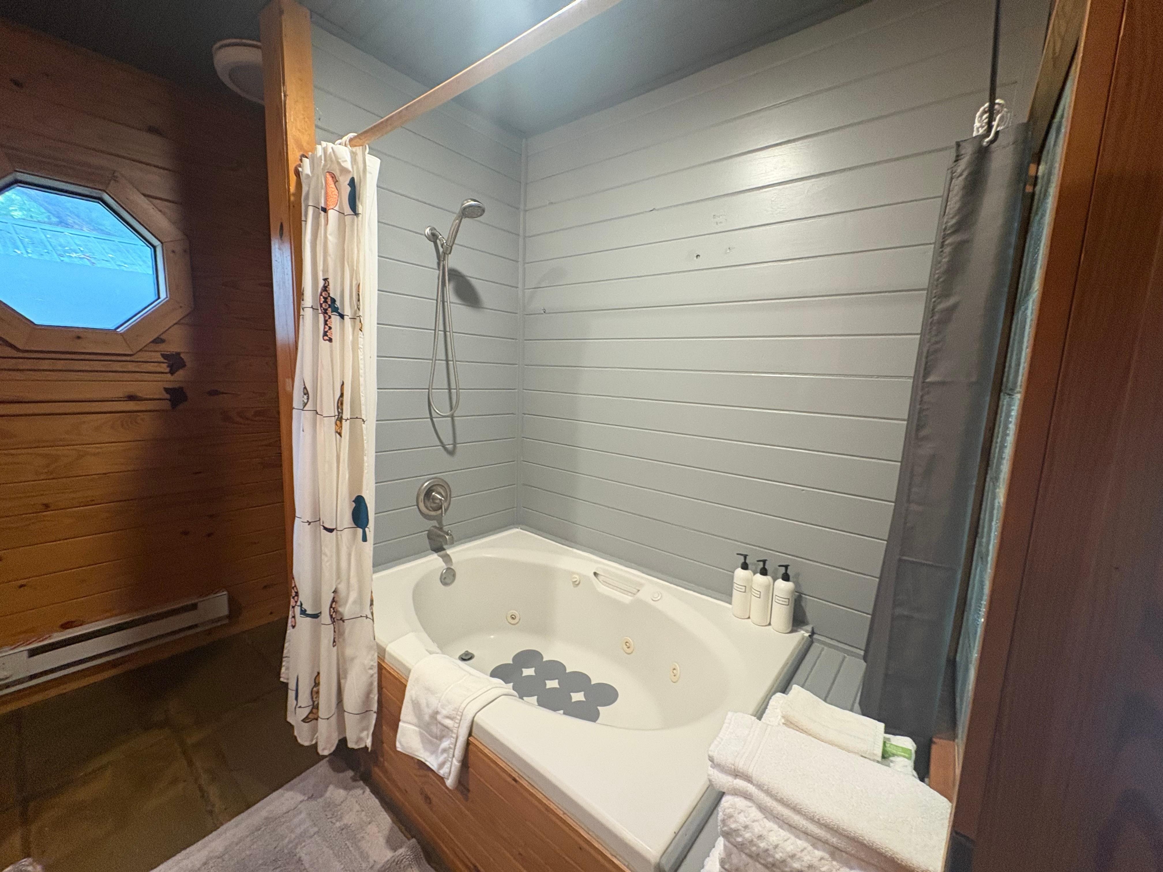 * Bathroom: A full bath with a 2-person deep Jacuzzi tub that also doubles as a stand-up shower