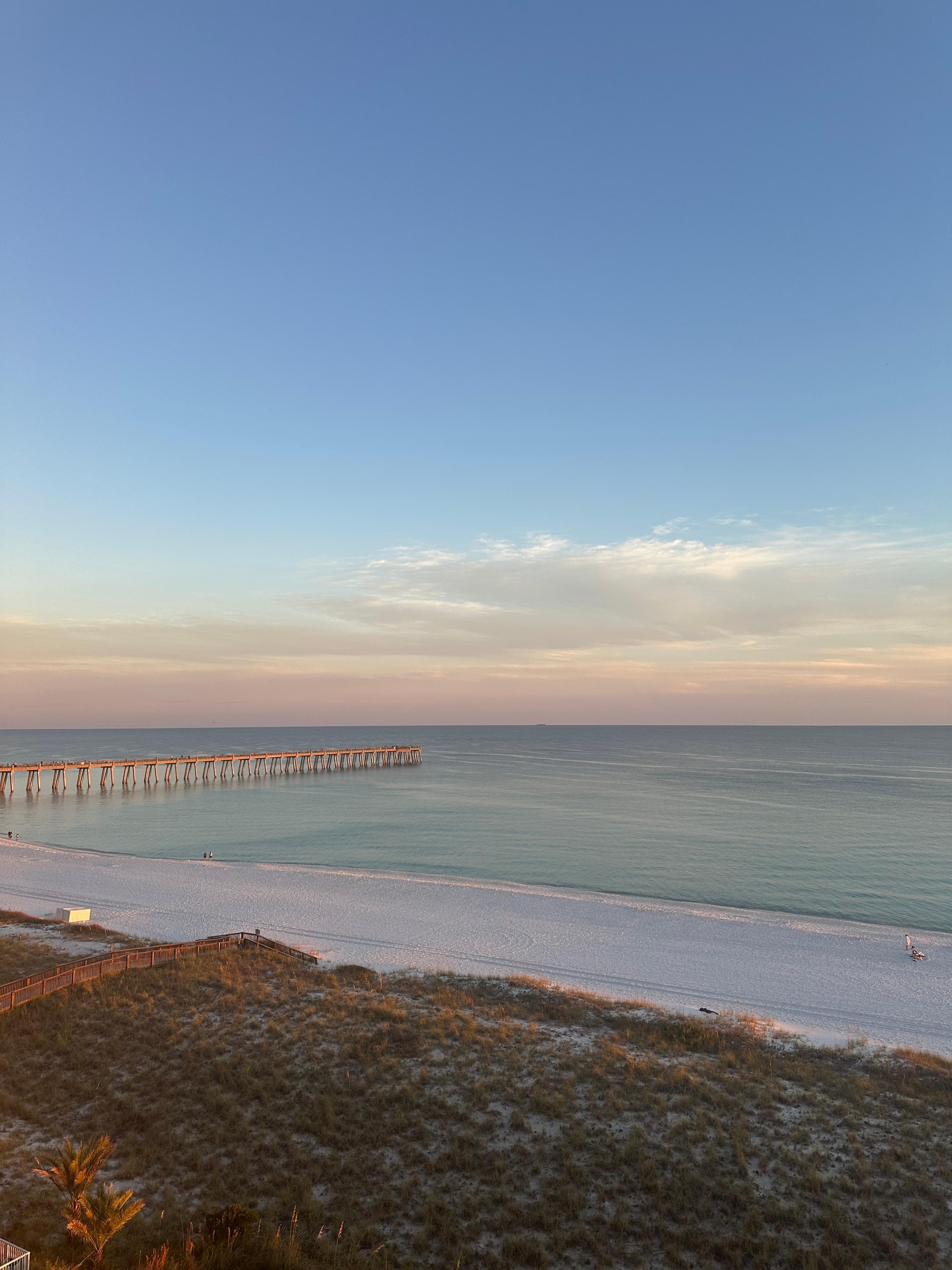 Enjoy a panoramic view of the Gulf of Mexico and the Fishing Pier from the 7th-floor balcony at Beach Colony East, a gated community. Step into Your Happy Place, a 3-bedroom, 3-bath condo situated just off the breezeway. You'll be greeted by impressive ocean views upon walking in. With a beach motif, this unit is designed to be family friendly, with amenities for the young and the more experienced. Covered parking available on site and less than a 5-min walk to the pier and restaurants.