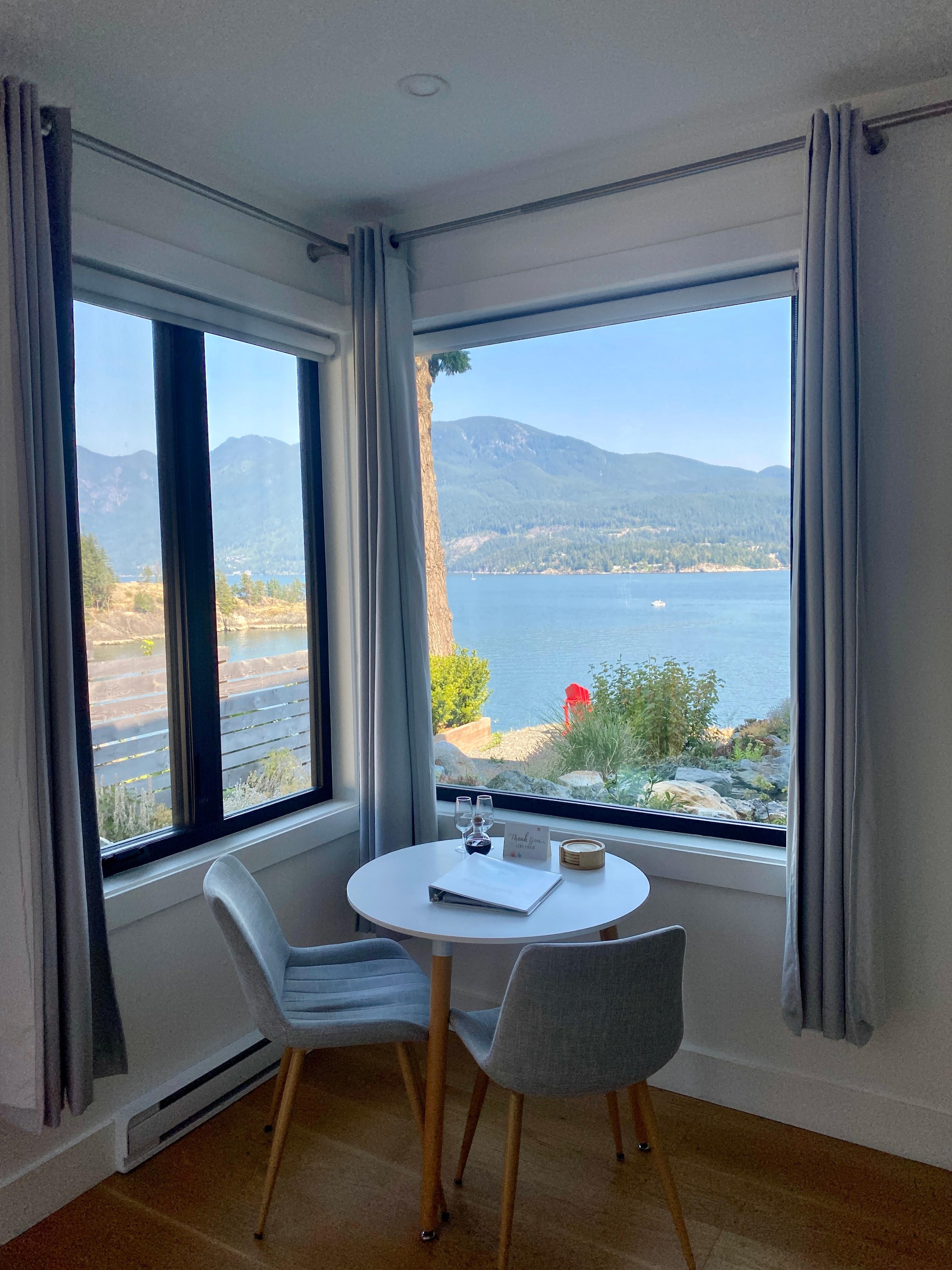 The main house accommodates 4 private suites (Cypress Mountain Suite, Mount Strachan Suite, St. Mark’s Summit Suite, and David Peak Suite). The suites range between 200 sq.ft to 250 sq.ft. Each suite has its own private exterior entrance, king/queen bed, private bathroom with rain shower, heated bathroom floor & heated towel rack, flat screen TV, dining area, and kitchenette (mini fridge, microwave, toaster, Keurig coffee machine, kettle, dishes & utensils). Due to our business license, we're not allowed to provide a hot plate/stove in our suites. The suites have access to three outdoor lounge areas, a shared hot tub, a shared wood barrel sauna, outdoor shower, a lawn games field with BBQ, a staircase to the ocean, and a communal fire pit area. All suites have access to high speed wi-fi and Netflix.