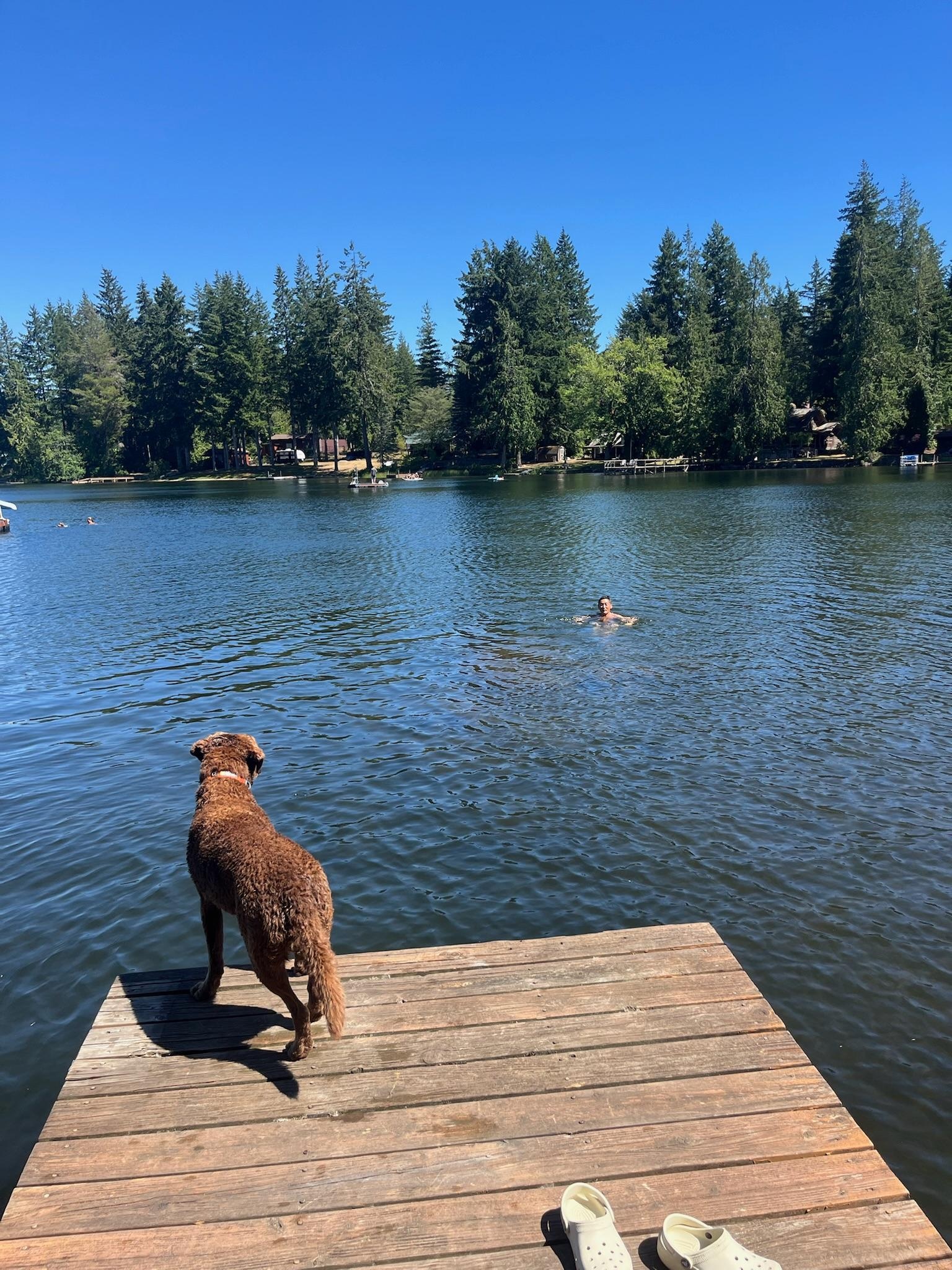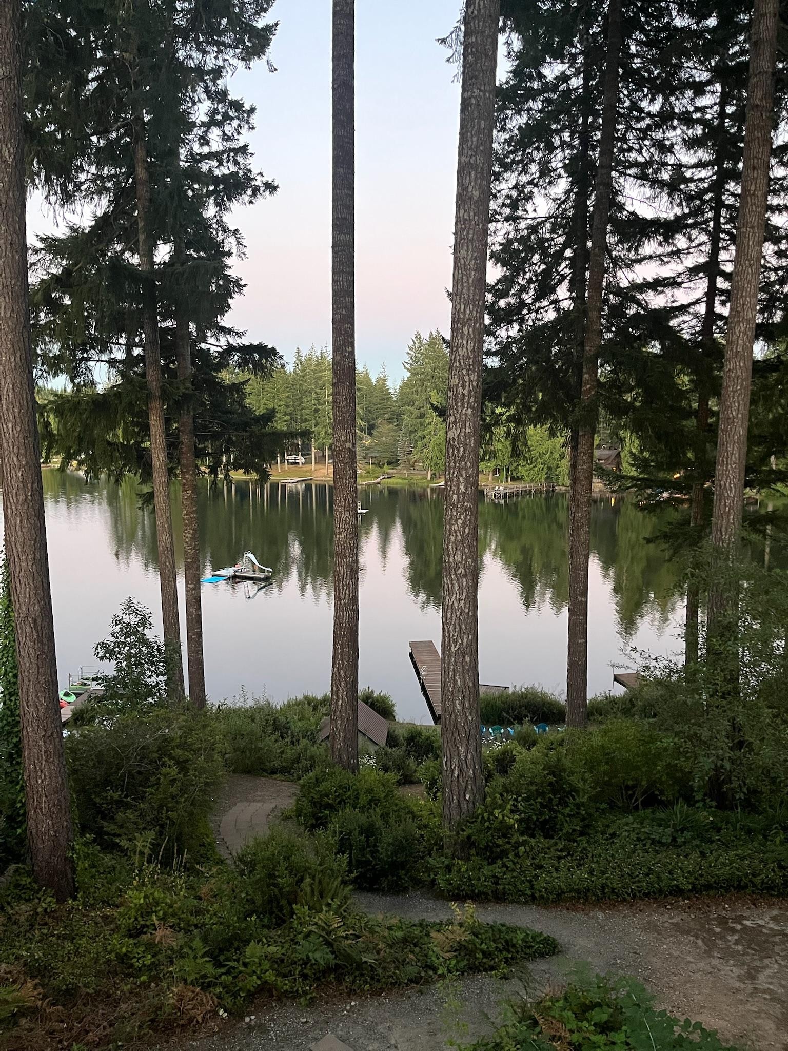 Sip your morning coffee & tea on the oversized deck that is perched above the Lake with magical sunrise views through natural NW landscaping that frames a short nature trail (with steps) to your own private 75’ of no bank pebble beach, dock, picnic table, boathouse (2 kayaks, canoe, raft & floaties supplied). Lifejackets provided.