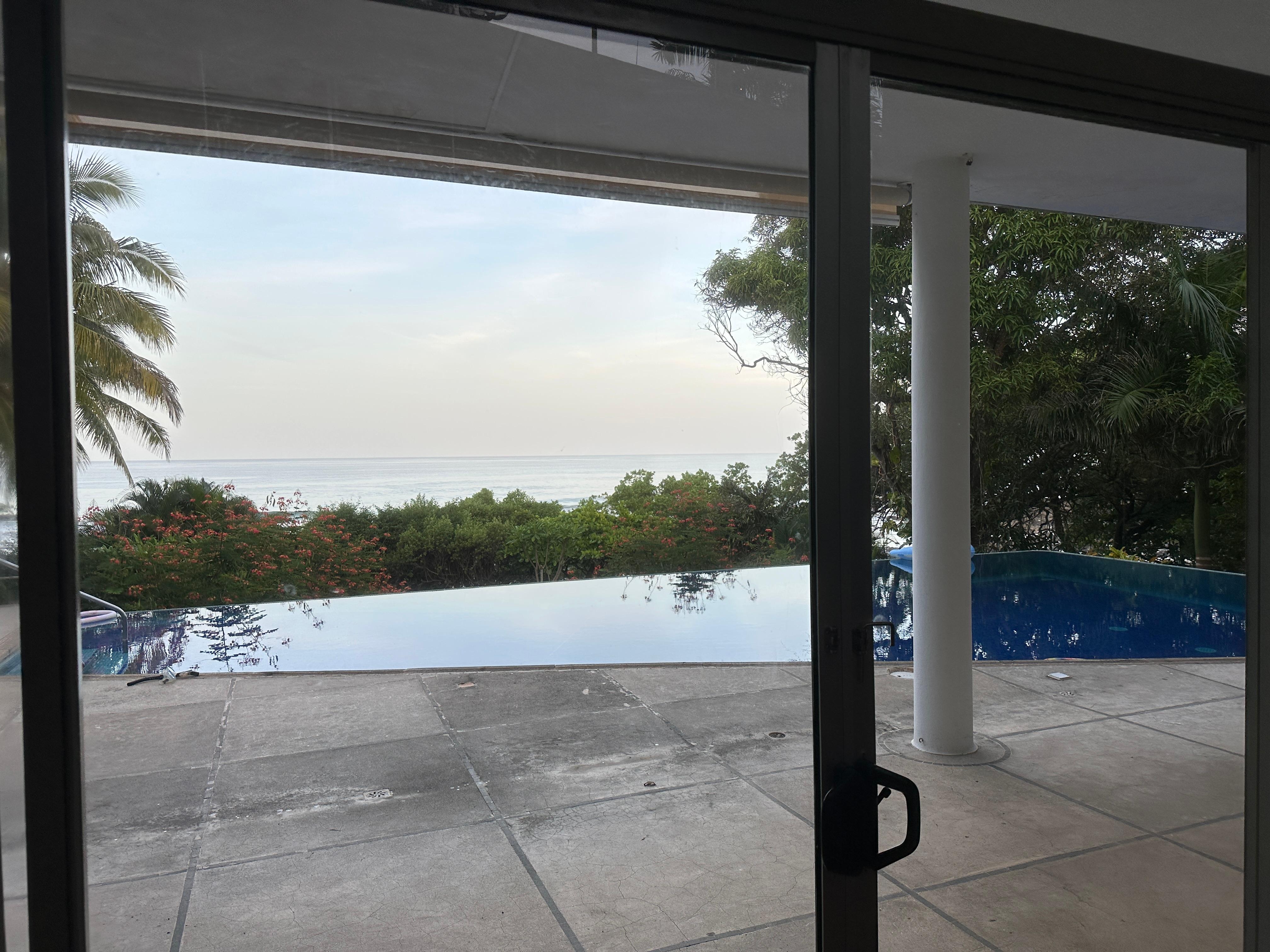 On the same level as the first floor is the pool deck which overlooks the ocean. It features a trapezoidal swimming pool with a double infinite edge plus deck chairs, loungers, table,and grill. Monkeys and birds visit the pool on a regular basis. On the lower level is a gym and ping pong room.