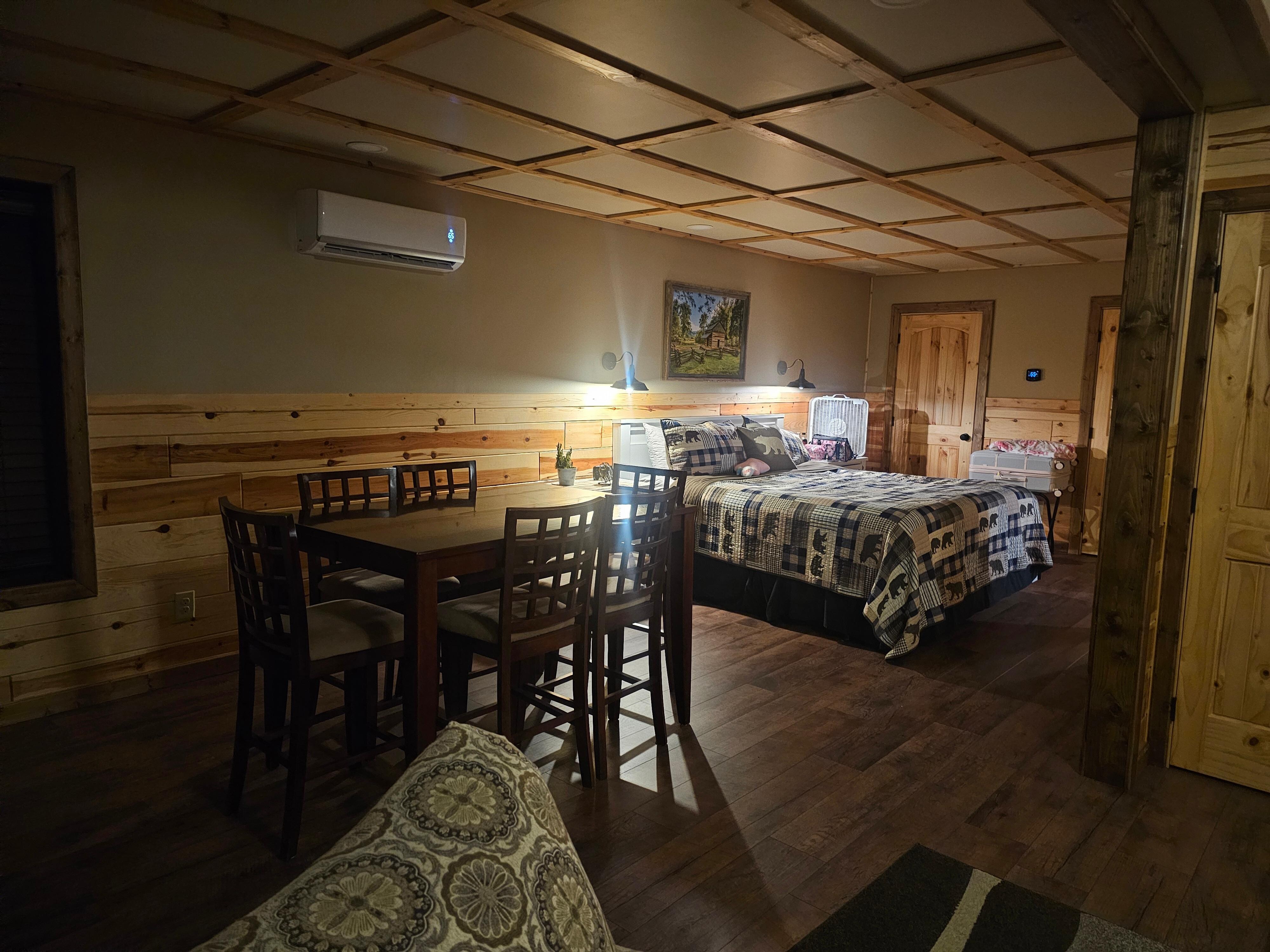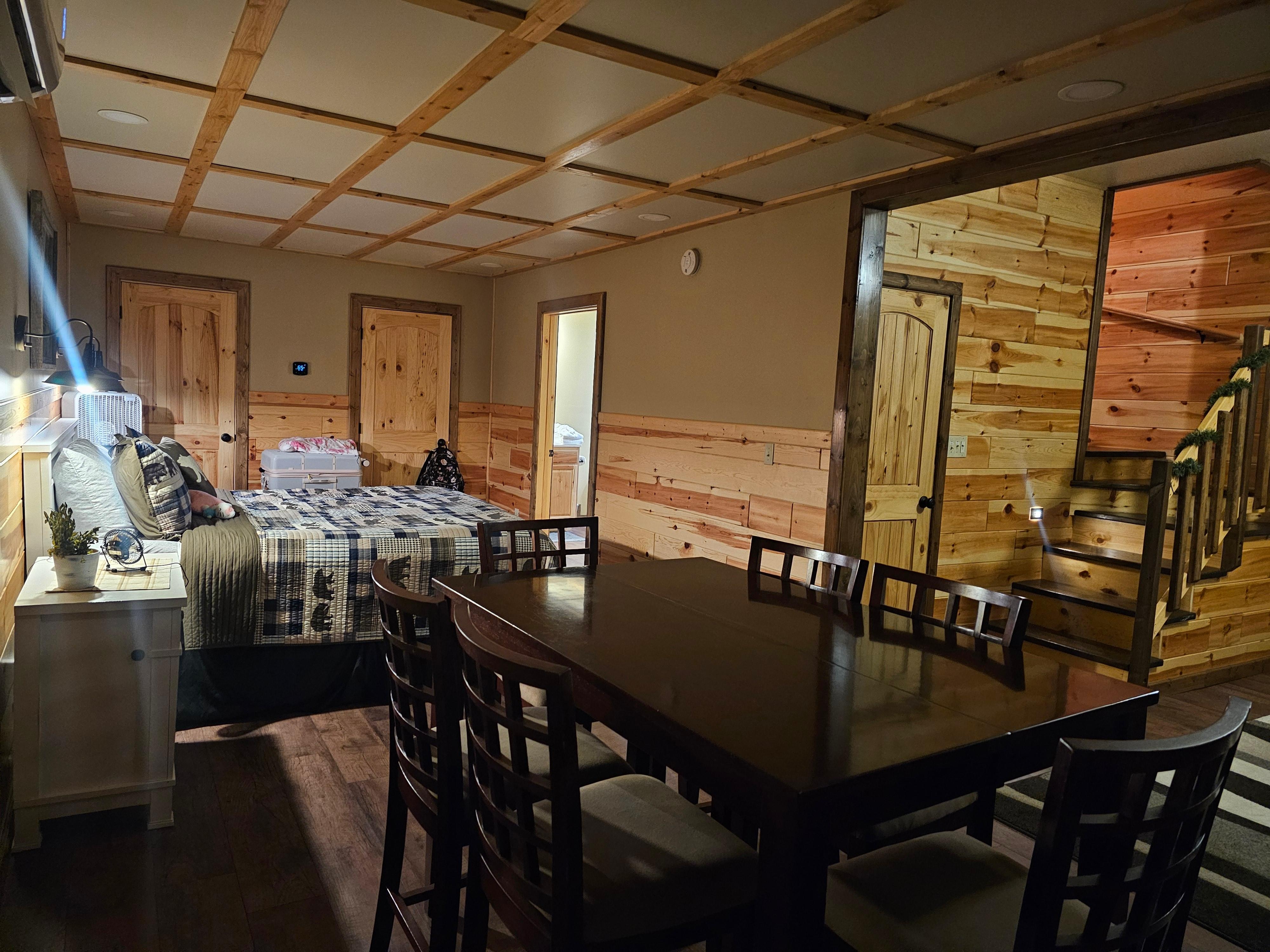 The cabin features 2 bedrooms, 2 full bathrooms, plus a loft with 2 twin beds. The main level features a bedroom with a queen sized bed and a full sized bathroom. It boasts an open concept living room, dining room, kitchen with a loft. The living room has a Smart TV so log into your favorite app or enjoy free YouTubeTV during your stay. The upstairs loft opens to the living room and features 2 twin sizes beds, a perfect space for the kids! The lower level features an open concept living area and offers a sitting area with adjoining king sized bed as well as private access to a full sized bathroom. The bathroom features a walk in shower, vanity, and a full sized washer and dryer.