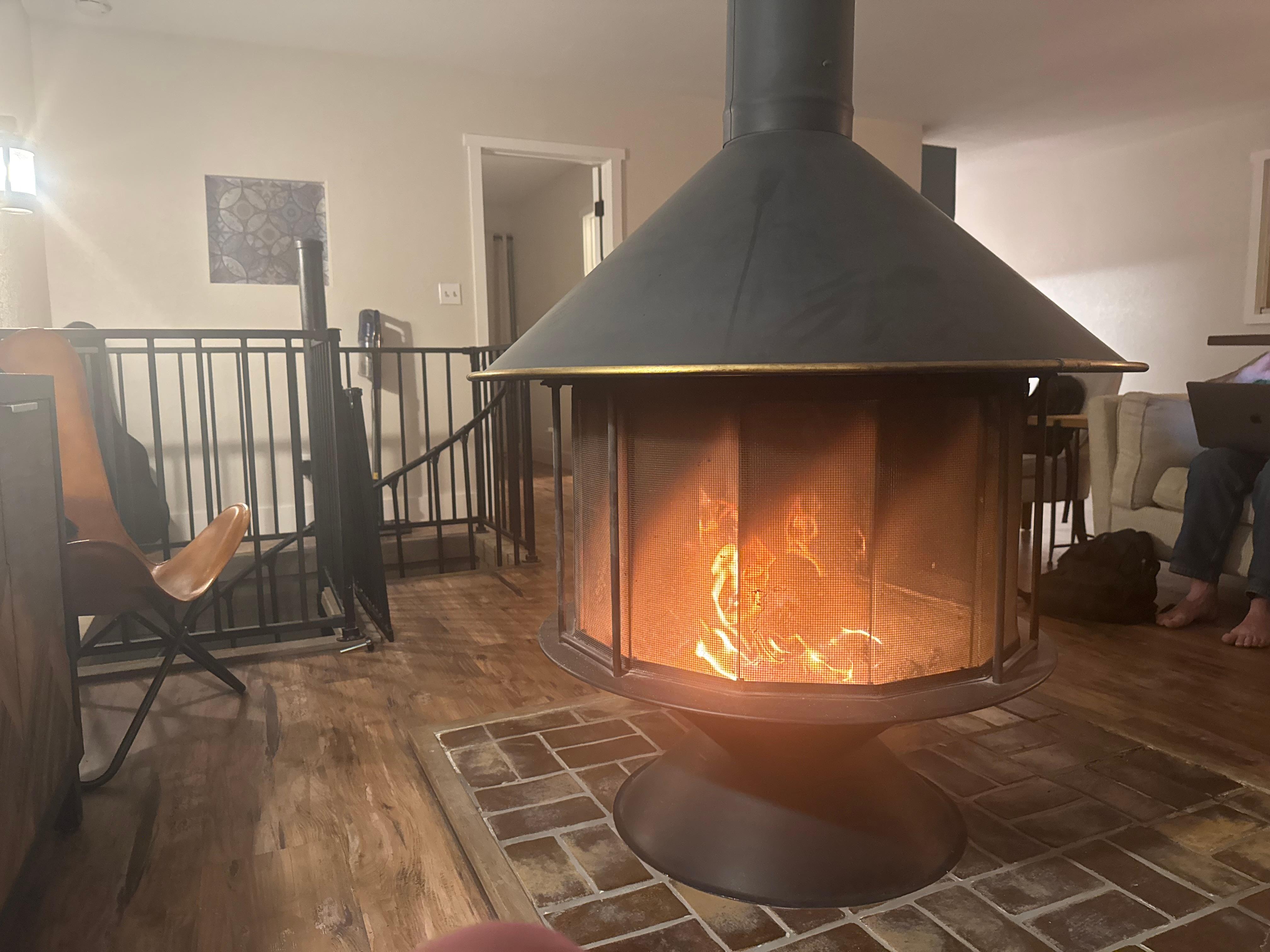INDOOR LIVING: Smart TV w/ cable, open floor plan, fireplace, dining table, island / bar seating, convertible couch, modern finishes, ample food and gear storage, and wood-burning stove.