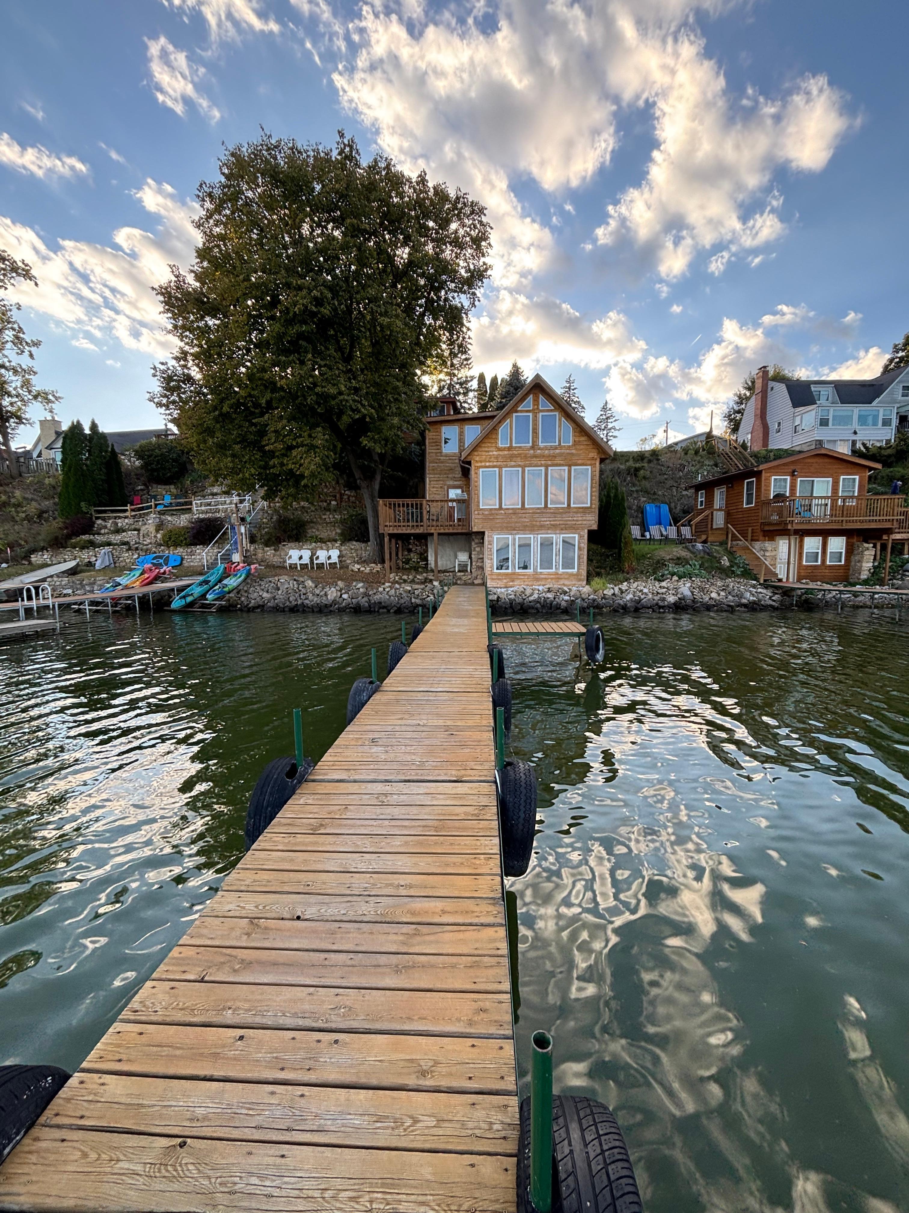 Bring your boat! There is a long pier right out the door that provides bumpers for tie up. The boat launch is 5 minutes away. Gas and bait are also close. For our guests only, we rent a 9 person pontoon boat, 6 kayaks,4 single and 2 doubles, 4 paddleboards, and a peddle boat. As we don't have a sandy beach, most everyone swims off the end of the pier and swim raft. The lake bottom is rocky or sandy. No drop offs or muck. We have other size lake cottages for rent. Call any day 8-6. No pets are allowed. This is not a party house. No bachelor or bachelorette parties.