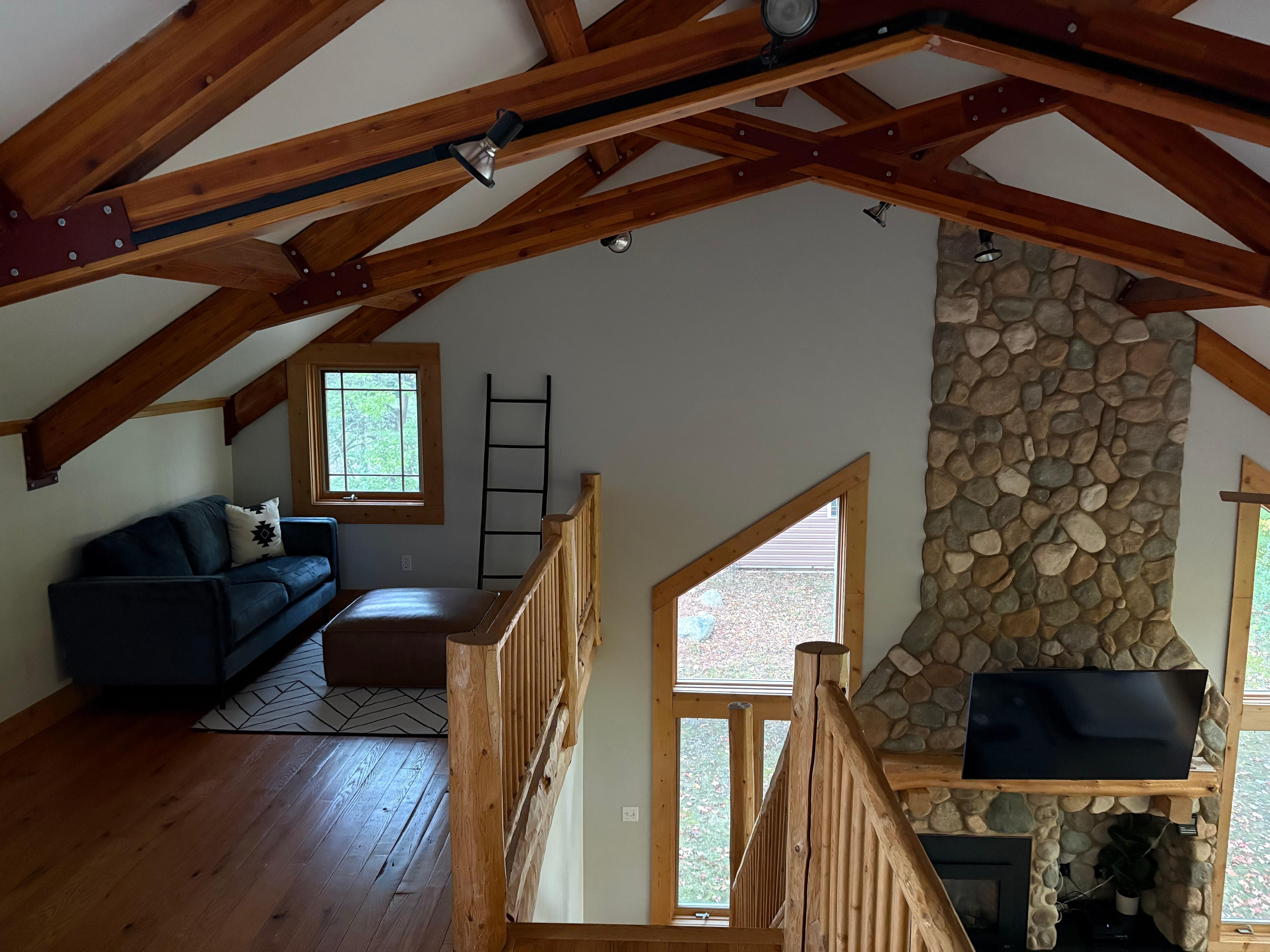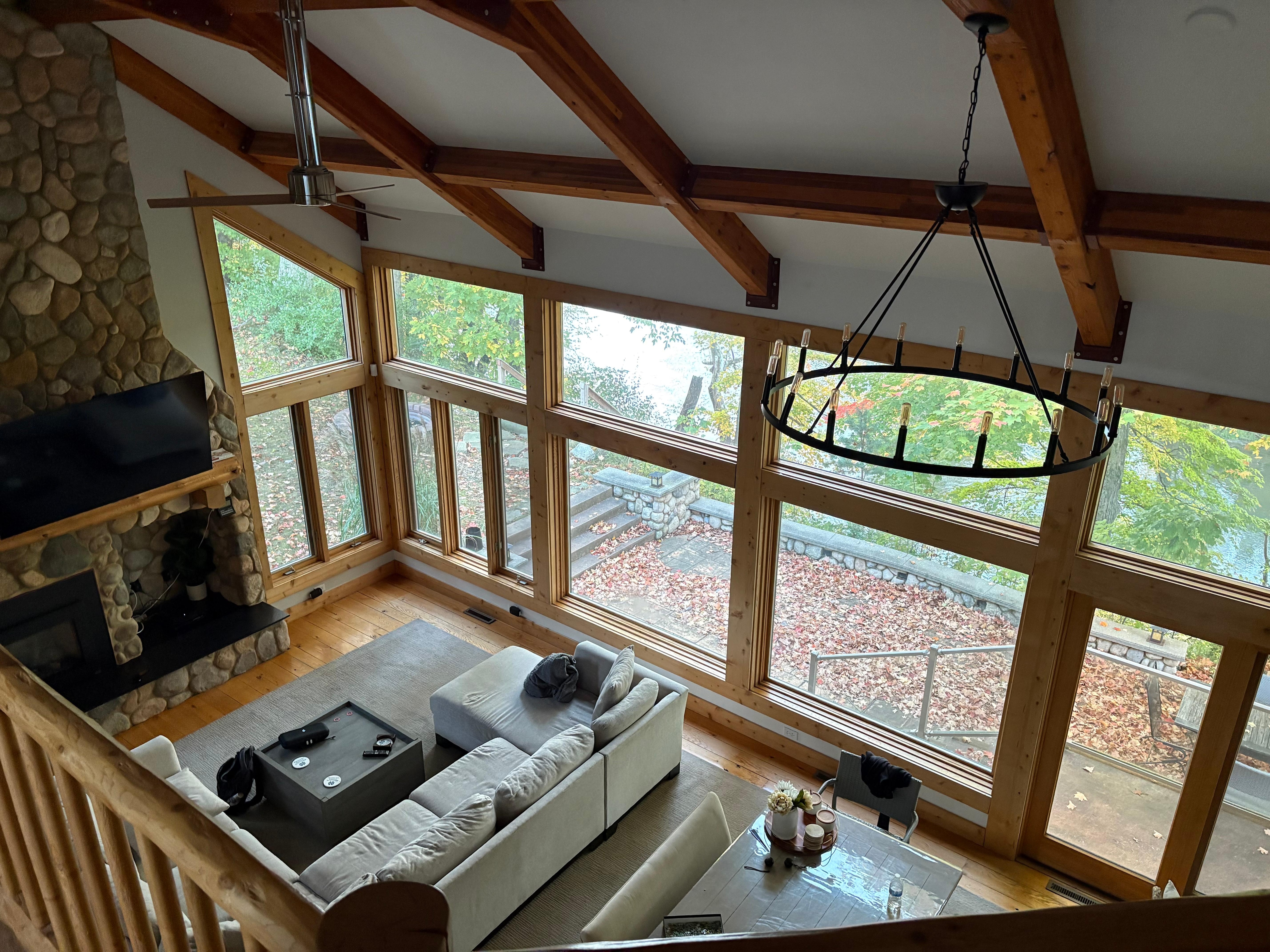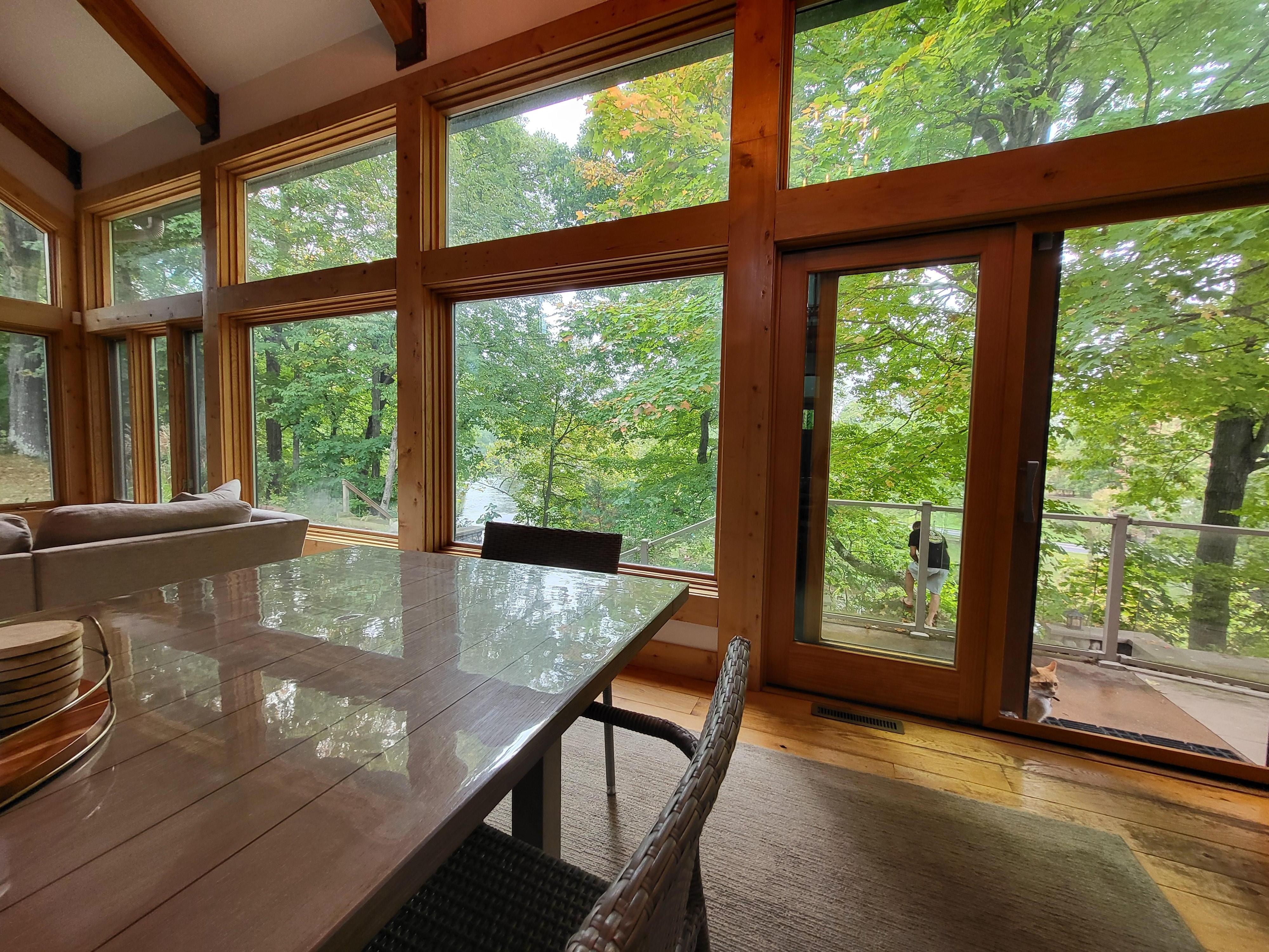 Nestled on a cliffs edge overlooking the bend of the Thornapple River near Alaska, MI our home has modern finishes including exposed beam trusses in the living room and an amazing river view patio out back.