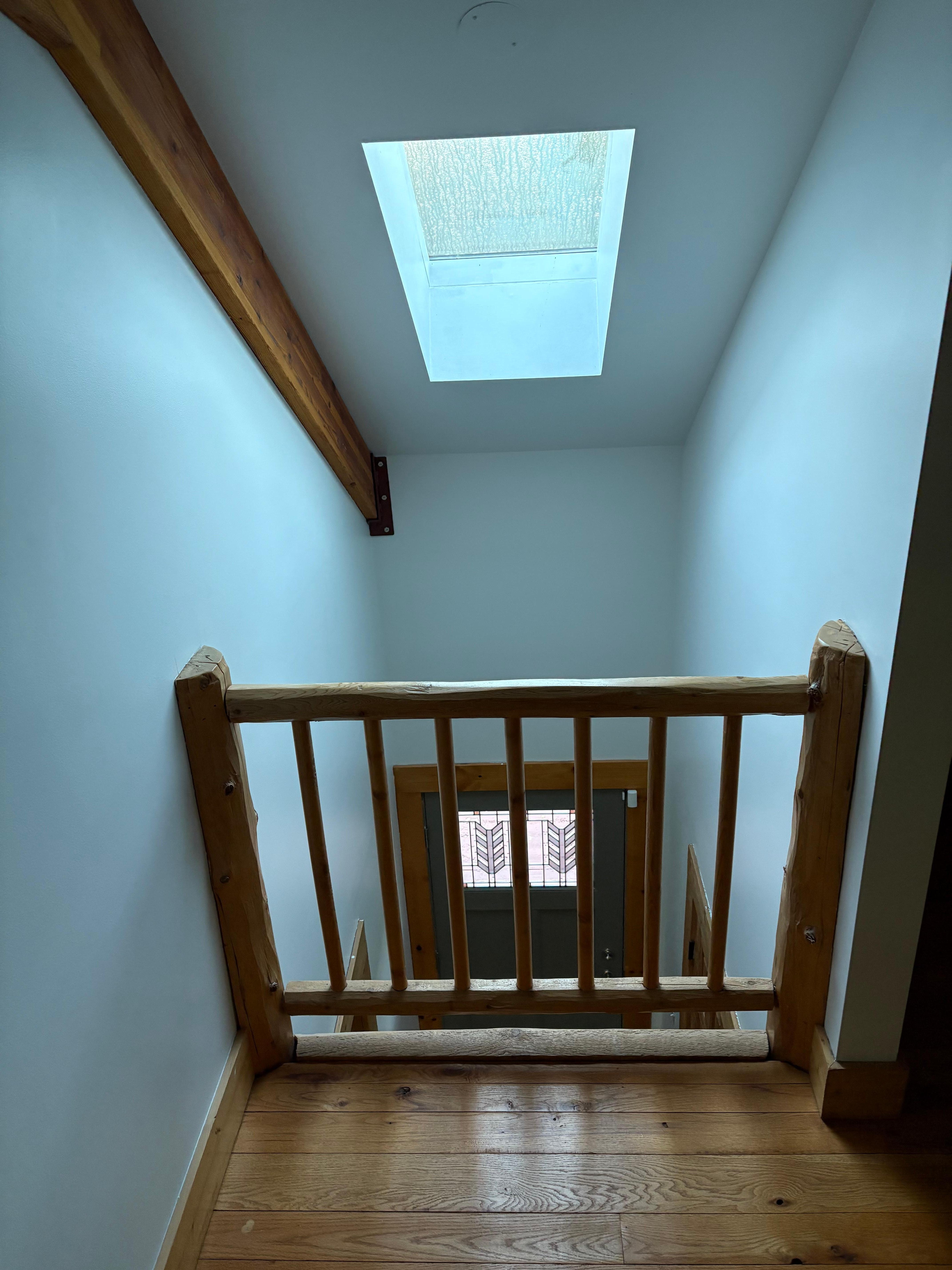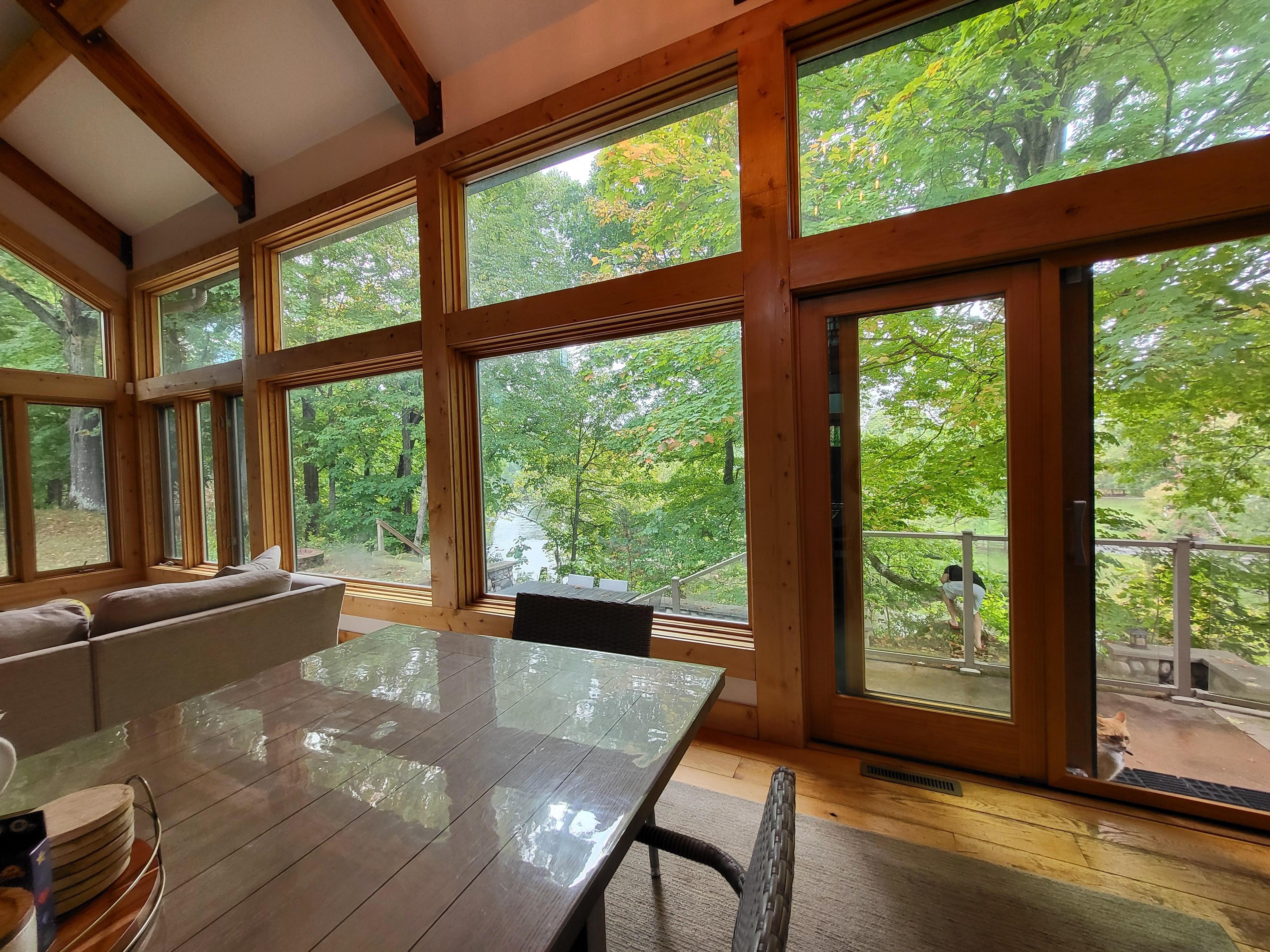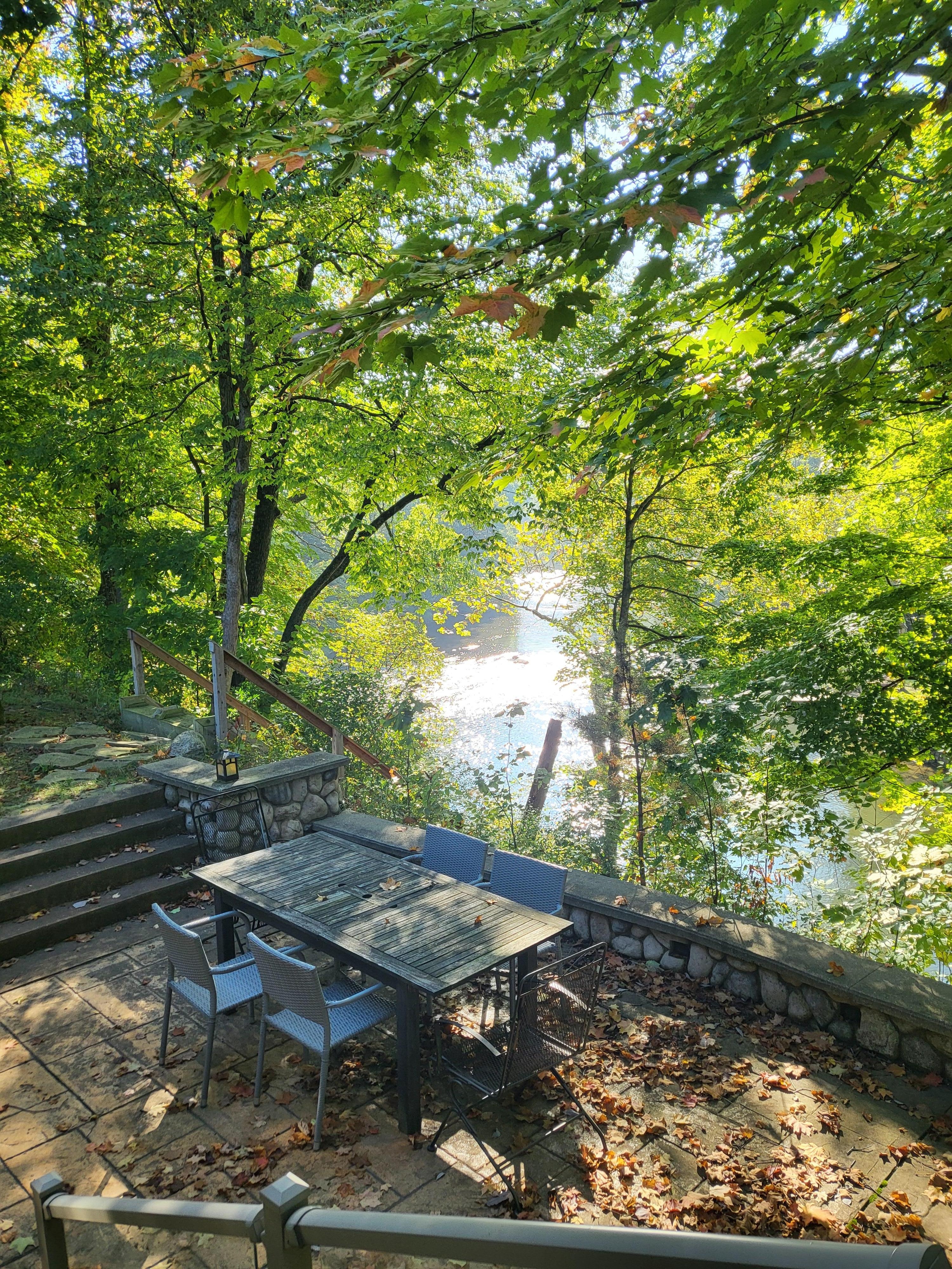 Nestled on a cliffs edge overlooking the bend of the Thornapple River near Alaska, MI our home has modern finishes including exposed beam trusses in the living room and an amazing river view patio out back.