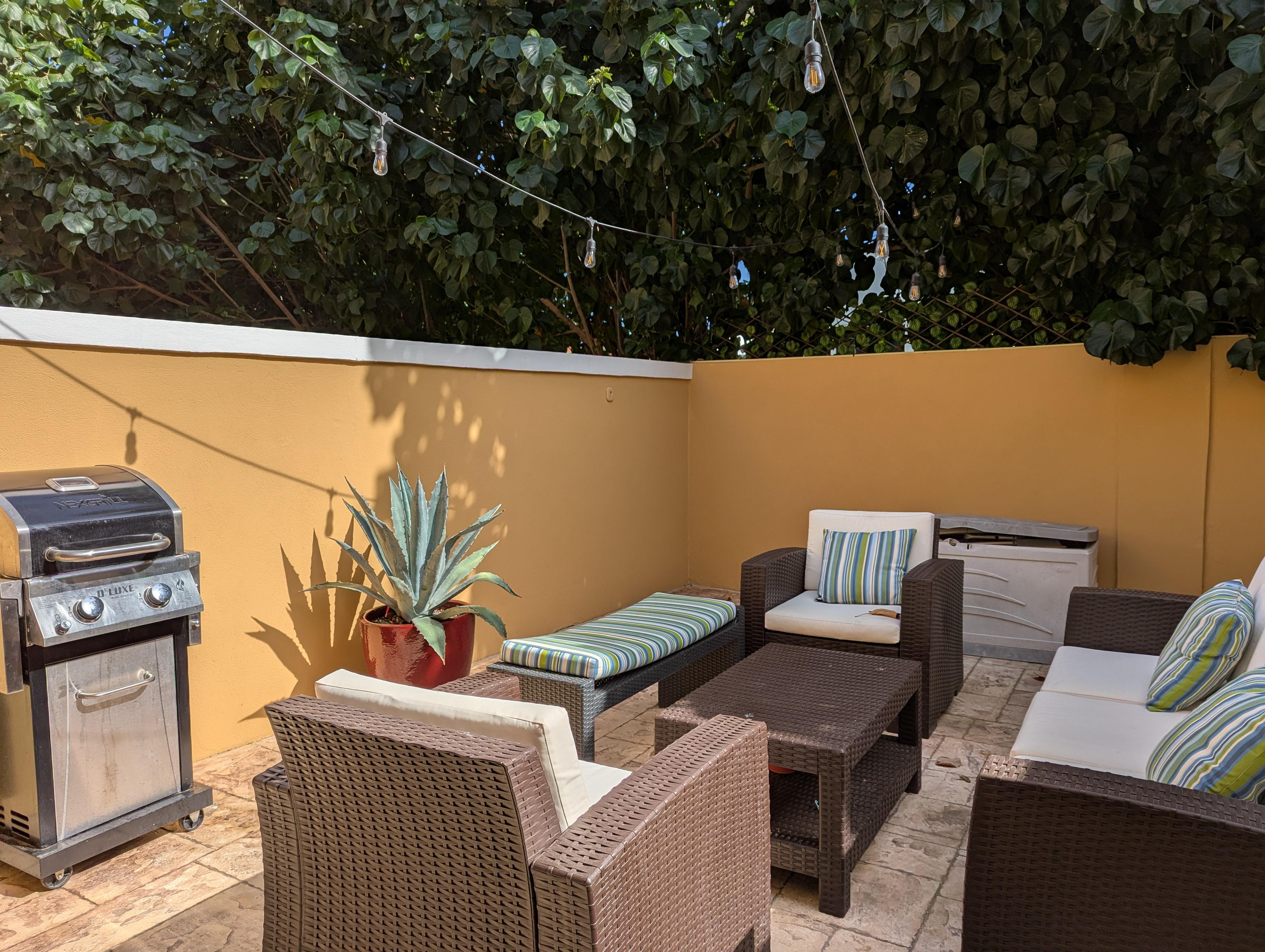 This Cozy 2 bed/2.5 bath Townhouse is a corner unit located in the famous Gold Coast Aruba Residence which is located right across from the prestigious 18-hole golf course in Aruba and a 3-minute drive to the Boca Catalina Beach and the Famous Tres Trapi Beach. Light House. This attractive rental property is fully furnished, and equipped with the latest energy-saving state-of-the-art appliances. It features; high-speed Internet, a cozy backyard with a BBQ grill with gas, and beach chairs for your convenience. 24-hour security, fully gated, clubhouse which features a well-equipped gym, food & beverage facilities, 3 community pools, tennis courts, and much more!