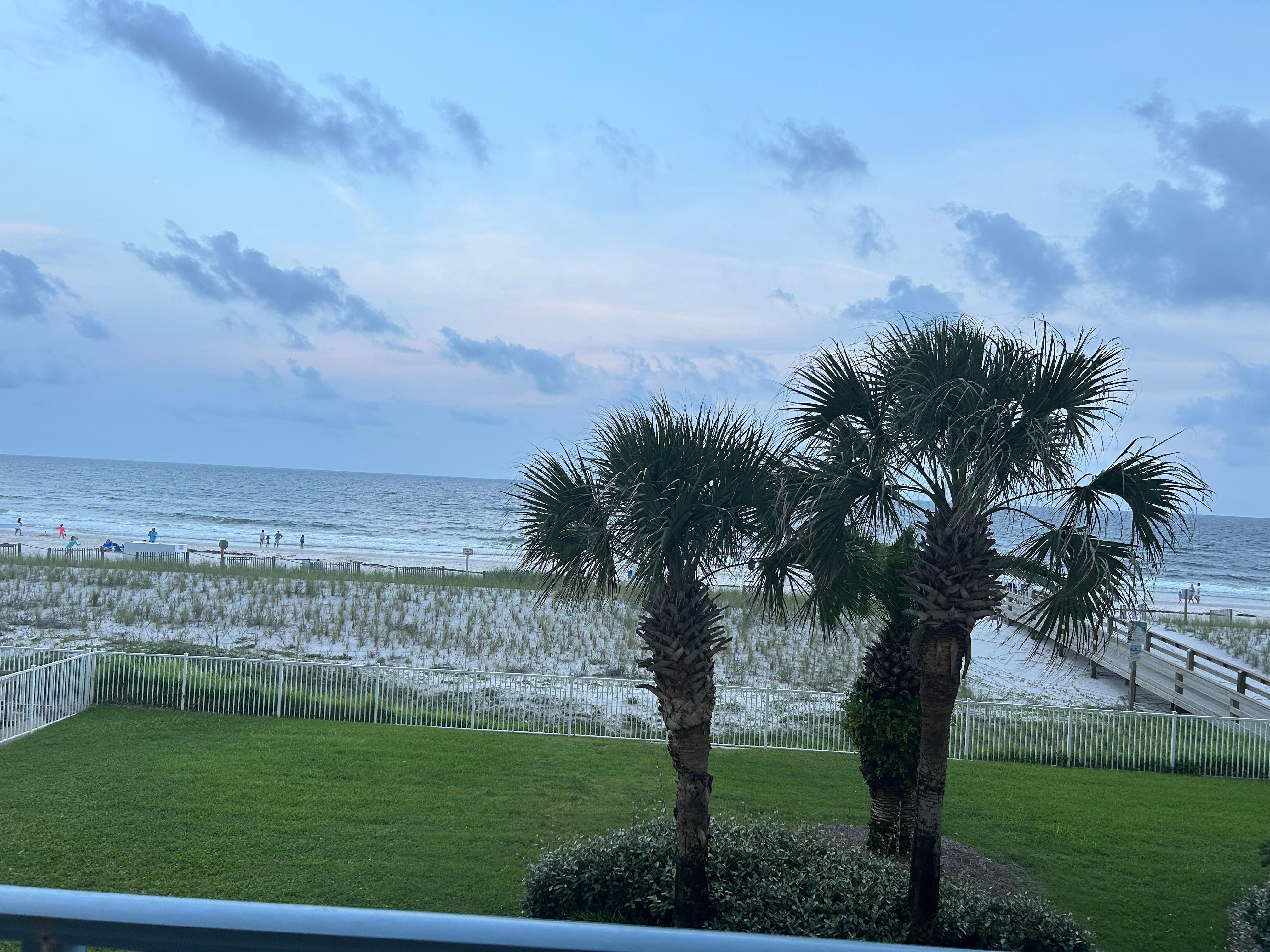 This immaculate and spacious corner condo on the 2nd floor consists of three bedrooms, each with its full bathroom. The tiled balcony features a balcony height table and four chairs with additional seating available. The living room includes a sleeper sofa, while the master bedroom boasts a king bed. The second bedroom has a queen bed with French doors opening onto the beachfront balcony, and the third bedroom offers two twin beds.