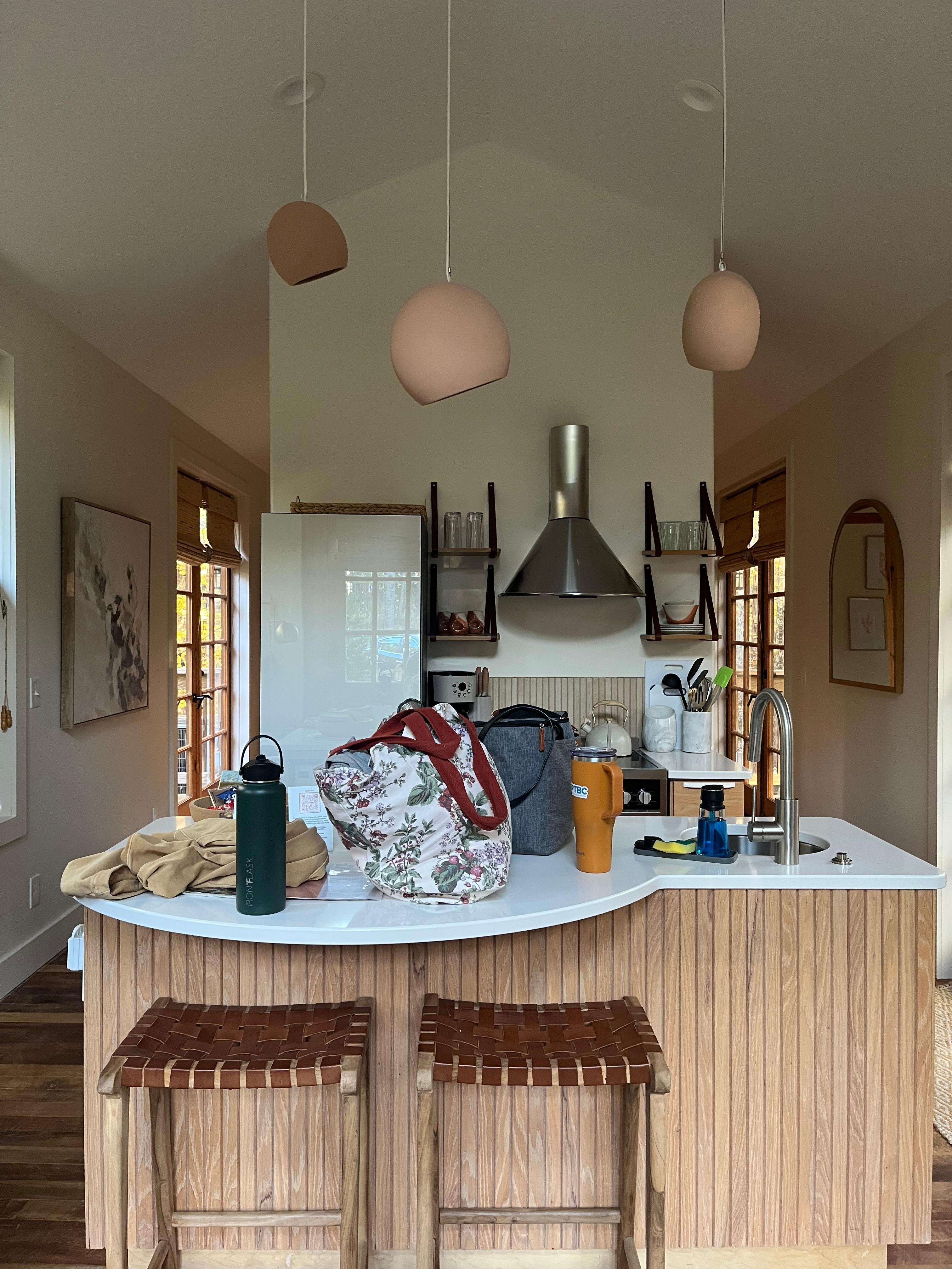 The kitchen isn’t just cute—it’s stocked and styled for real meals and good vibes. There’s a curved island perfect for two, custom mugs and dishes, and all the coffee gear you’ll need (French press, drip pot, organic beans—ground *and* whole). High-end appliances and a charming pantry make cooking feel like a treat, not a chore.