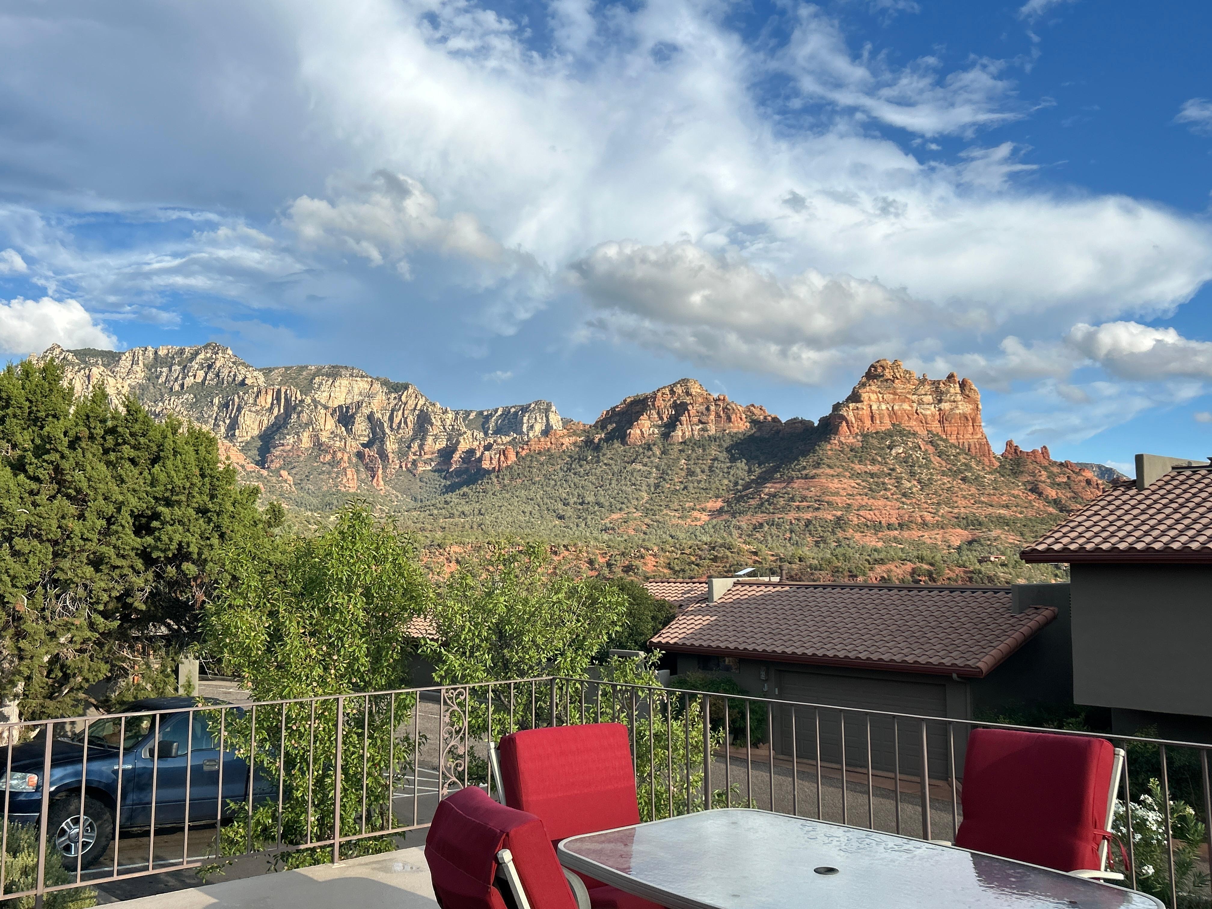 Welcome to Vista Ridge Sedona and our Mountain View Cottage - Our beautiful 1,150 sq.ft. 2-bedroom 2-bathroom Mountain View Cottage is conveniently located in the Uptown district of Sedona. This home is comfortably suited for 4 guests. Enjoy daytime red rock views and starry night skies. A fully furnished outdoor patio offers space to dine and lounge and enjoy the splendor of the Arizona high desert with Sedona’s renowned red rocks as the backdrop. Enter the home into a colorful living space with vaulted ceilings and large view windows. Relax in the cozy living room with fireplace ambiance, take in the views of the famous Sedona monuments, and venture to the spacious outdoor patio with pergola where you can entertain outside, surrounded by red rock views, with a gas grill and firepit. The kitchen is fully equipped with knotty alder cabinets, stainless steel appliances, gas cooktop & stove, wine fridge, and dining area. The primary bedroom has views of the red rocks, a King bed, ensuite bathroom with luxury Body Bliss bath and shower products, and a convenient laundry space. The large guest bedroom has a luxury King size mattress and TV. The hallway bathroom has a tub and shower combo. A rollaway is provided in a bedroom closet for a fifth guest if necessary. This is a non-pet and non-smoking property.