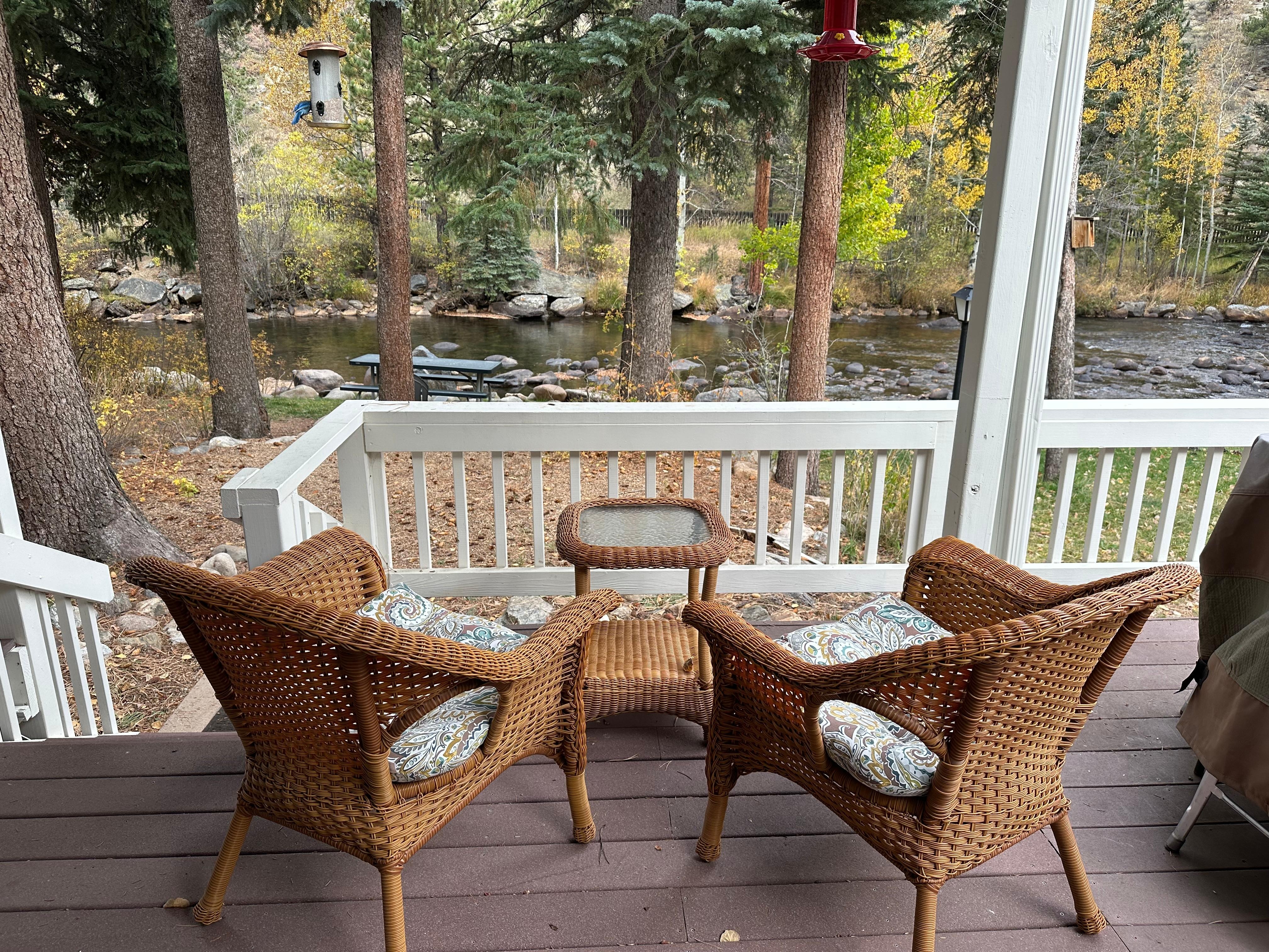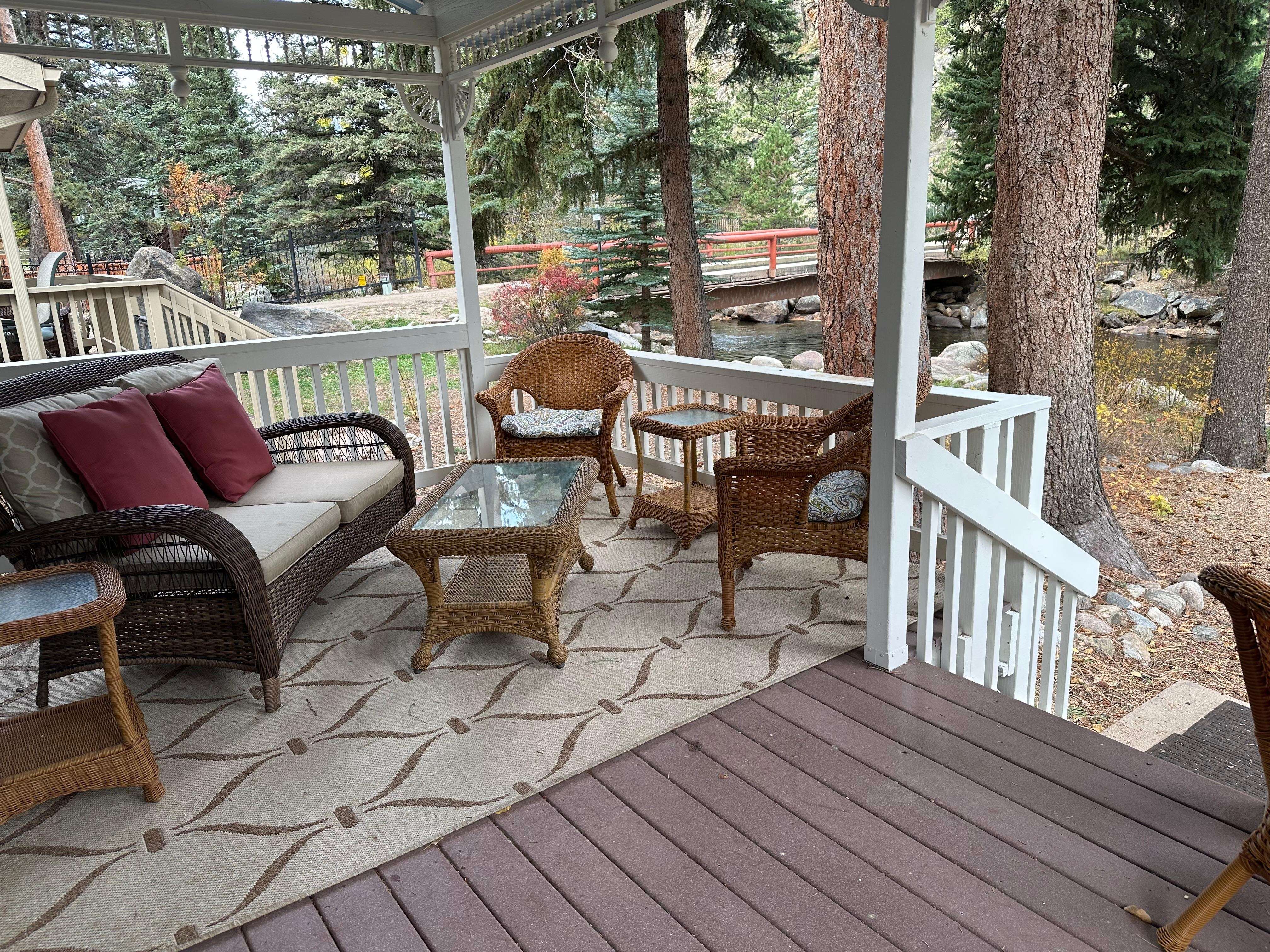 This mountain getaway offers rest and relaxation as well as adventure right at your fingertips. You can enjoy your morning coffee or happy hour drinks while listening to the rushing river from the spacious, wrap-a-round deck. At some point, you will even want to snuggle up with your favorite book, sip a warm cup of tea, and relax by the fireplace with open windows so you can hear the river as you drift away! You will not want to leave; turning your vacation into a staycation! You won't be disappointed! It will be one of the highlights of your stay in Estes Park, Colorado. **Please note there is a Ring camera located at the front door as well as one near the garage. Please do not move/tamper with. Thank you).**