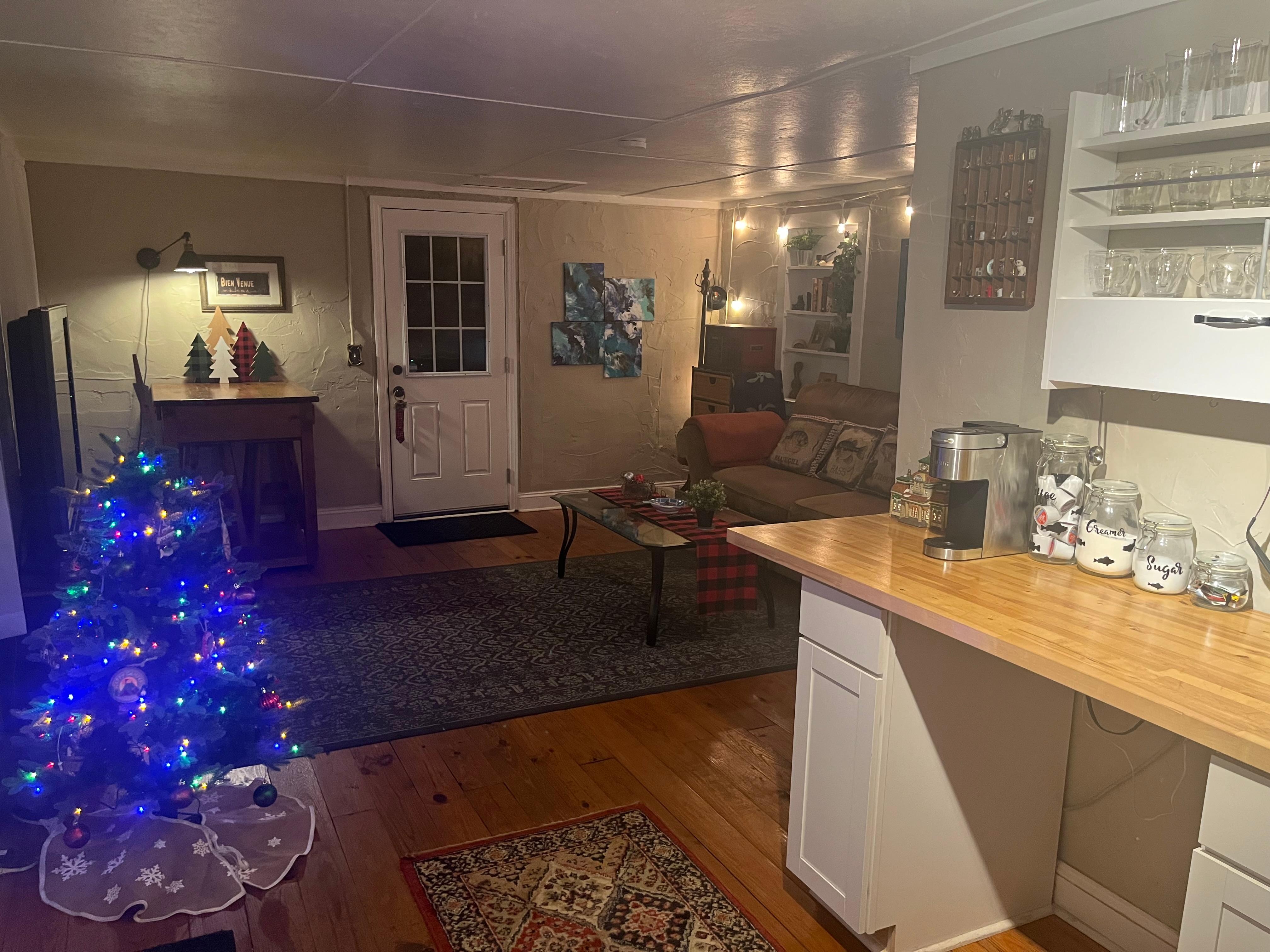 Everything was just as it was pictured on the website. I’m a clean freak and was very impressed with the cleanliness of the cabin upon arrival. The cabin was stocked well with K-cups for morning coffee, a snack basket was a nice surprise, we had plenty of linens and toiletries there was a great album collection I enjoyed going through and a phonograph available to spin vinyl. Books, board games and cards were available. The table and chairs on the porch were perfect for morning toast and coffee. It was a very tranquil and relaxing getaway which was much needed. Courtney was fantastic at communicating all the information we needed prior to arrival. The cabin was even decorated for Christmas which was just an added plus. LOVE the Mickey and Minnie lighted snow globe.