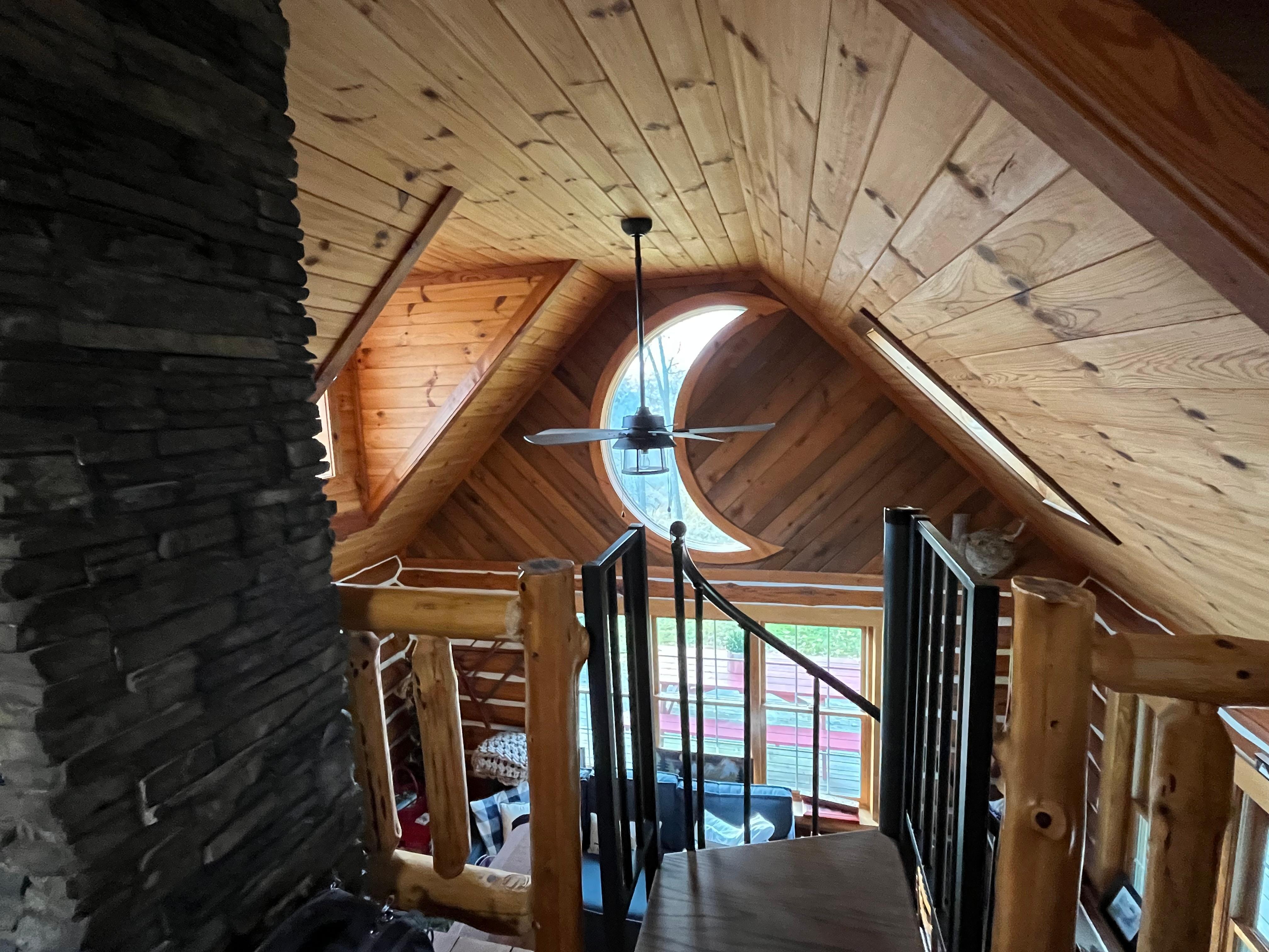 Retreat to our Rustic Cabin, nestled atop a serene 20-acre mountaintop, providing the ideal escape from the daily grind. This enchanting cabin is a testament to exquisite handmade craftsmanship, boasting all-wood logs and reclaimed barnwood floors and ceilings that radiate rustic charm. The living area is anchored by a magnificent stone wood-burning fireplace, perfect for unwinding with a glass of wine.